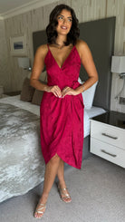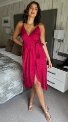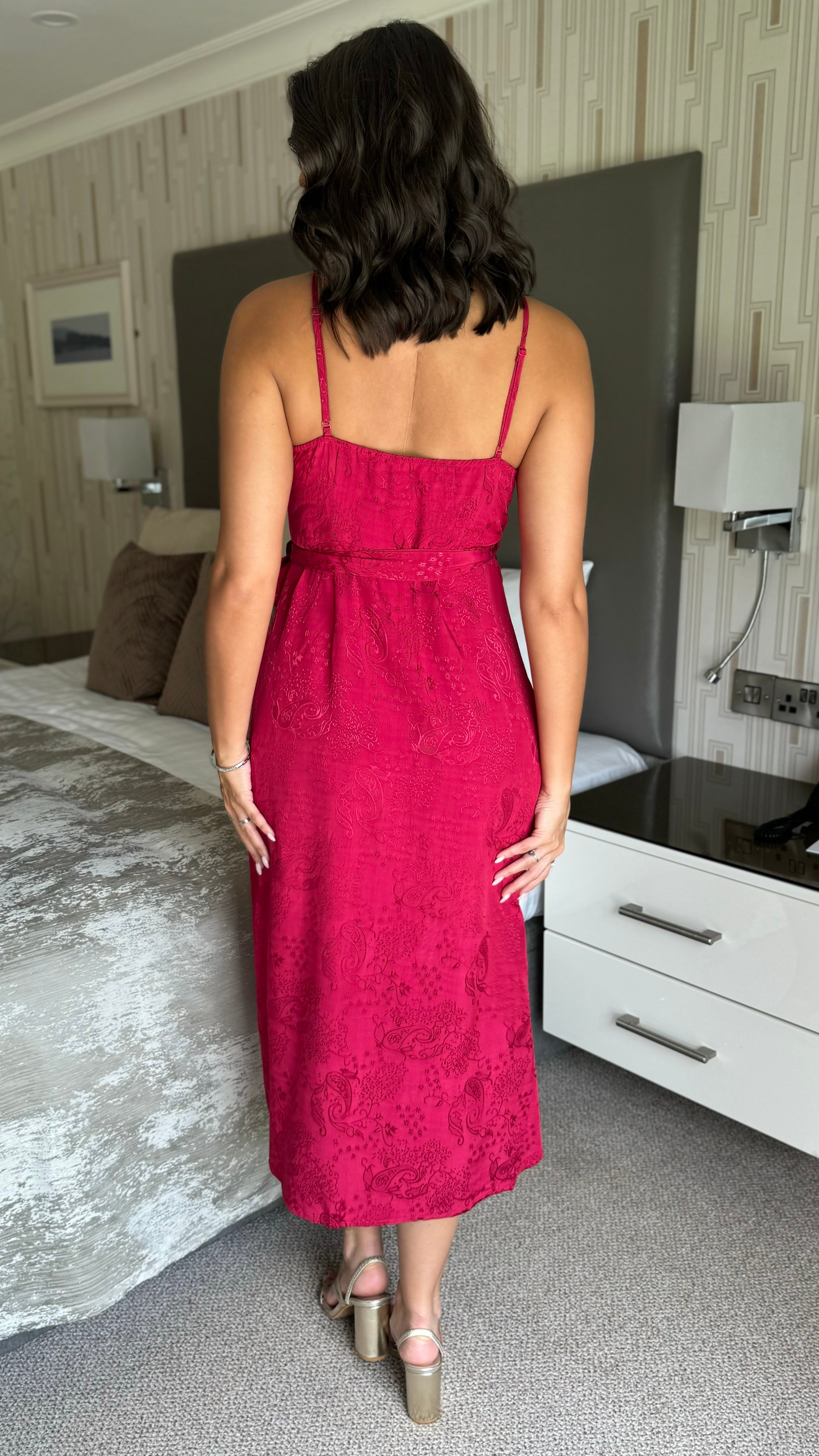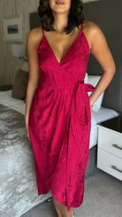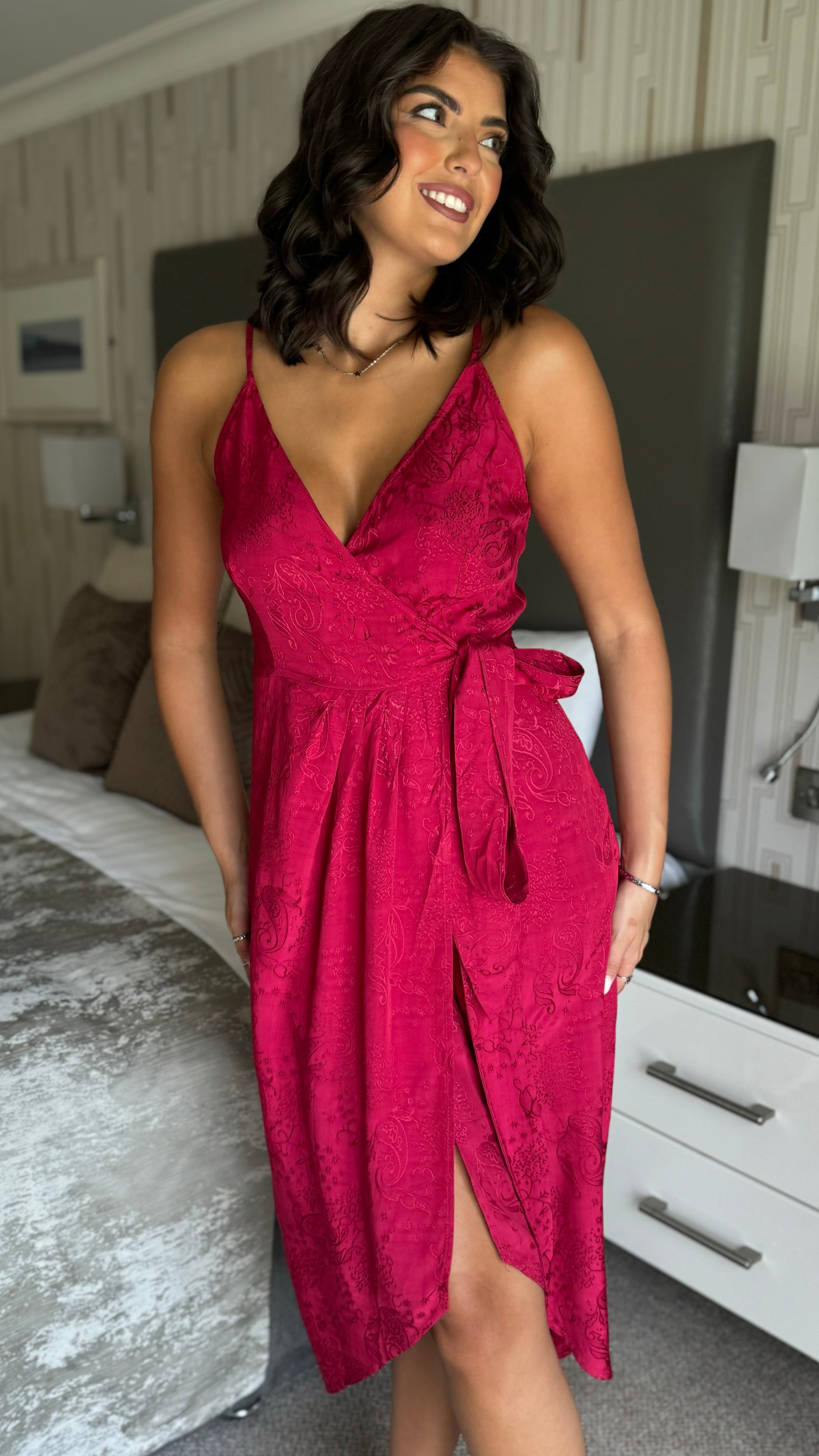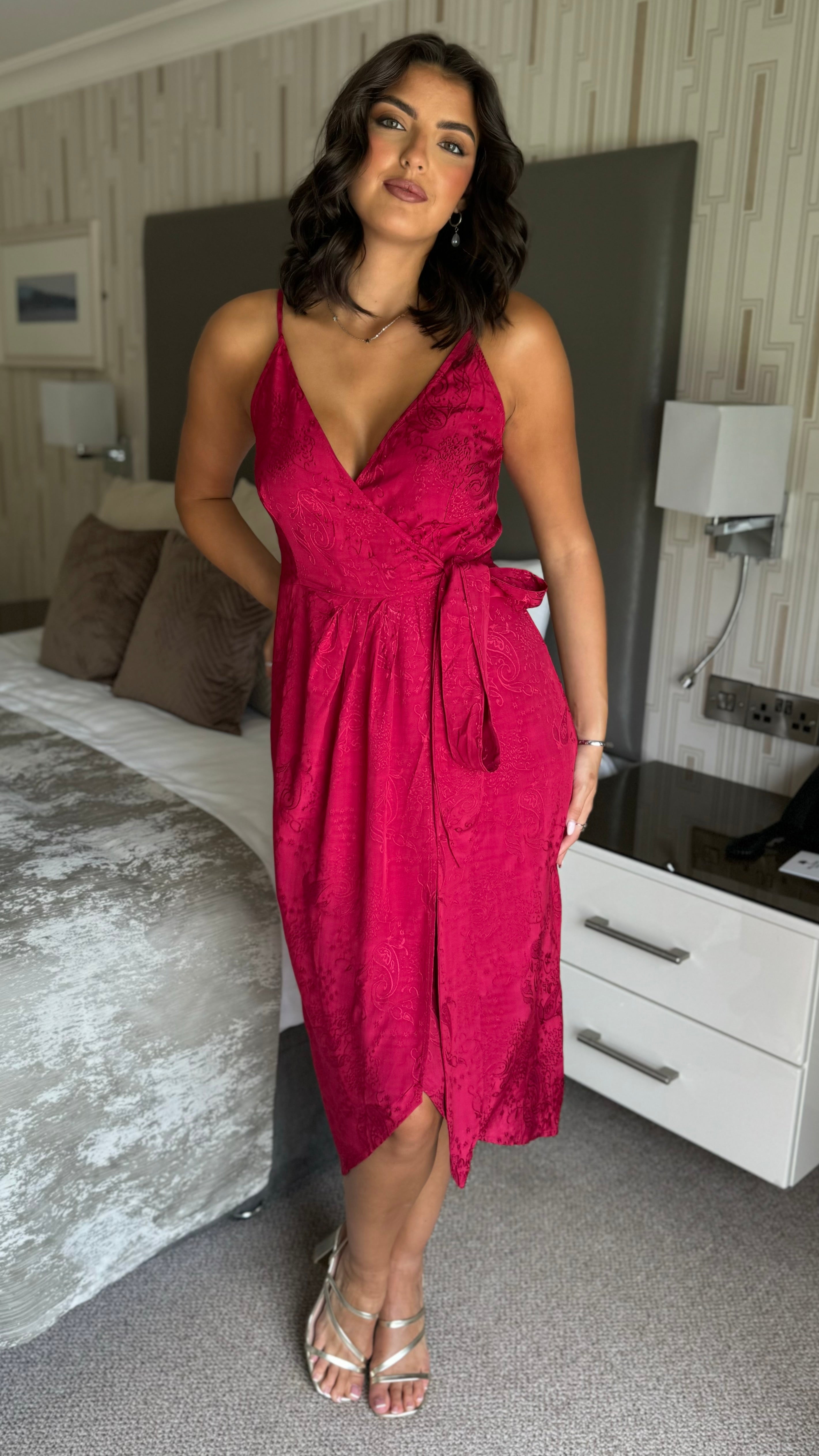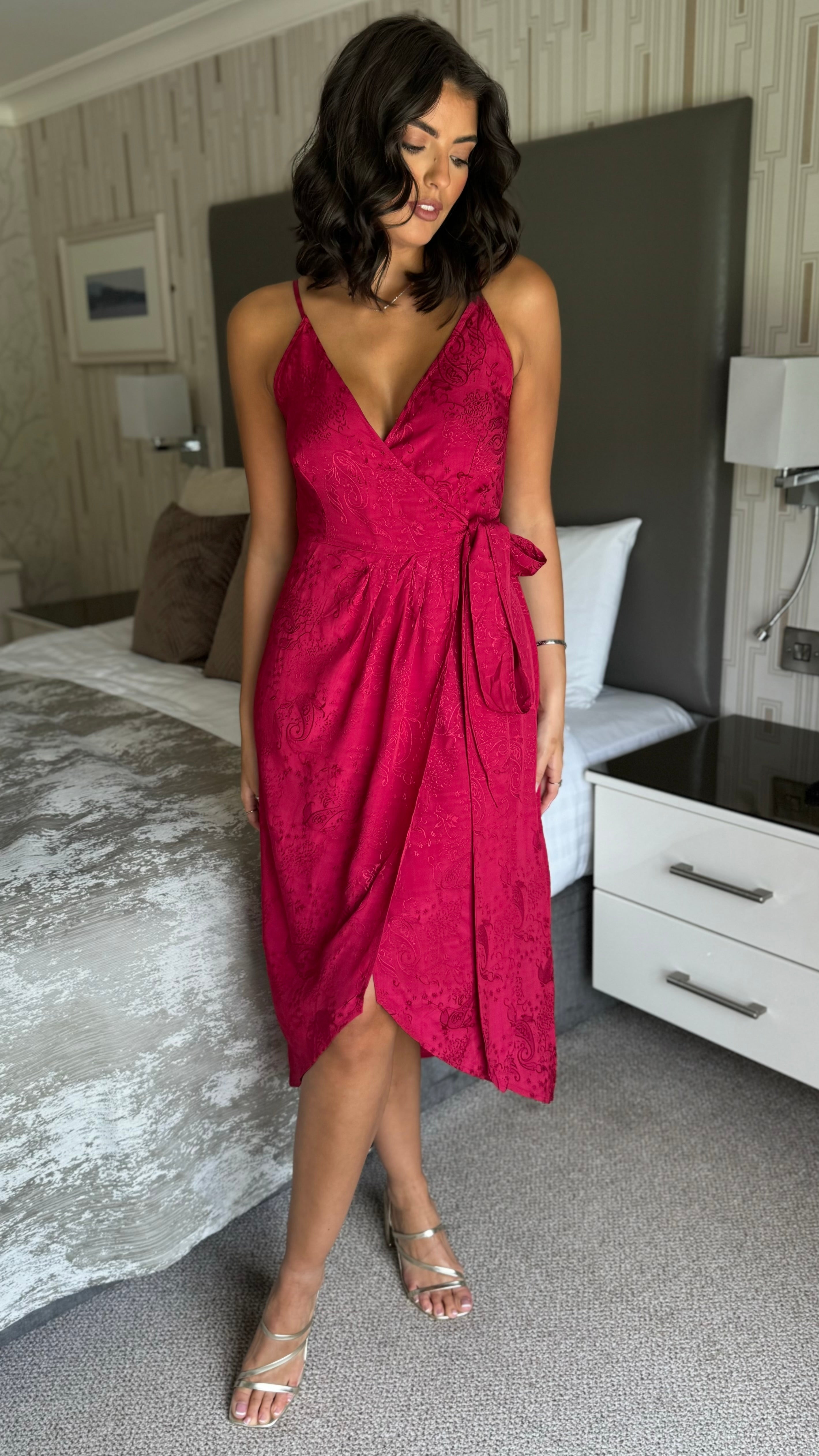 This Lovie Red Wrap Style Midi Dress lets you flaunt your fiery personality! Show off your curves with the adjustable cami straps, bow detail, and cashmere print. You'll be a vision of glamour with a vibrant ruby red colour! 😍🔥