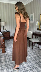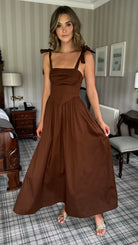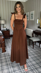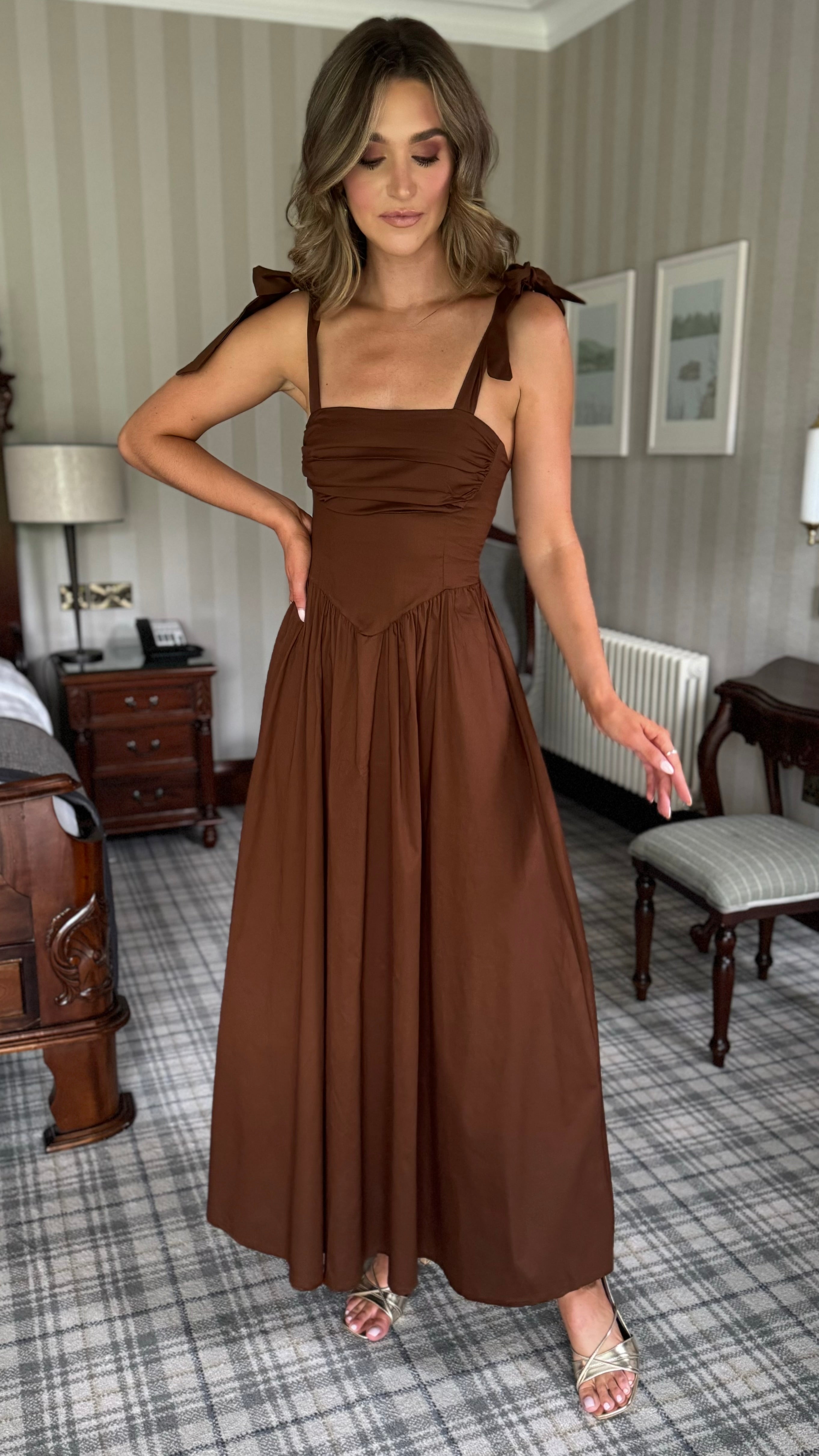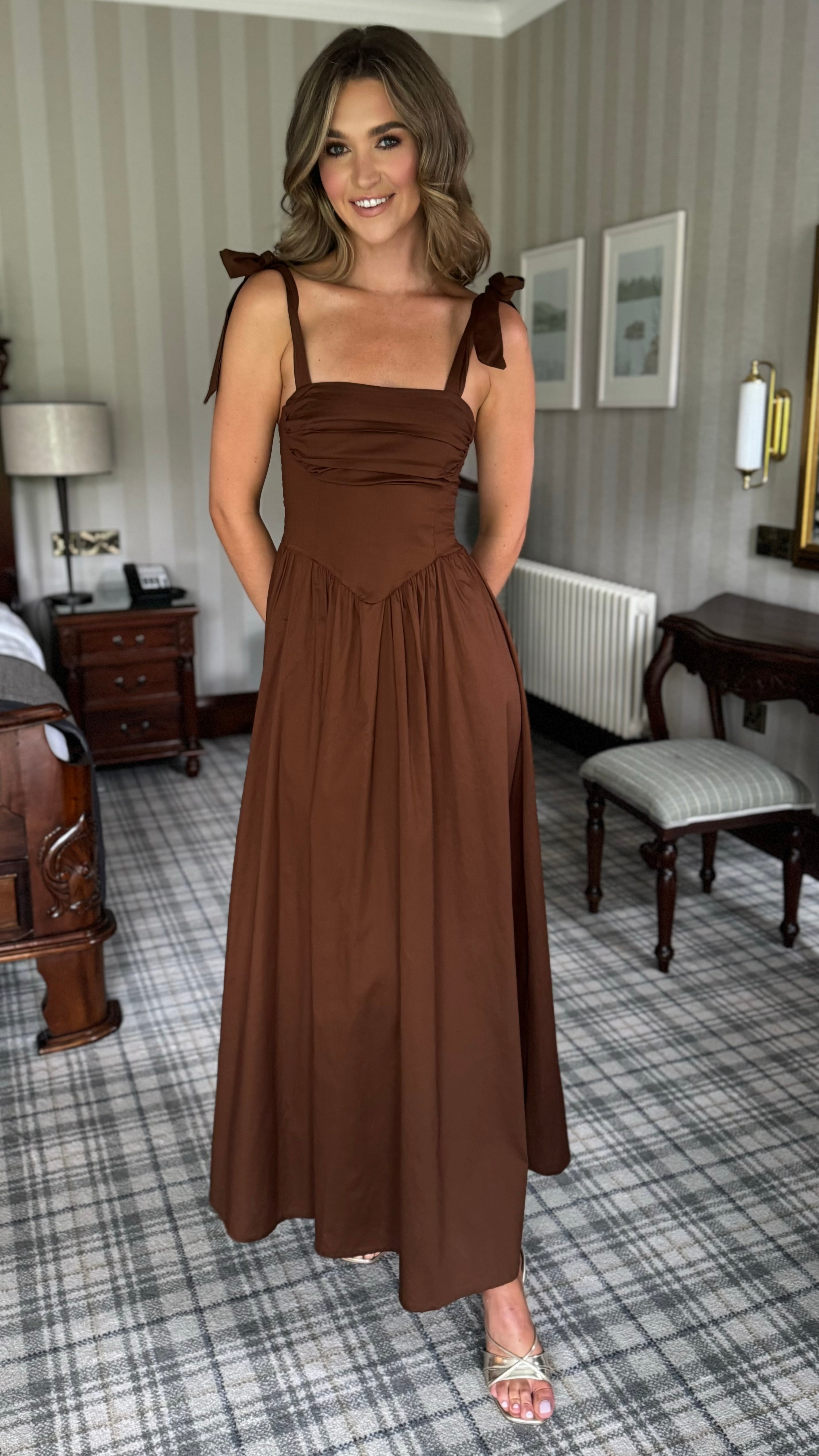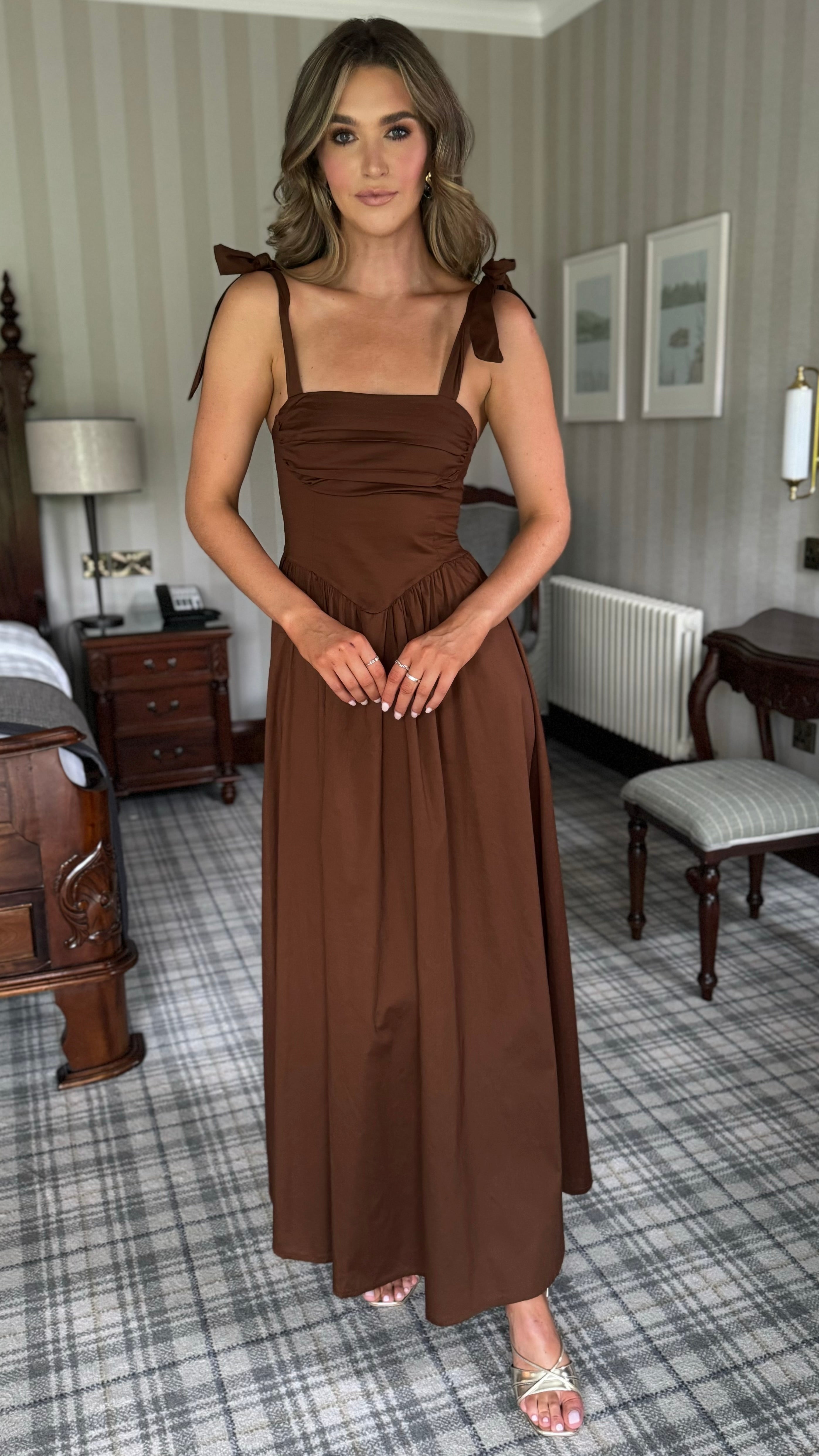 Luellen Brown Tie Shoulder Straps Ruched Bust Detail Midaxi Dress
