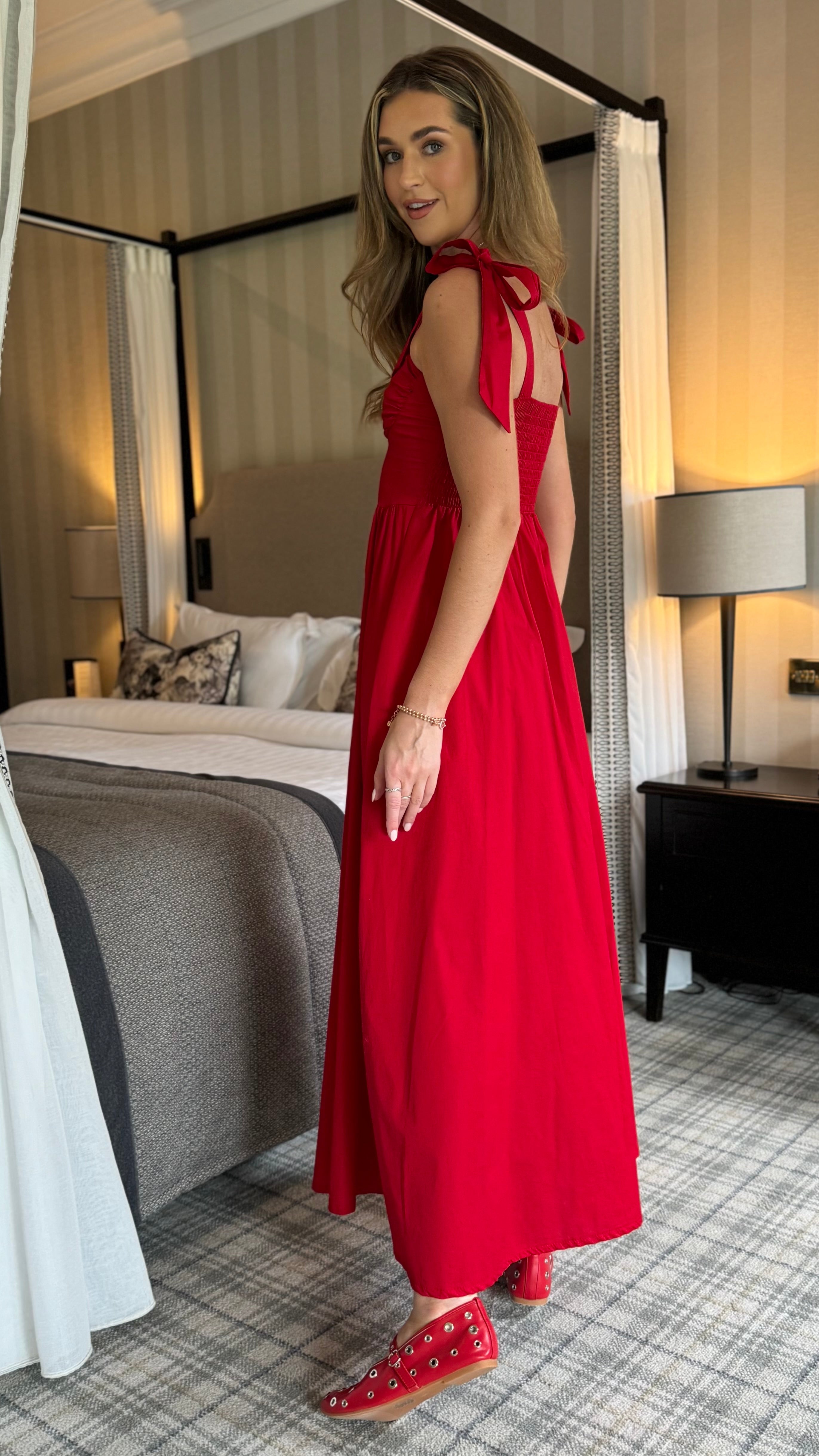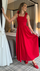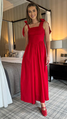 Luellen Red Tie Shoulder Straps Ruched Bust Detail Midaxi Dress