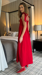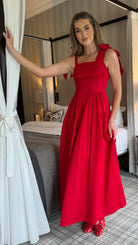The Luellen Midaxi Dress exudes sophistication with its vibrant red shade and elegant tie shoulder straps. Featuring a ruched bust detail, it enhances your natural shape while offering a flattering mid-length silhouette. Perfect for occasions that call for understated glamour and refined style.