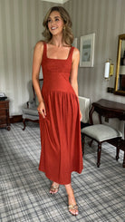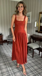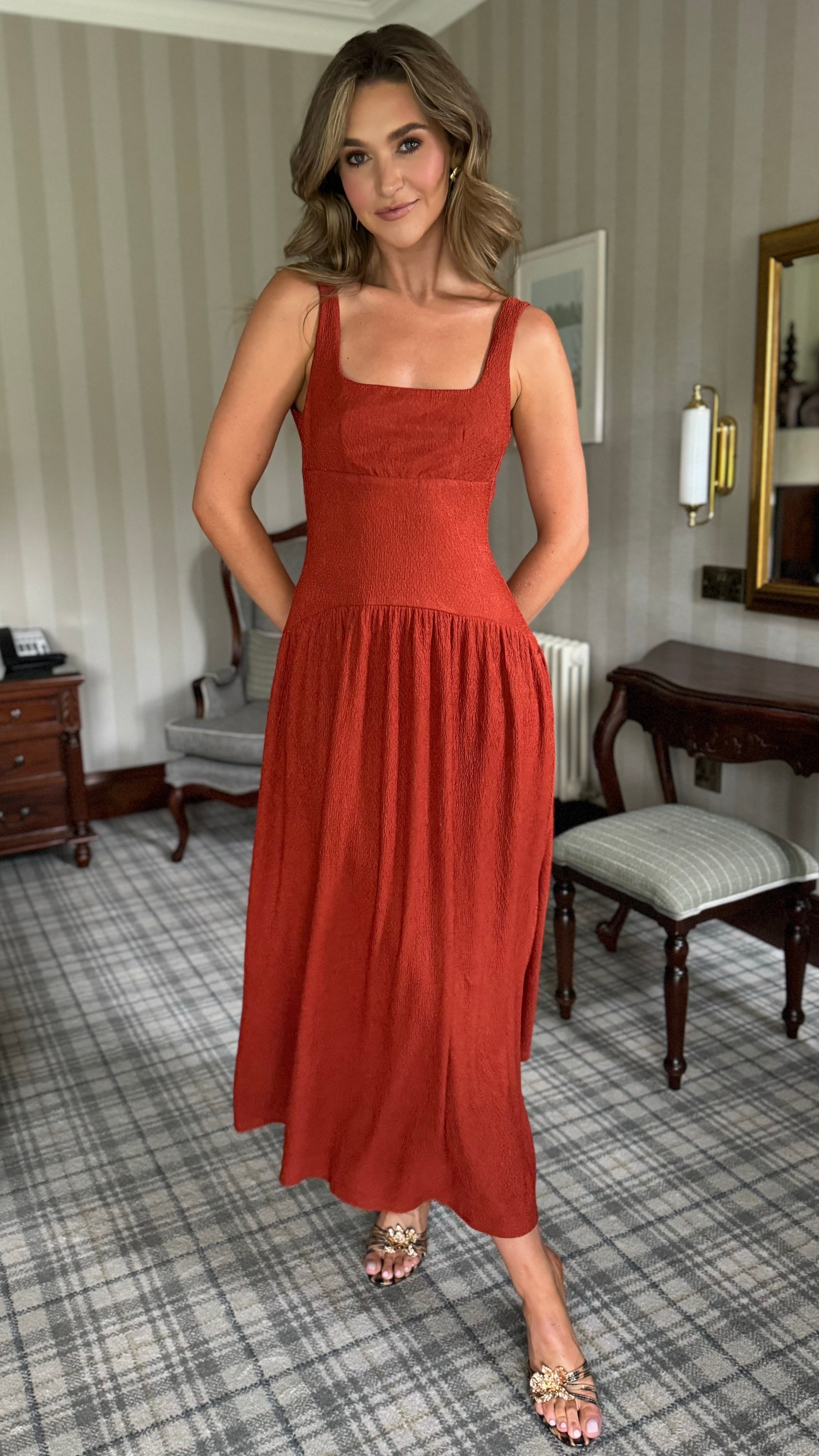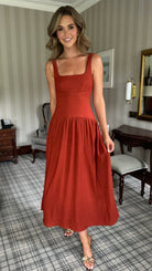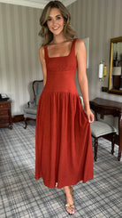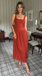 The Luna Rust Square Neck Midaxi Dress 🍁 offers a refined silhouette with its elegant square neckline and flattering midaxi length. Crafted in a rich rust shade, this dress brings a warm, sophisticated vibe to your wardrobe, ideal for both formal gatherings and stylish everyday wear. Experience timeless grace and comfort in one exquisite design.
