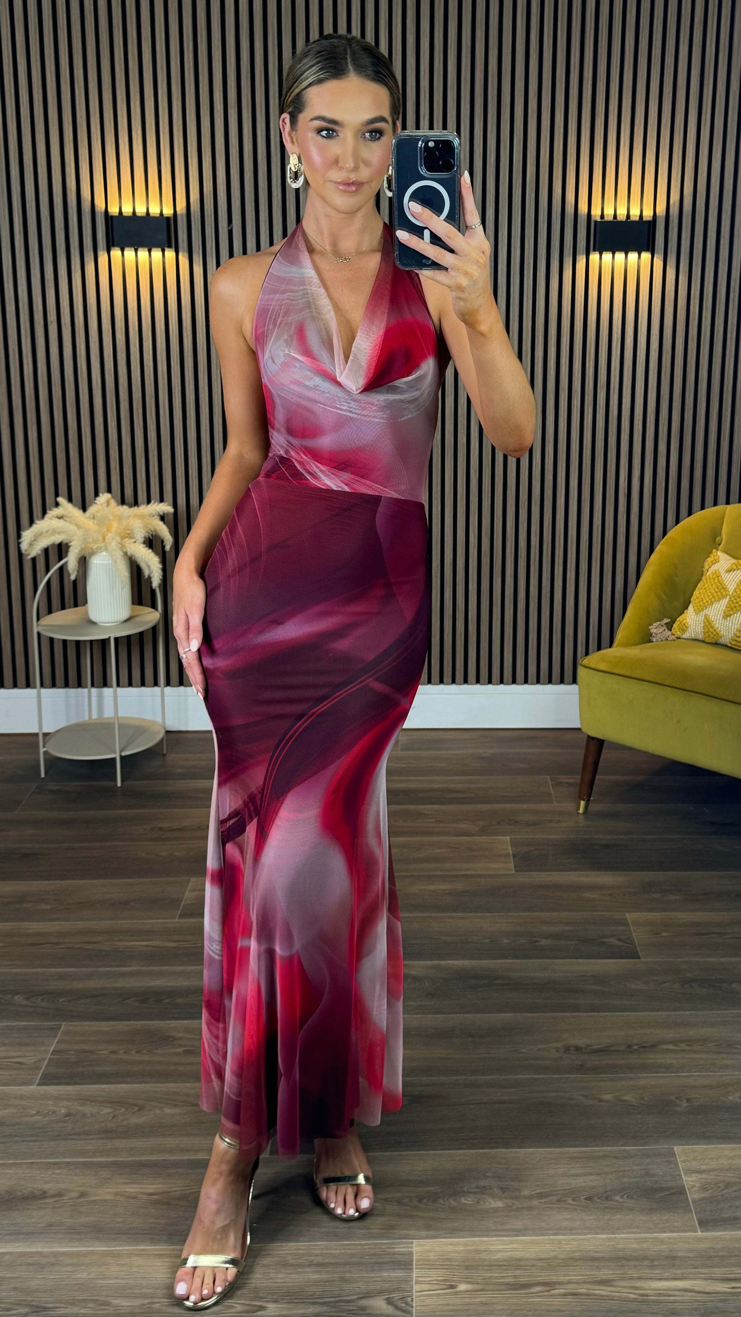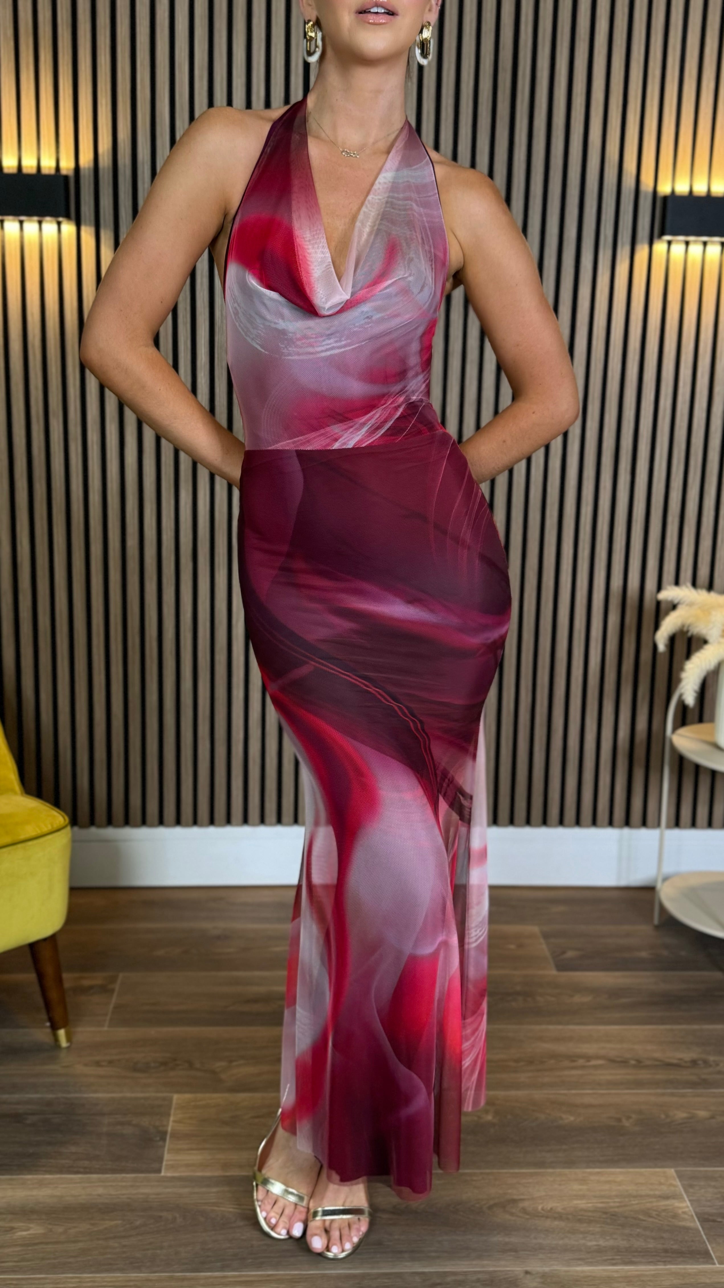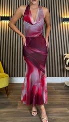 Lyanna Red Abstract Halterneck Cowl Detail Midi Dress