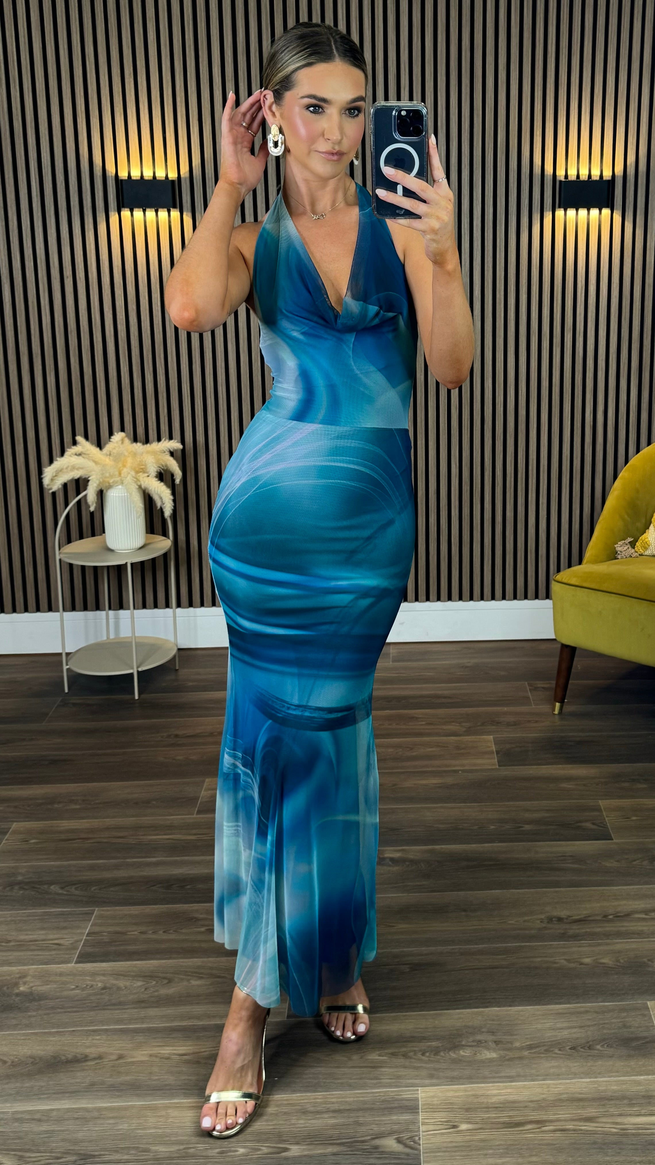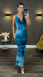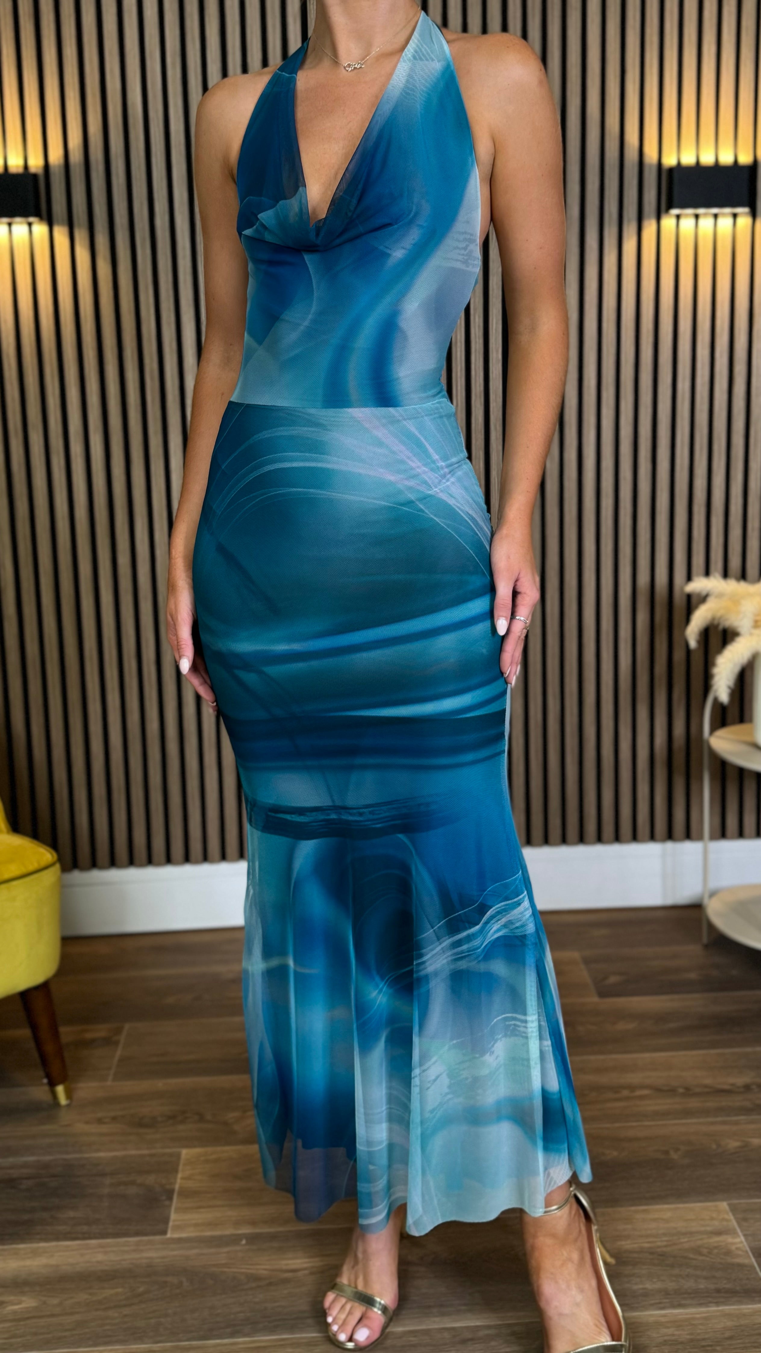 Lyanna Teal Abstract Halterneck Cowl Detail Midi Dress