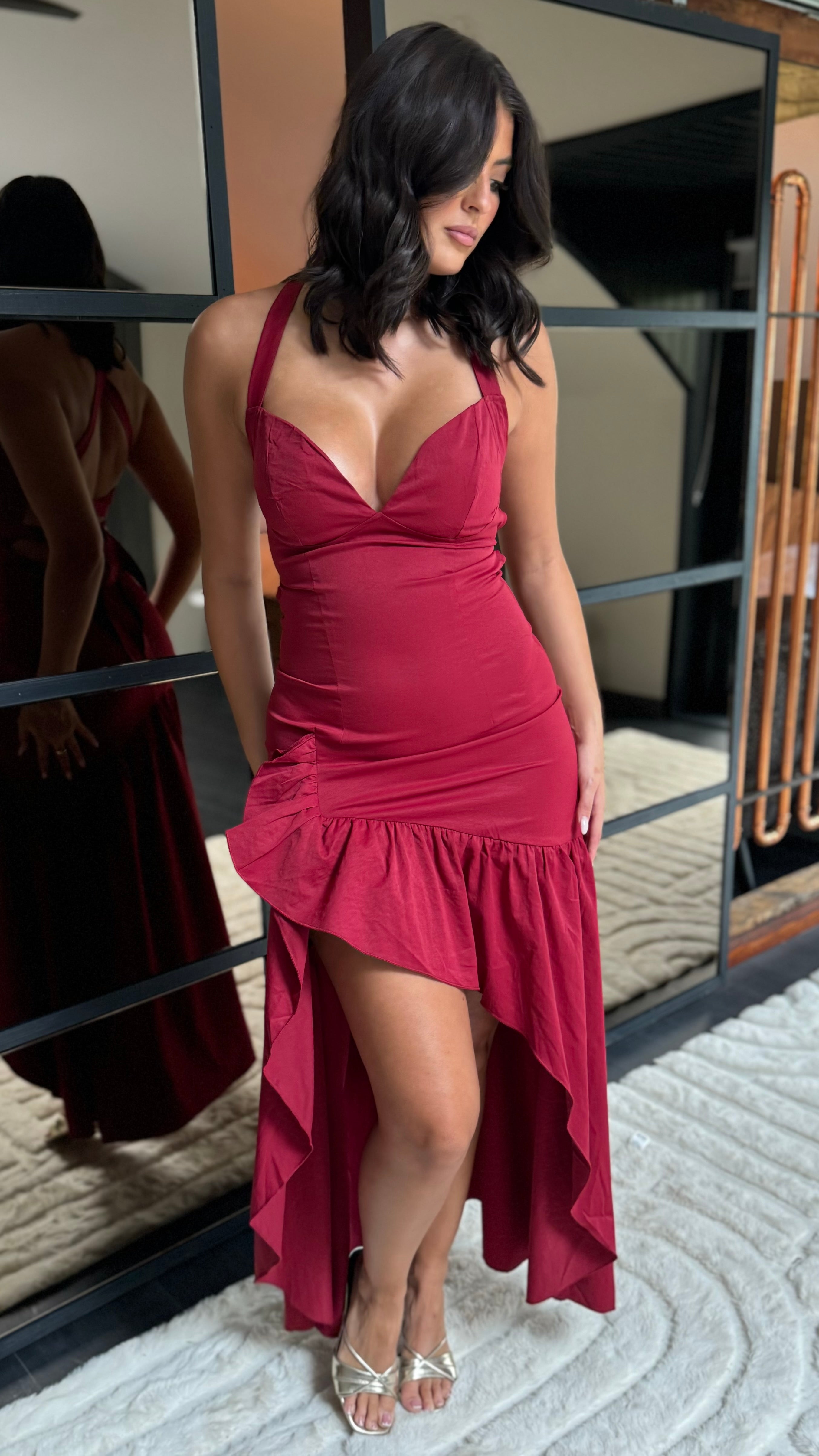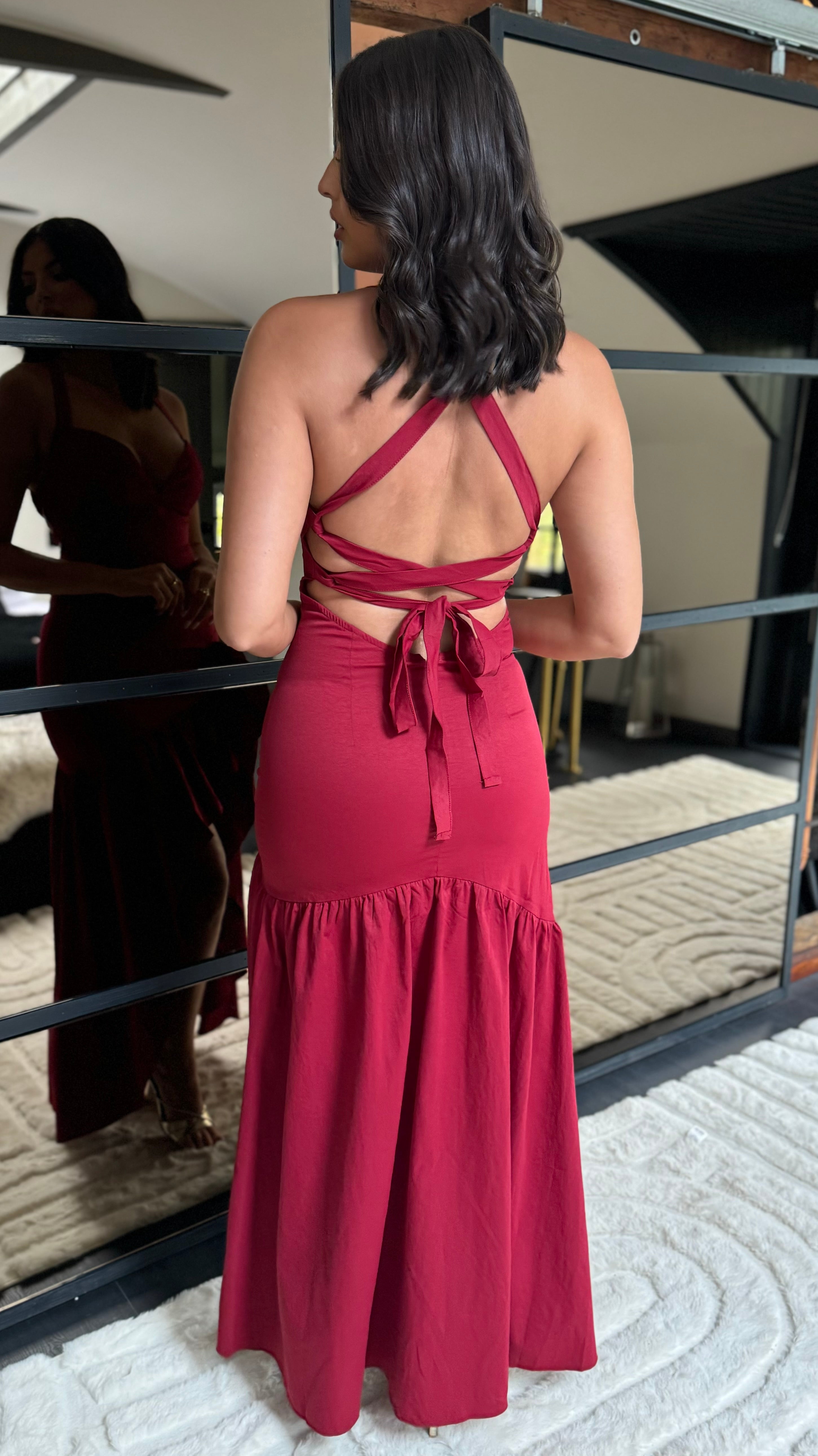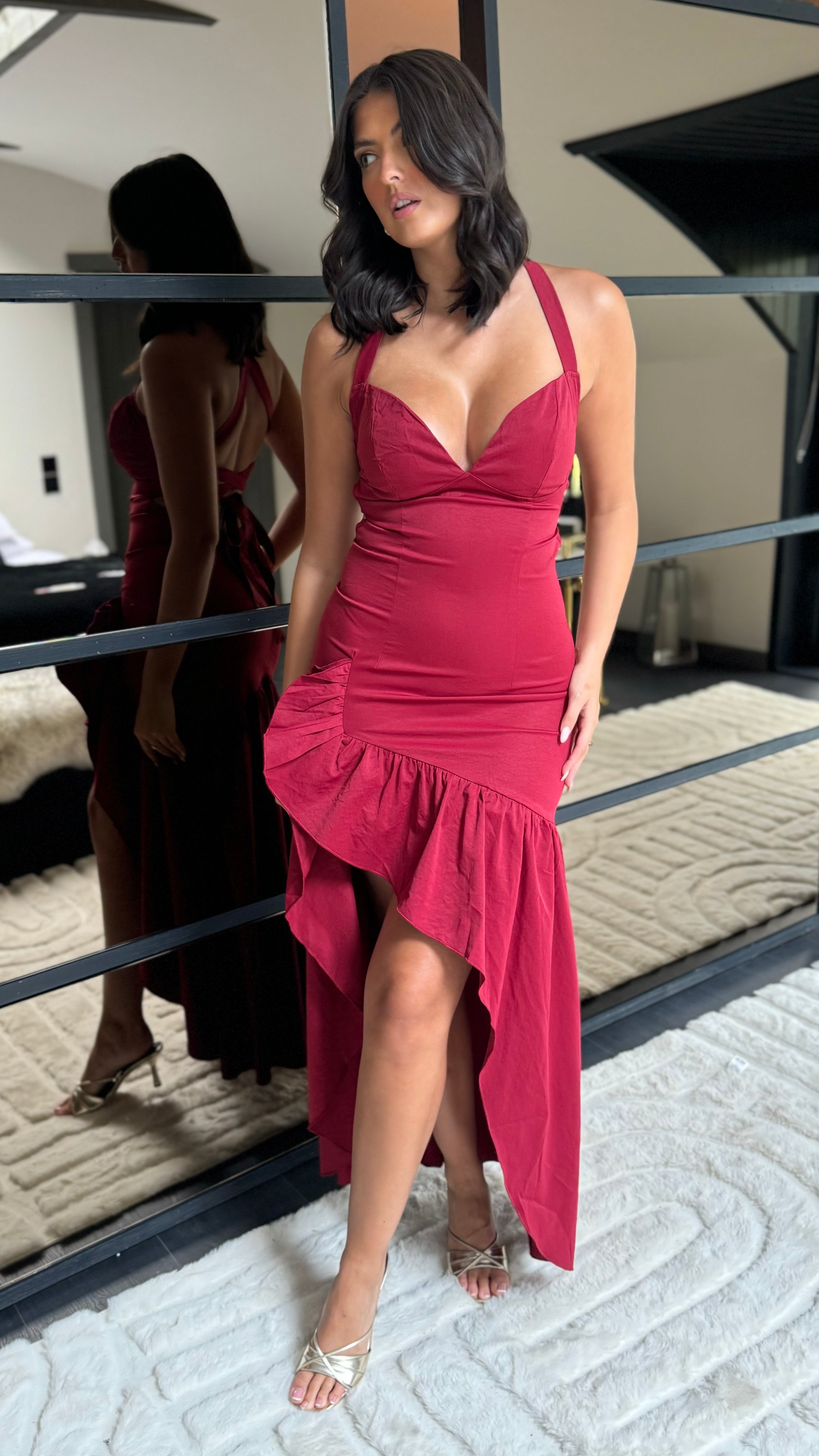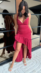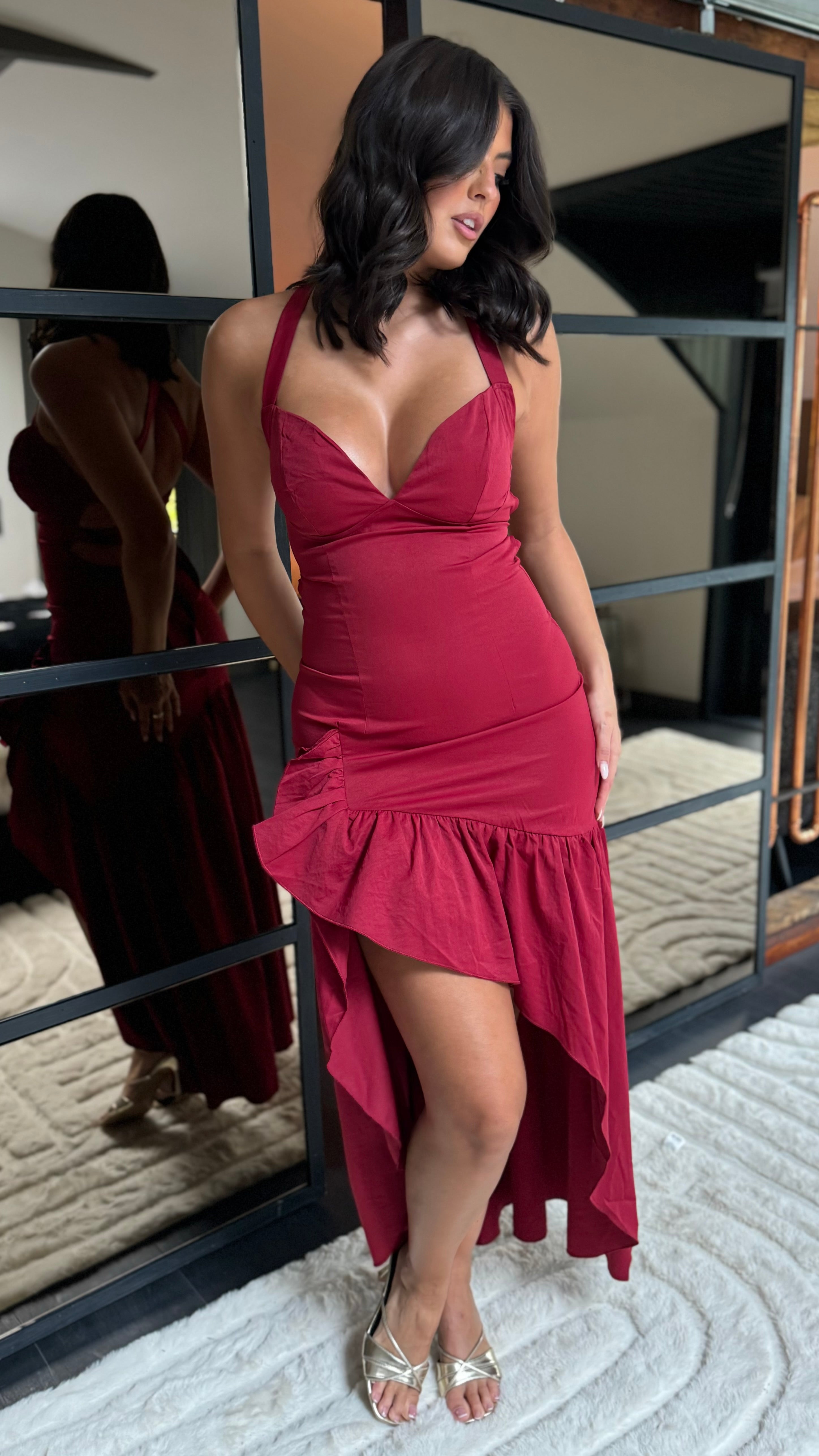 Maddie Burgundy Sweetheart Neckline Asymmetric Maxi Dress