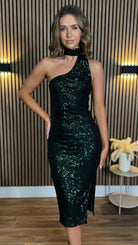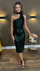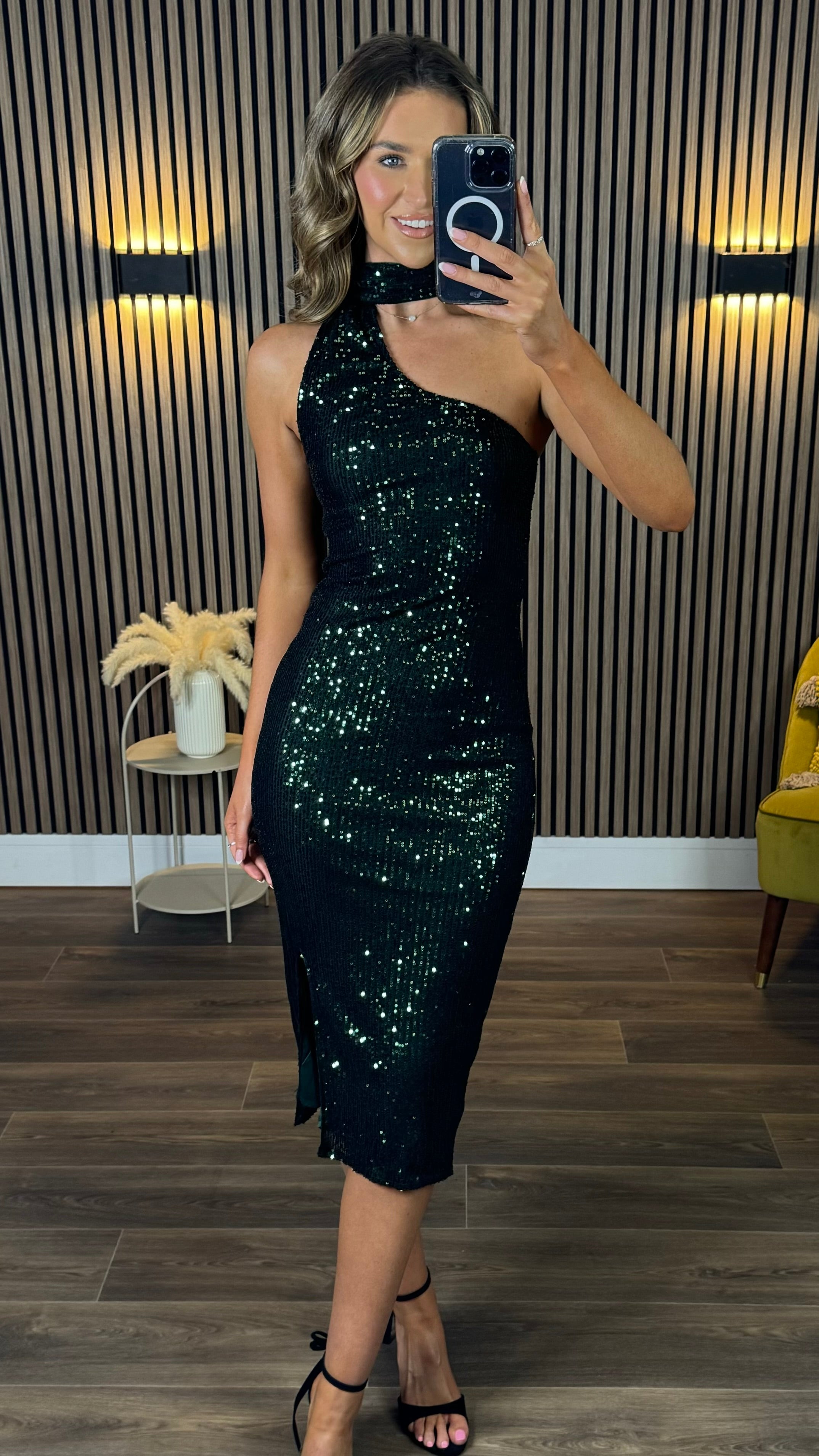 Maddie Green One Shoulder Scarf Neck Sequin Dress