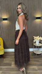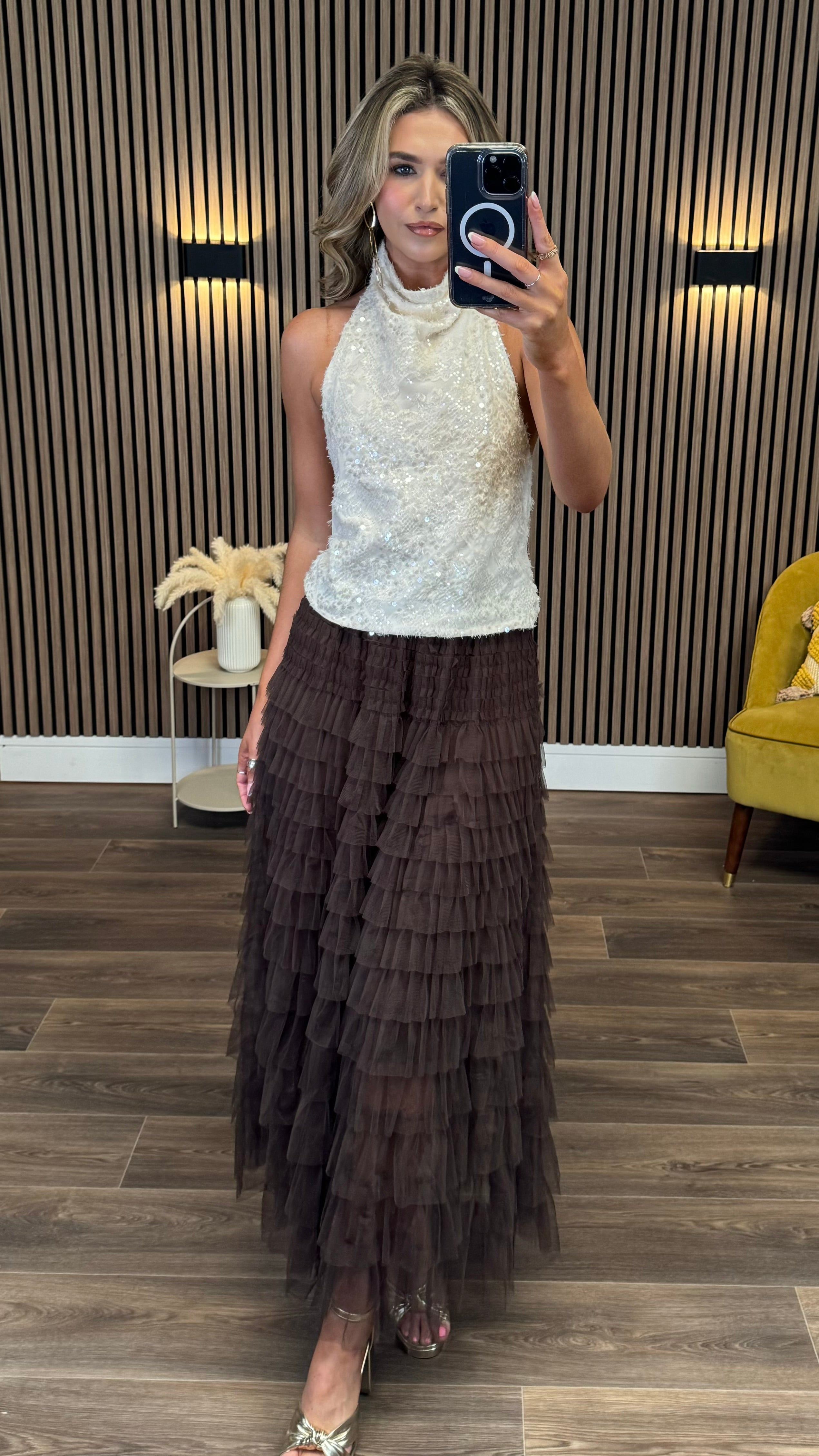 Get ready to shine in the Magdalena Cream Sequin Halterneck Top! Its sparkling sequins catch every eye, while the halterneck style keeps things flirty and fun. With a handy button fastening at the back of the neck, this top is easy to slip on for a night full of sparkle and smiles. Perfect for making any outfit pop with a playful touch!