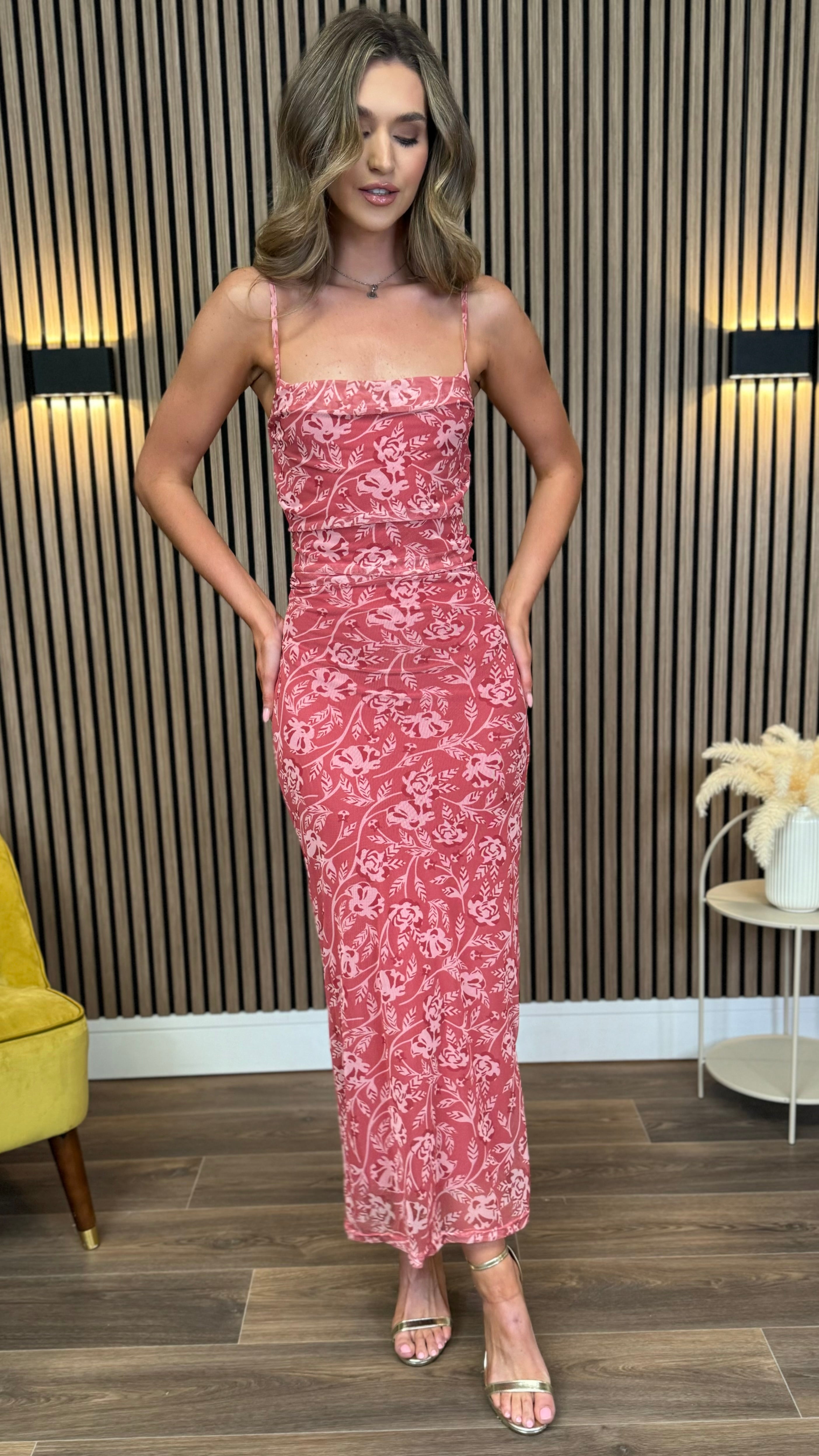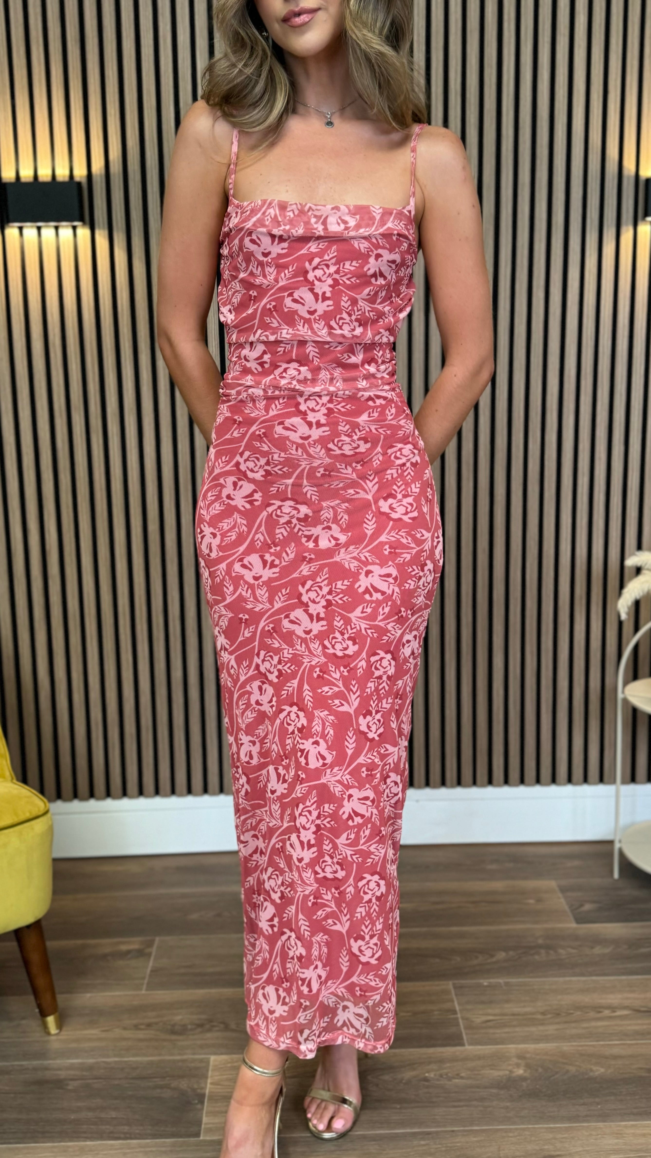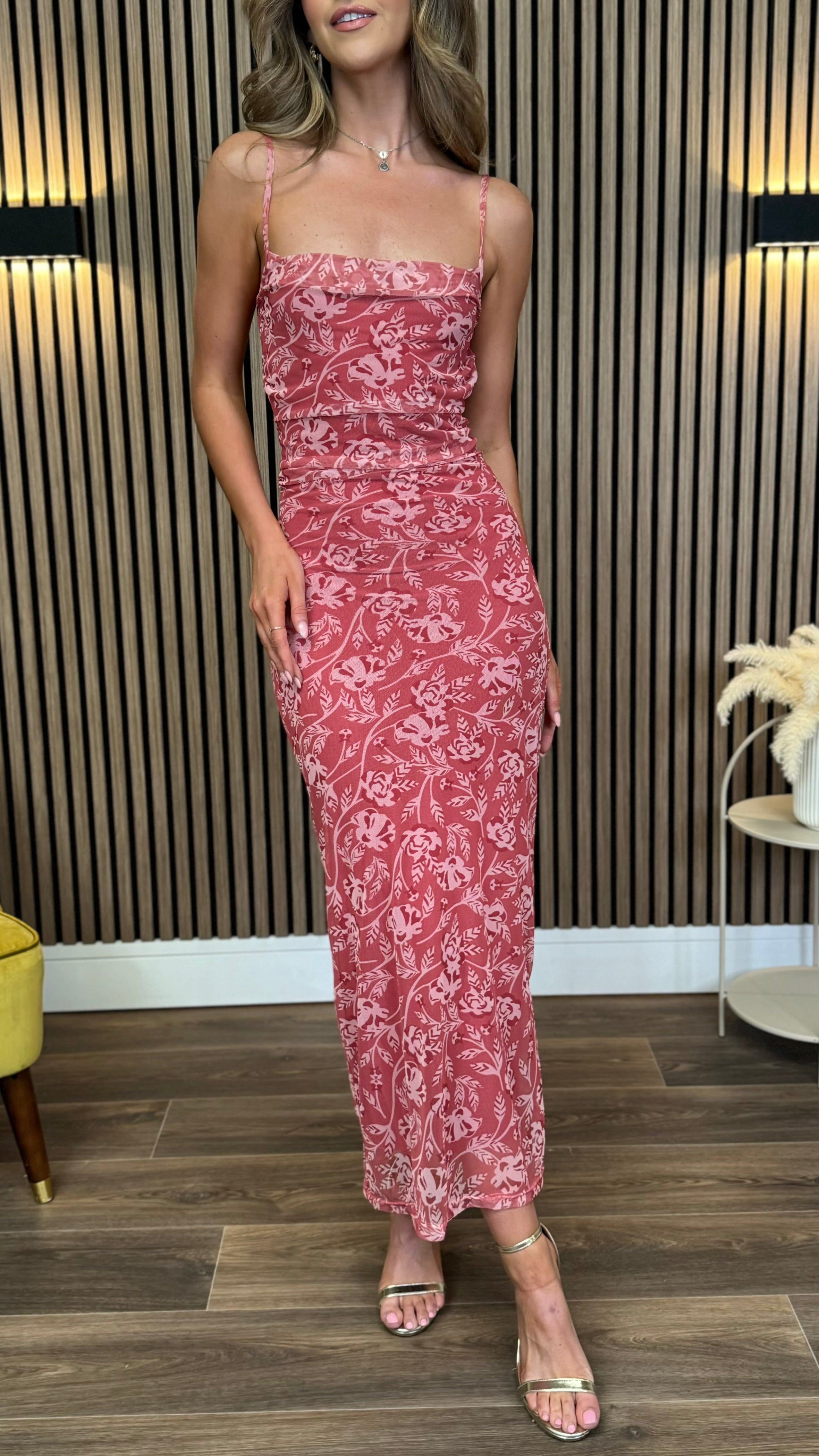Marion Coral Floral Printed Strappy Backless Midi Dress