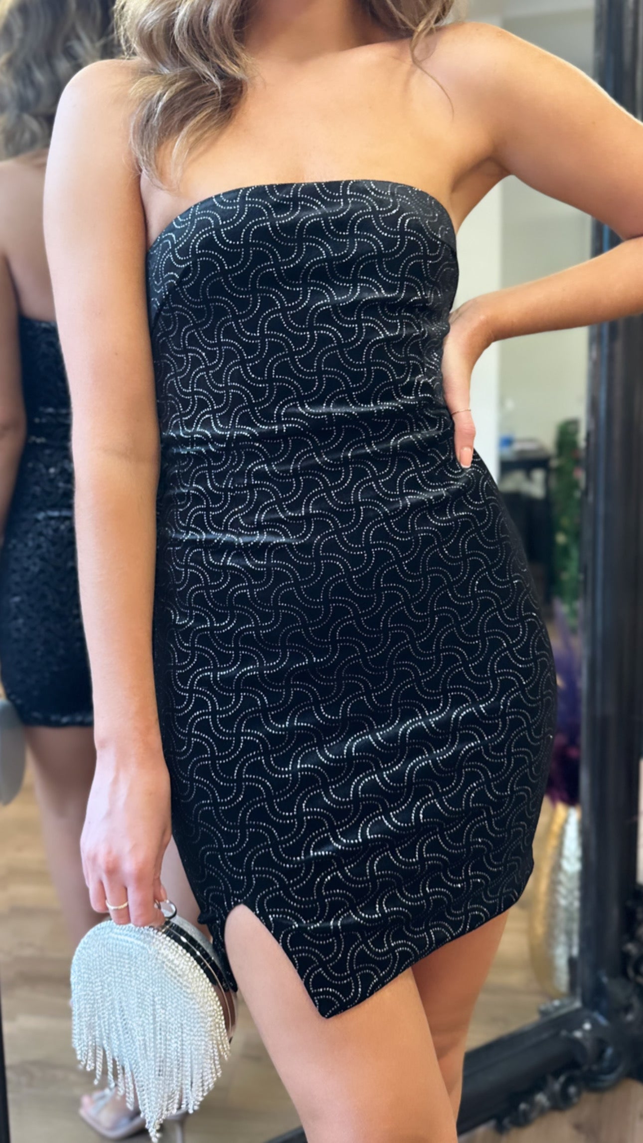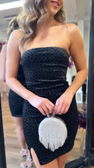 Make a statement in this 💥Melrose Black Sparkle Bandeau Velvet Mini Dress💥! Show off your style with the shimmer of the sparkle fabric, elegant bandeau design, and super-cute mini skirt. Be the center of attention at your next event with a sassy, shimmering, and oh-so-dramatic side slit. 😉