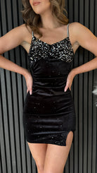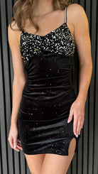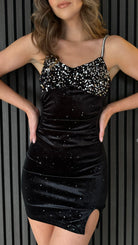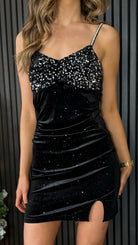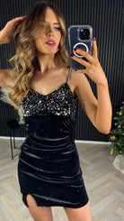 Get ready to shine in the Mindy Black Shimmer Detail Sequin Top Cami Strap Mini Dress. With shimmer detail throughout and a sequin top, this dress will have you catching everyone's eye. The cami straps add a flirty touch, while the side split provides a bit of playfulness. Bring on the spotlight!