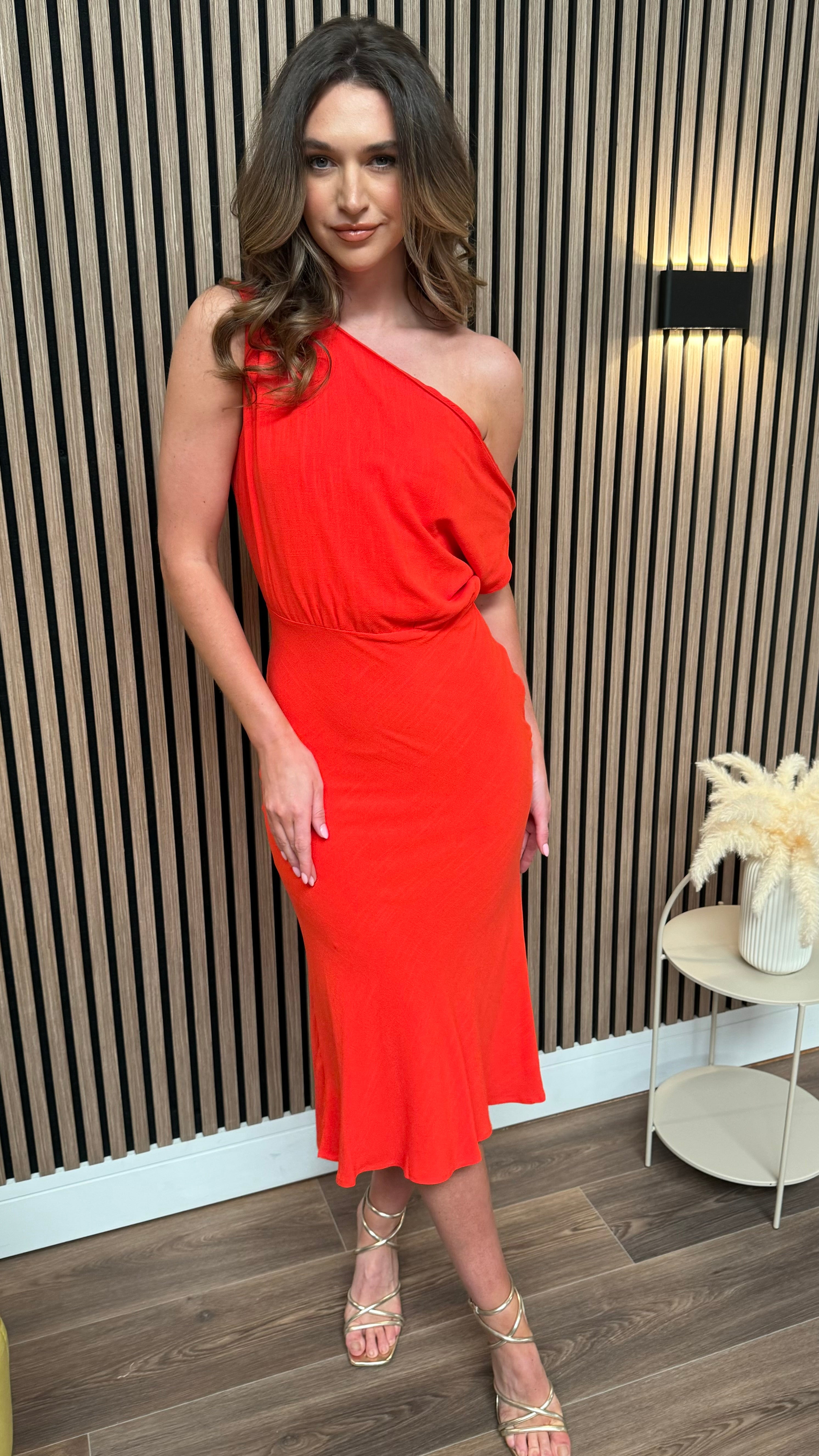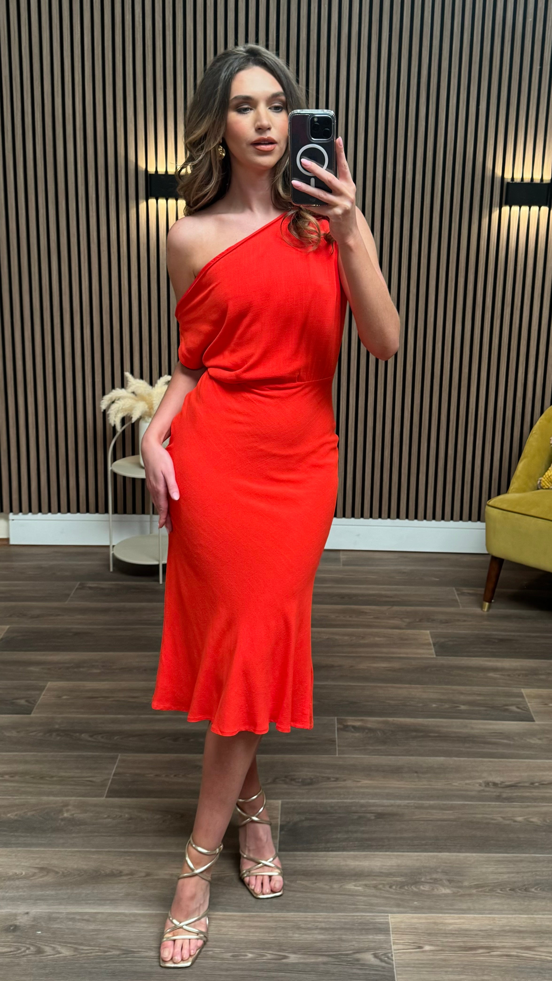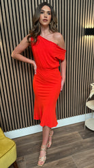 Get ready to turn heads in our Molly Red Off Shoulder Midi Dress! This stunning dress features a stylish off-shoulder design that will accentuate your shoulders and collarbone. The midi length adds a touch of elegance, making it perfect for any special occasion. Embrace your playful side with this flirty and fun dress! 🎉👗