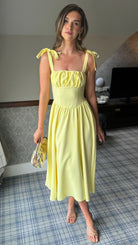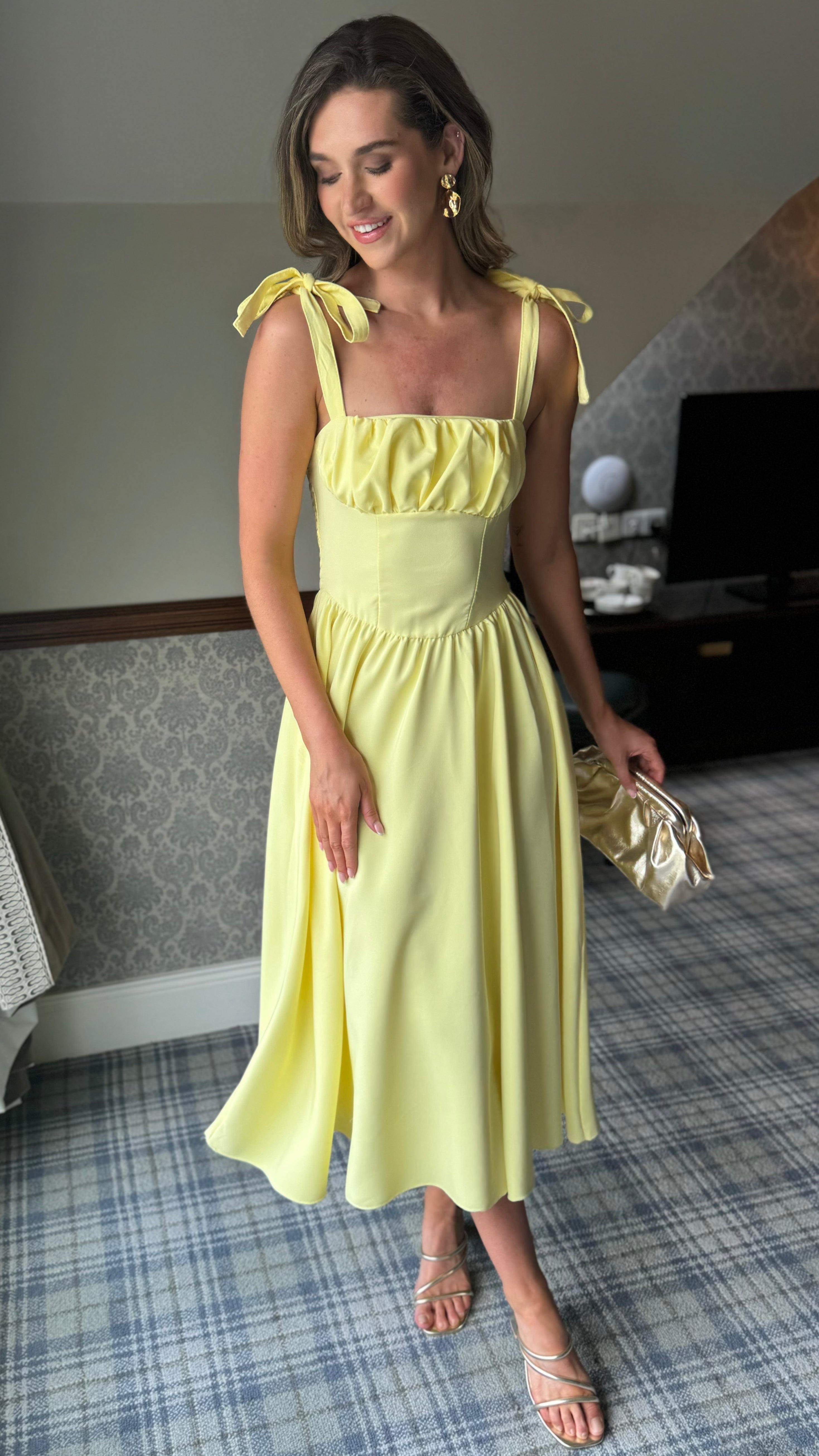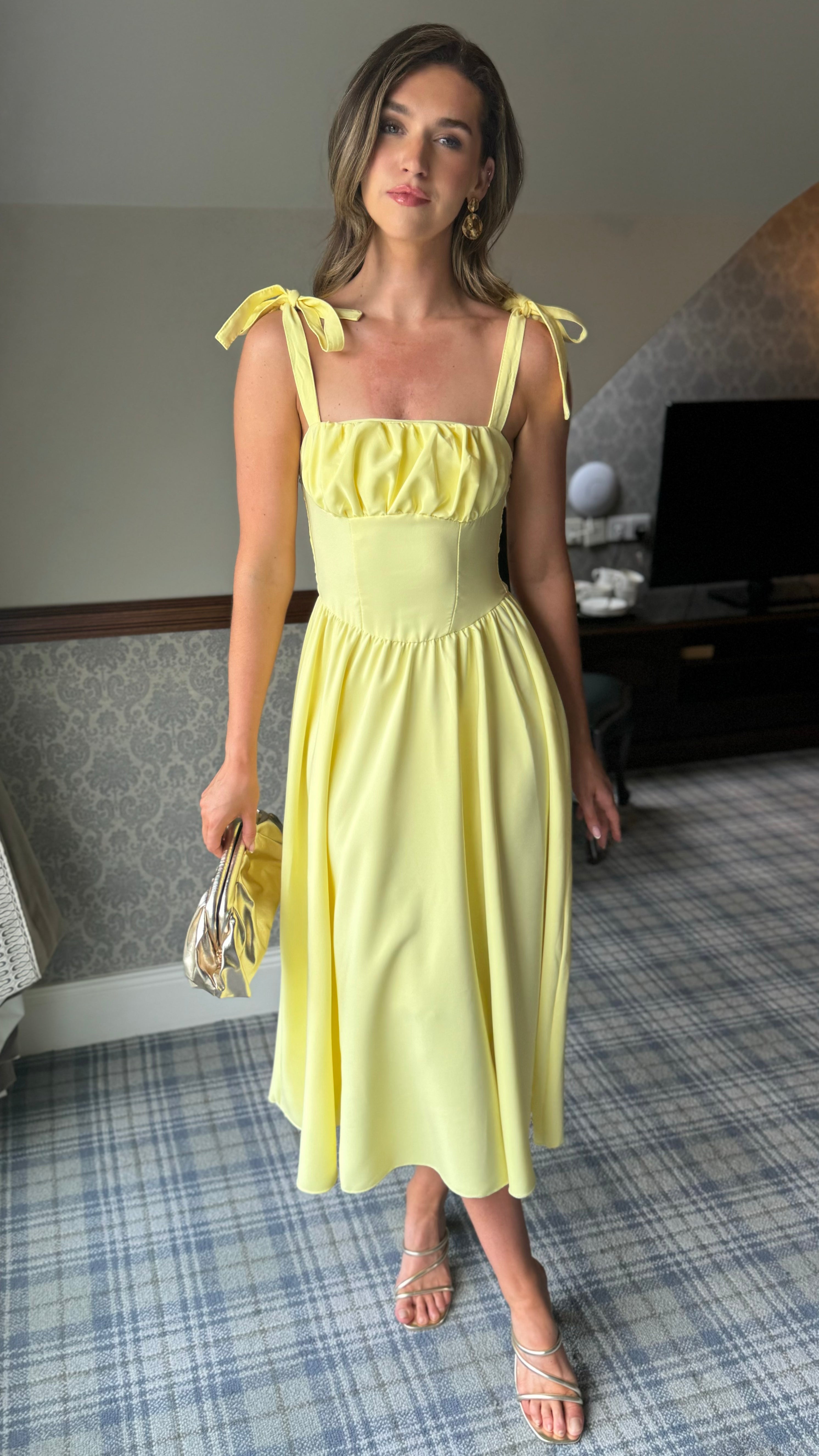 Get ready to turn heads with our Nigella Yellow Tie Detail Strap Midi Dress! The playful tie detail strap and ruched pleat bust add unique touches to this flowy dress. The elasticated bodice ensures a comfortable fit, while the full skirt adds a touch of drama. Perfect for any occasion! 🌼