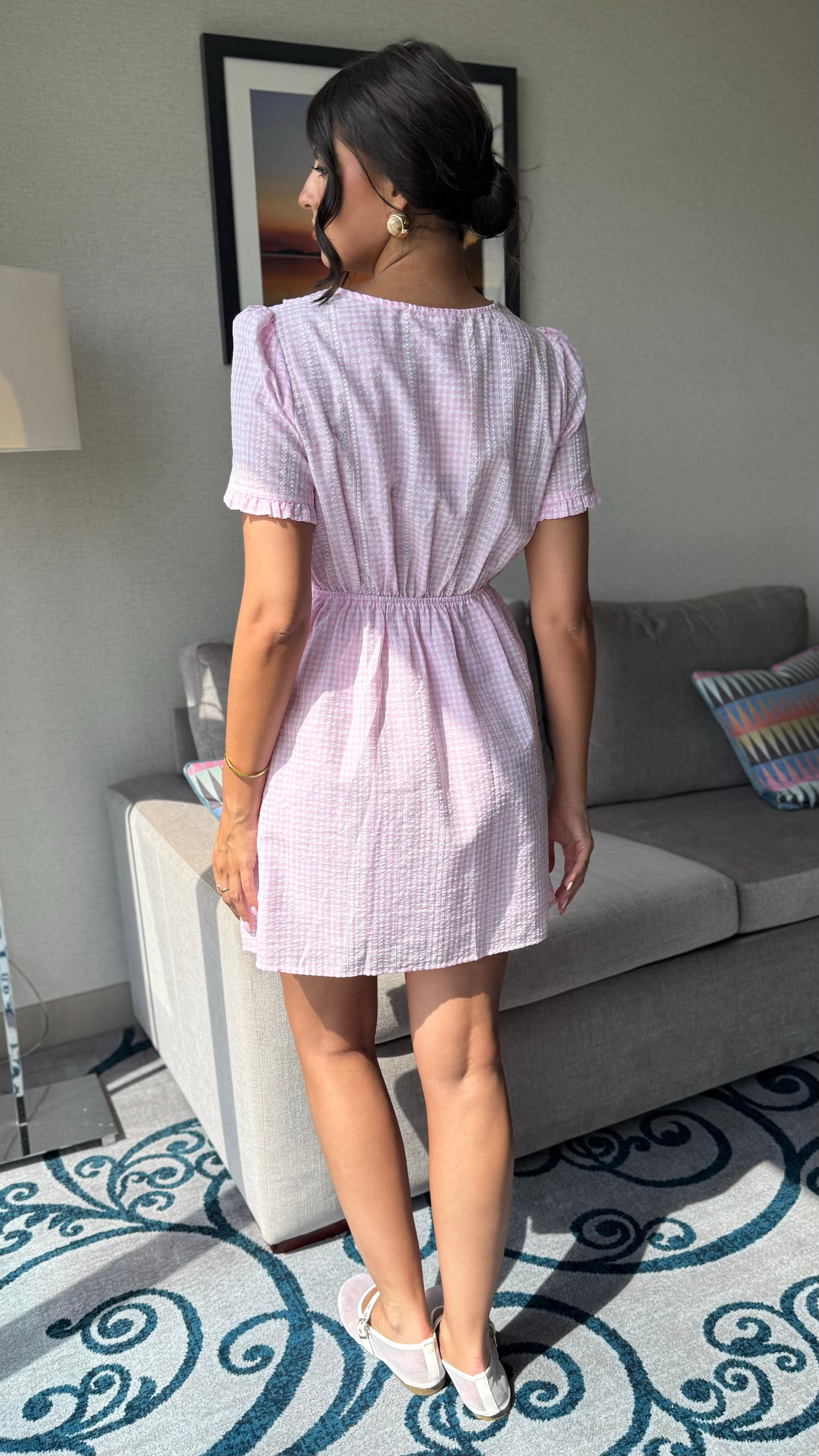 Noa Pink Gingham Frill Sleeve Skater Mini Dress