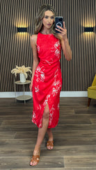 Make a statement with the Oaklynn Red & White Floral Ruched Cut Out Detail Sleeveless Faux Wrap Midi Dress. Its ruched detailing and chic cut-out accents beautifully enhance your figure, while the vibrant floral pattern adds a touch of elegance. The faux wrap design ensures a flattering fit and effortless comfort, perfect for turning heads at any occasion. Add this versatile and stylish dress to your collection and embrace a look that’s both confident and captivating.