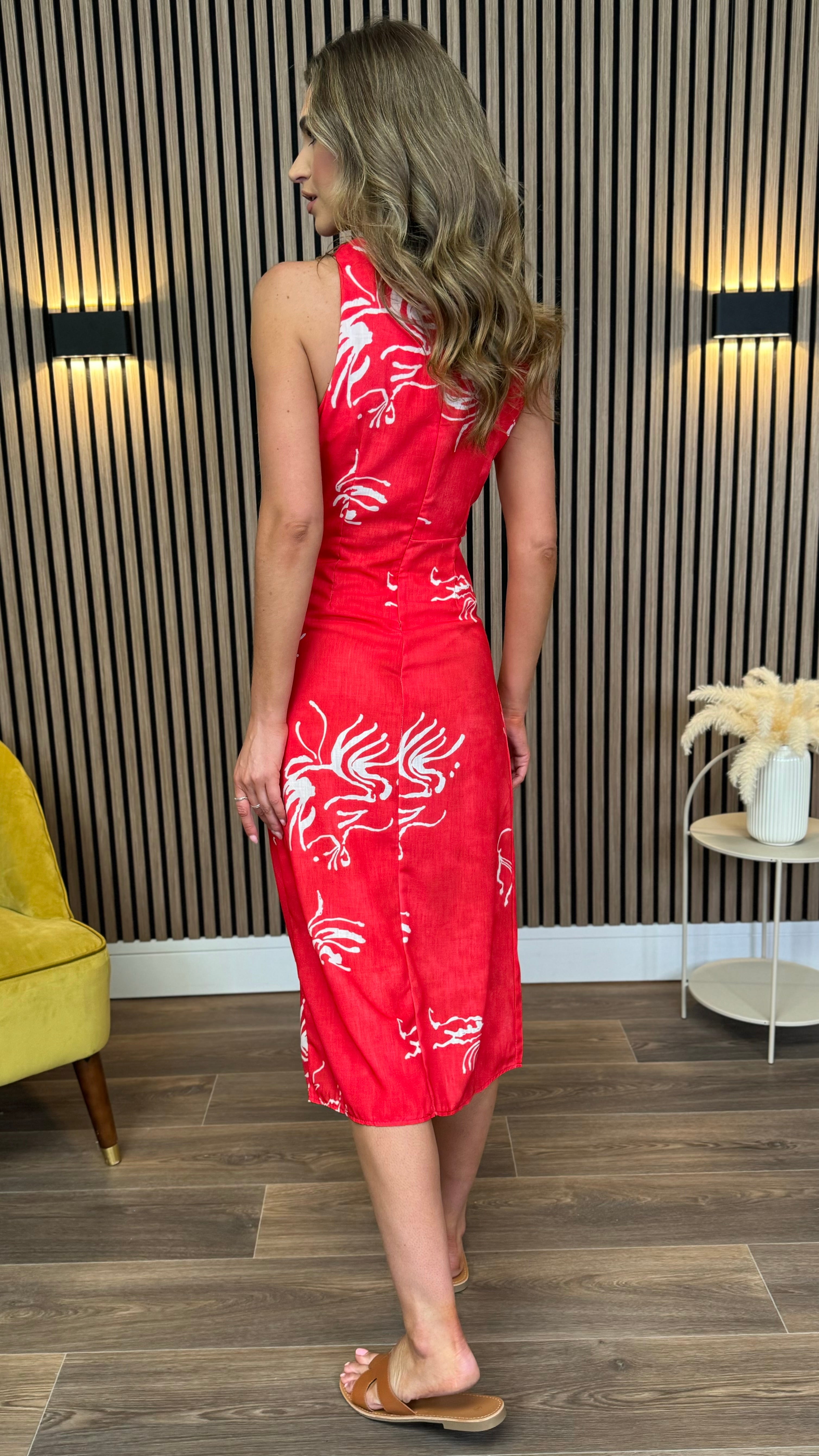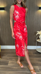 Oaklynn Red & White Floral Ruched Cut Out Detail Sleeveless Faux Wrap Midi Dress