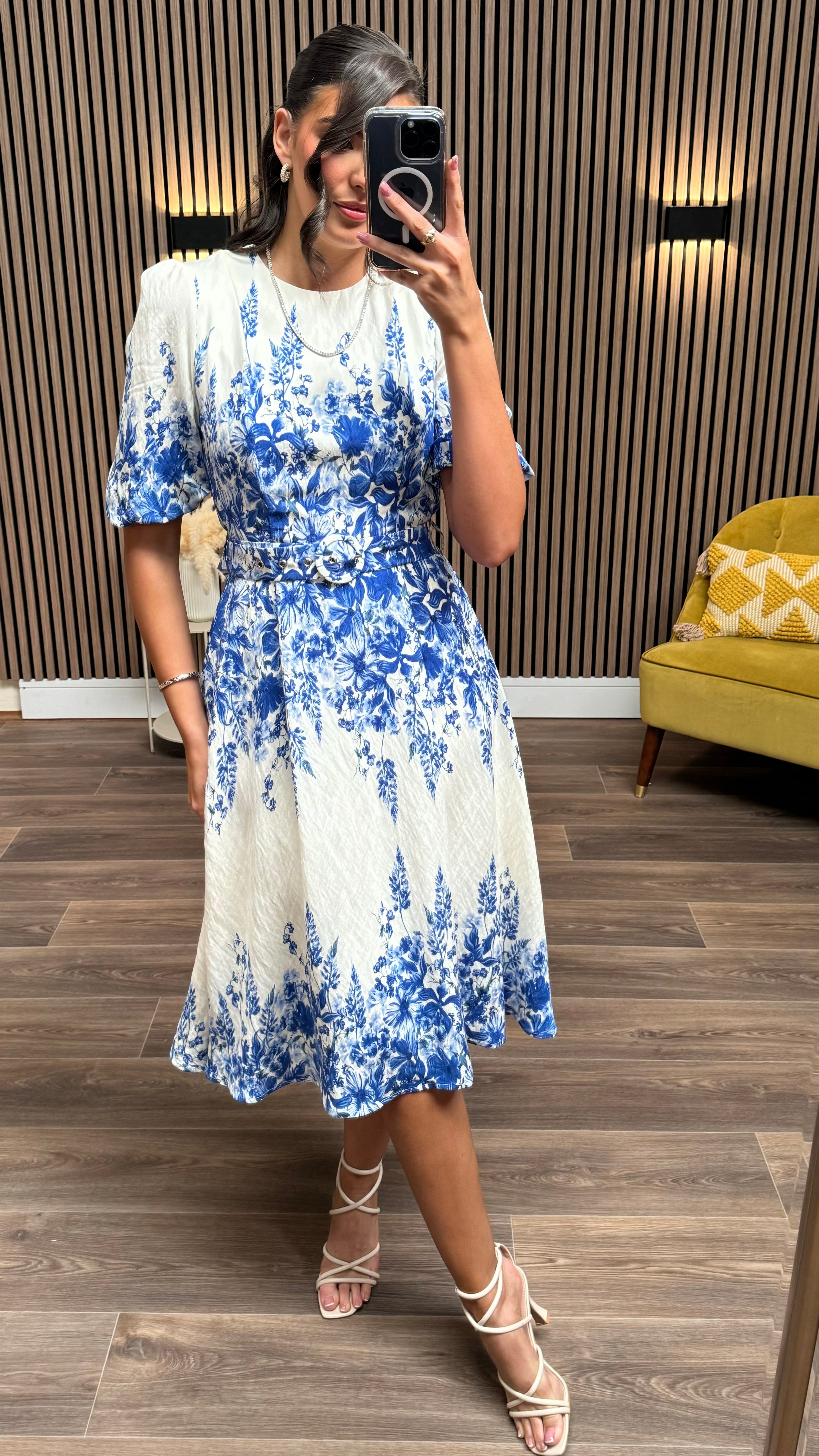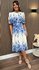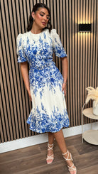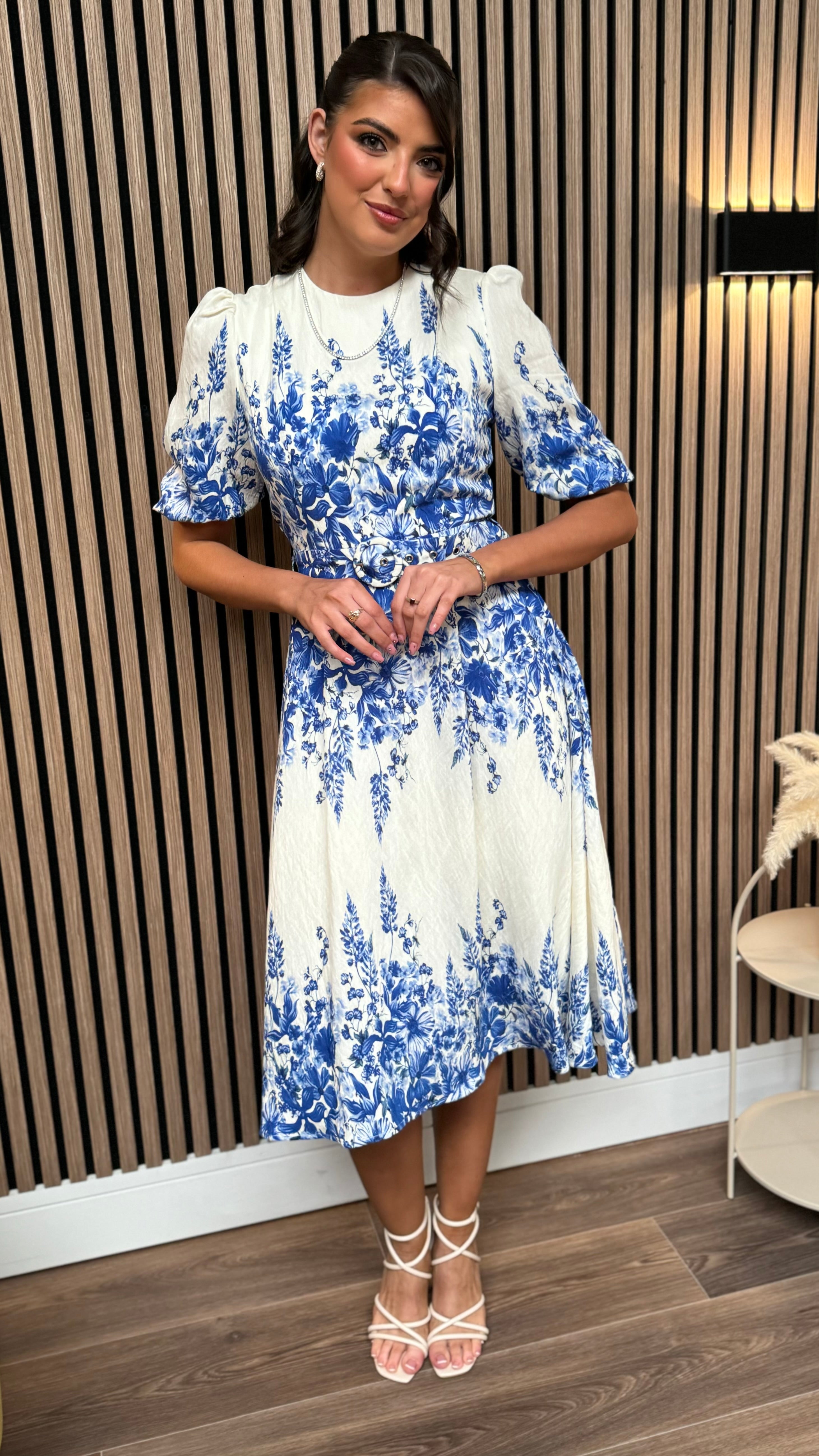 Oceana Blue Floral Round Neck Puff Sleeve Midi Dress