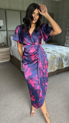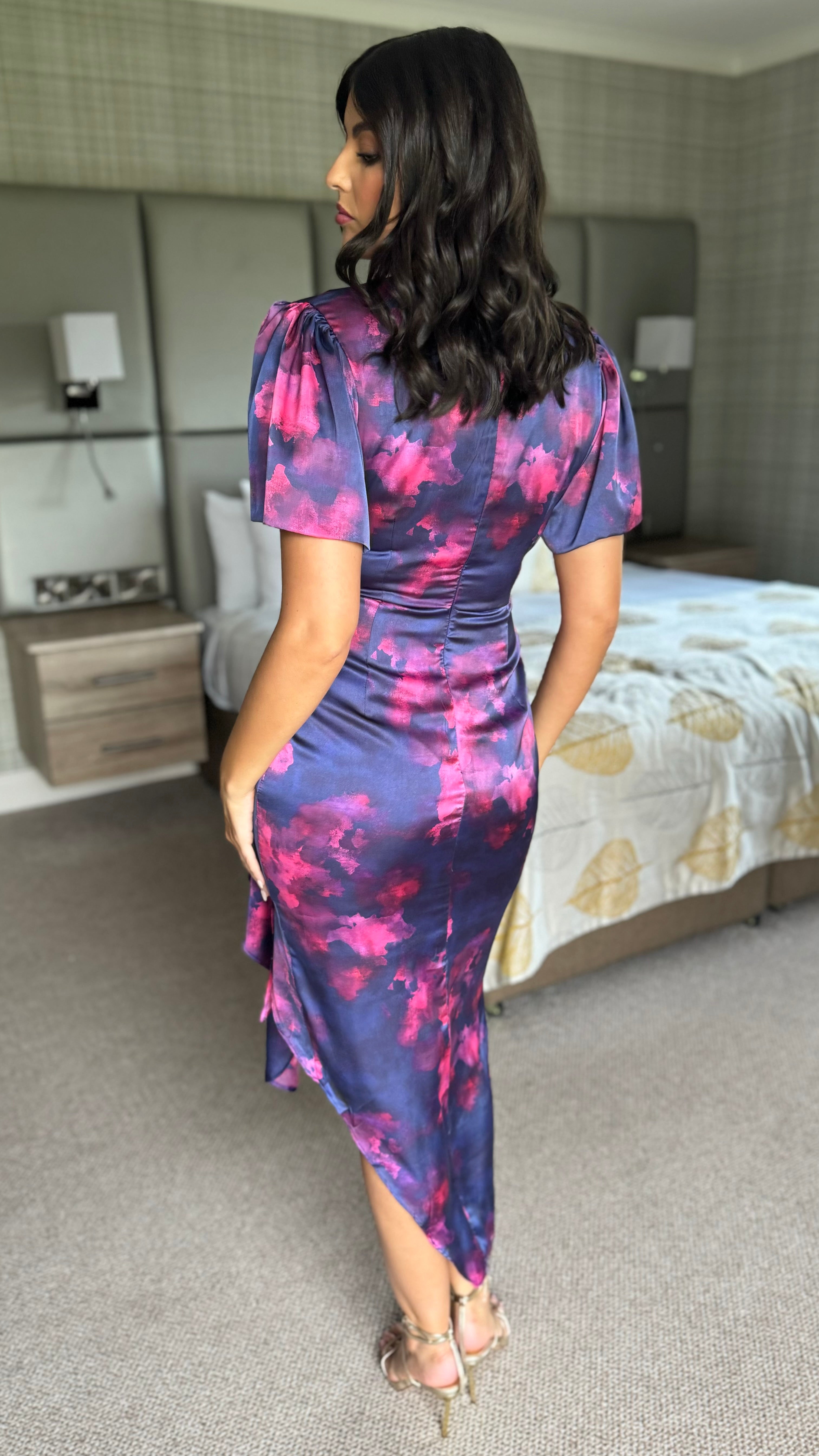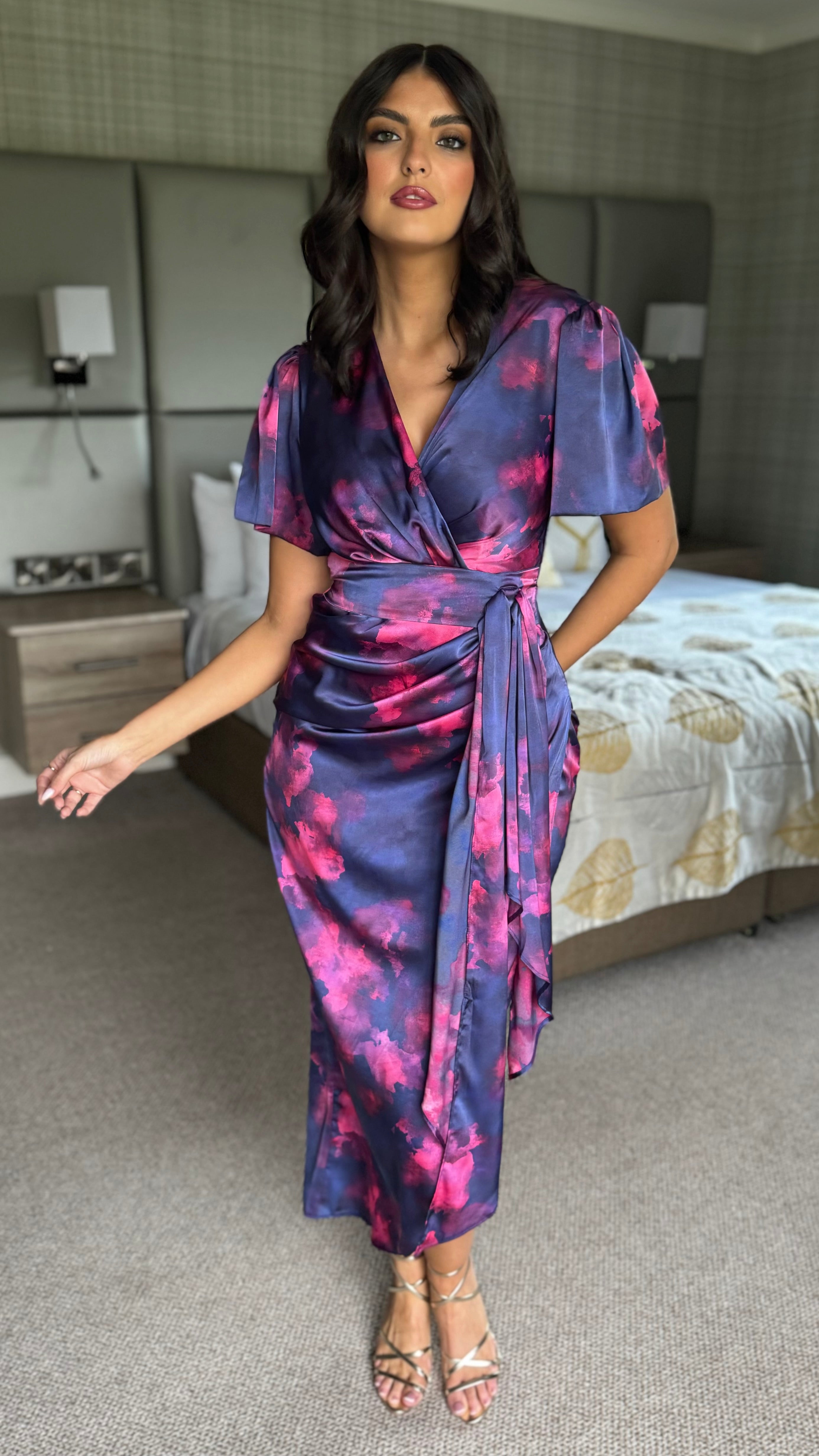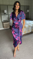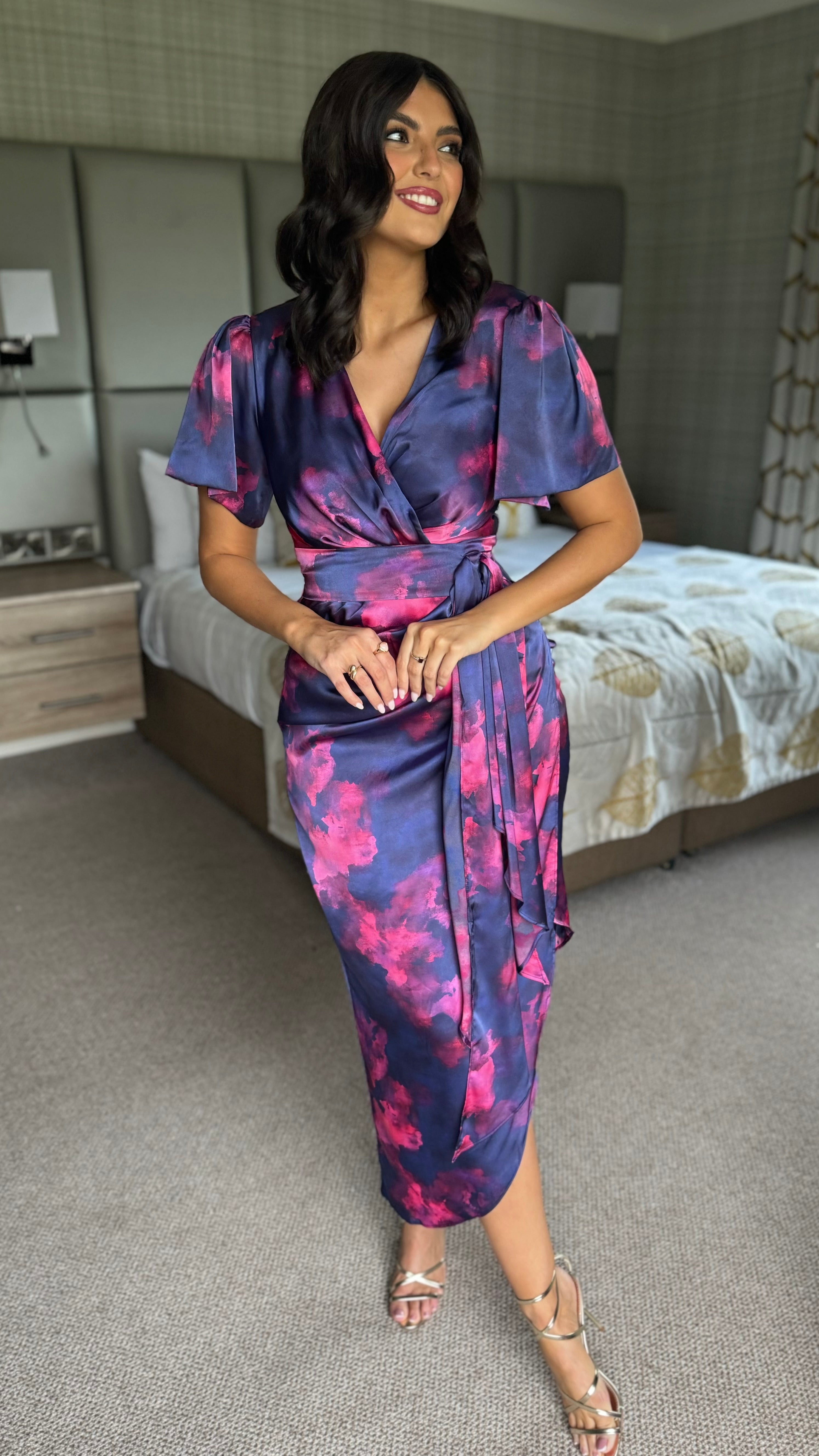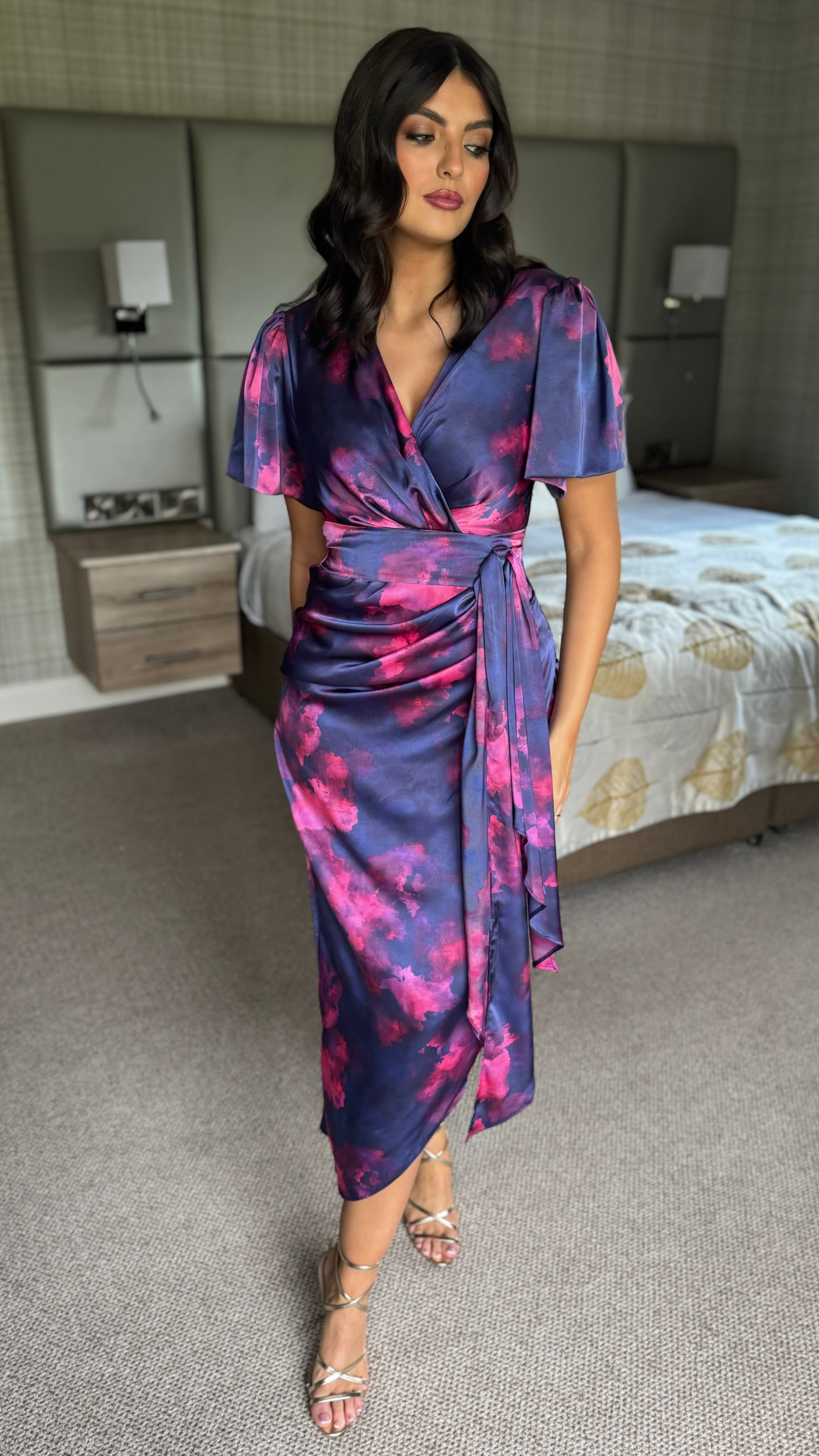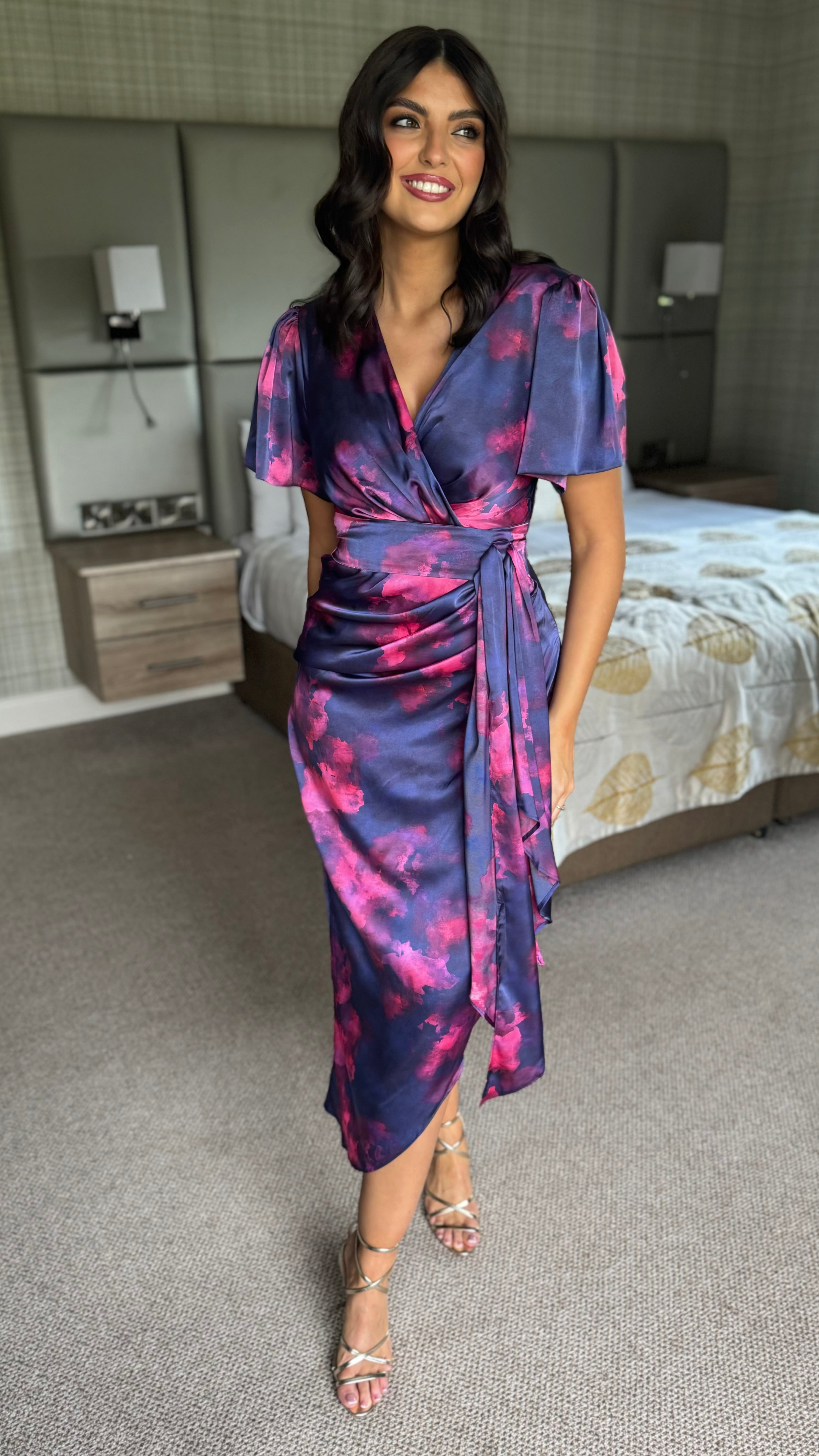 This Odabelle Blue & Pink Printed Puff Sleeve Midi Dress features a flirty wrap V neckline and playful puff sleeves for a fun, feminine touch. The ruched fabric and tie detail at the waist create a figure-flattering silhouette, while the concealed zip fastening at the back keeps the look sleek and smooth. Perfect for turning heads with effortless charm!