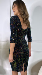 Make a statement in this Padilla Black With Multi Coloured Sequin Mini Dress! Featuring a round neckline, 3/4 sleeves, and a sultry scooped back with a split, it's perfect for any special occasion. Sparkle your way through the night and enjoy the compliments - you deserve them! 😉