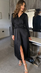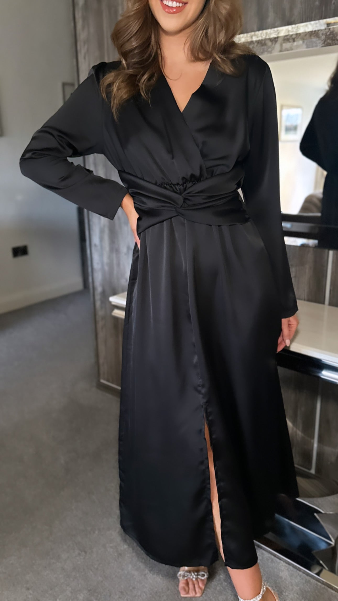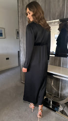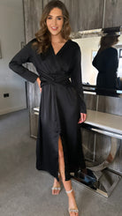 "Twirl into style with our playful Phoebe Black Bow Detail V Neckline Satin Look Midi Dress! The waist bow detail adds a flirty touch, while the front split and long sleeves keep things classy. With a flattering v neckline, it's the perfect dress for any occasion. 🎉👗"