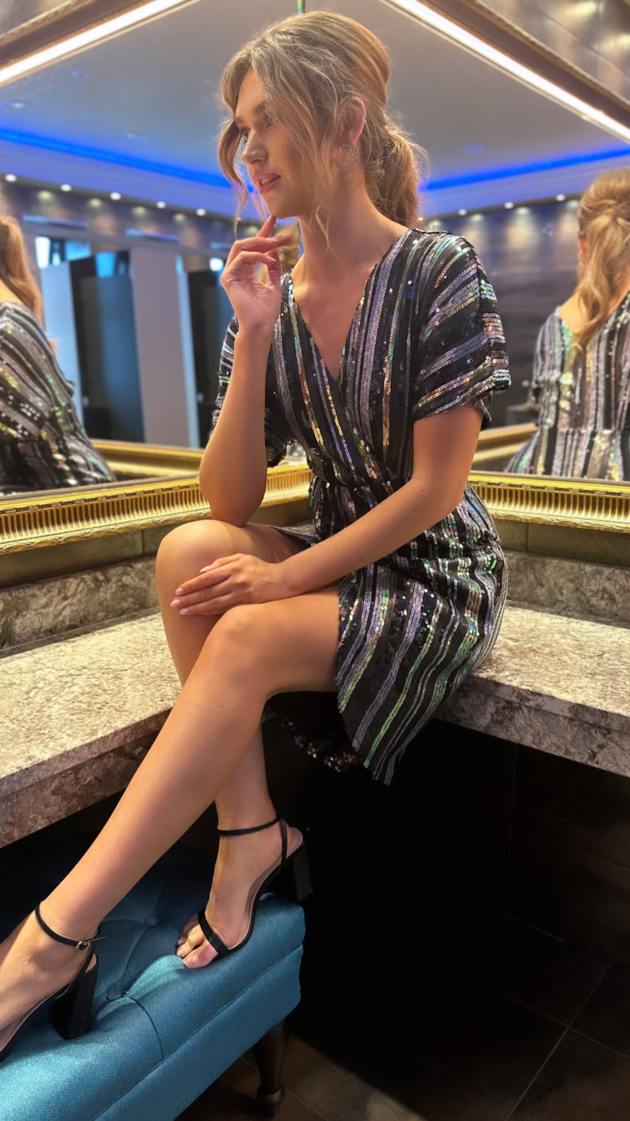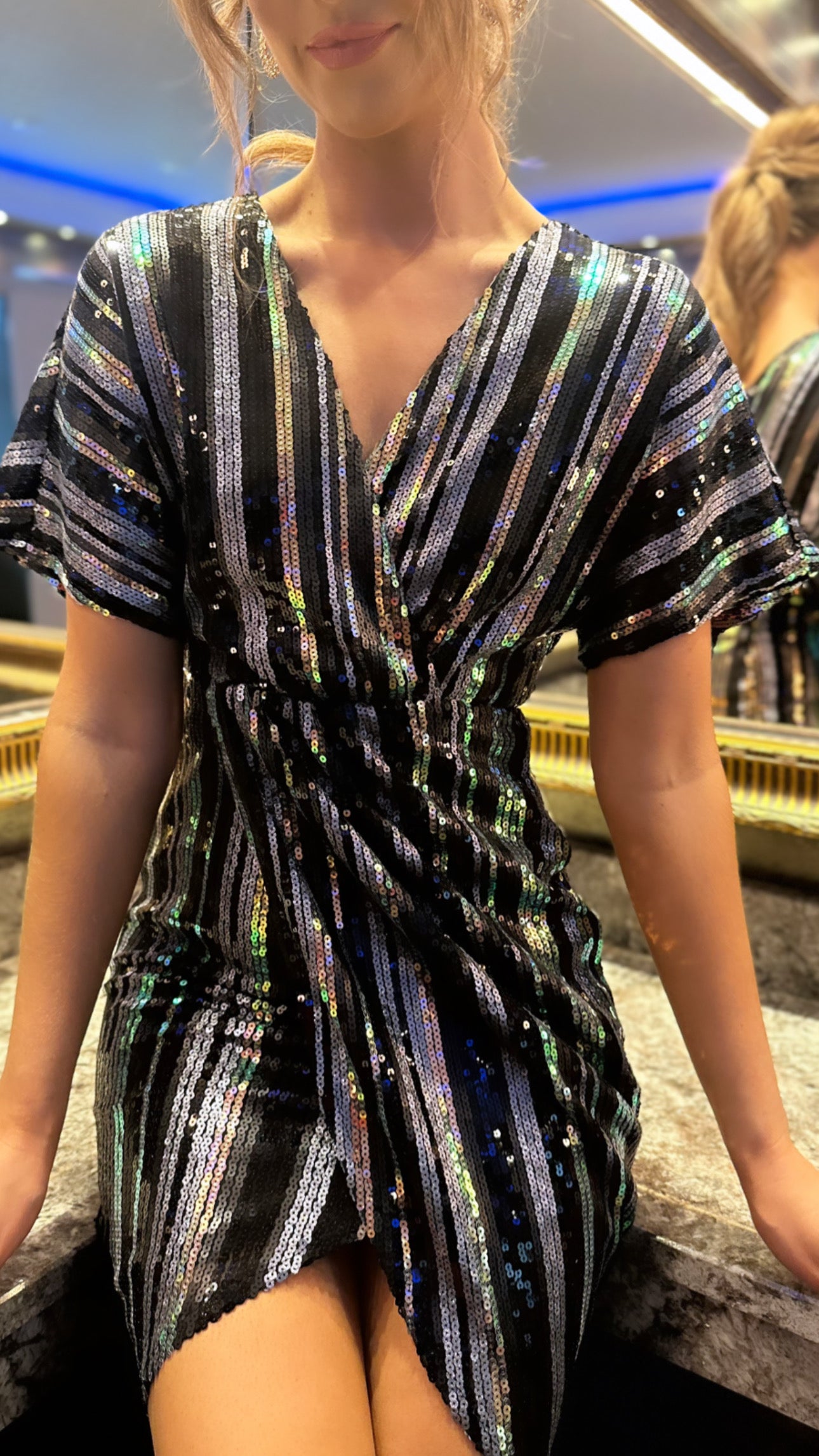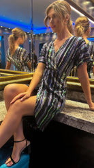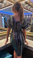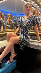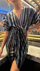 Live life in technicolor with this 🤩Poe Multi Stripe Sequin Wrap Midi Dress! Featuring bold green, gold, black, and silver stripes and dazzling sequins, this midi dress is sure to be an eye-catching addition to your wardrobe. You'll be feeling bold and beautiful wherever you go! 🤩