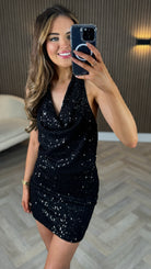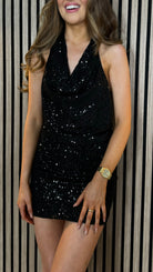 Get ready to sparkle in the Presley Black Sequin Haltereck Mini Dress. This v-neckline dress is adorned with shimmering sequins, adding a touch of glamour to your look. Perfect for a night out, this dress will make you shine and turn heads! 💫