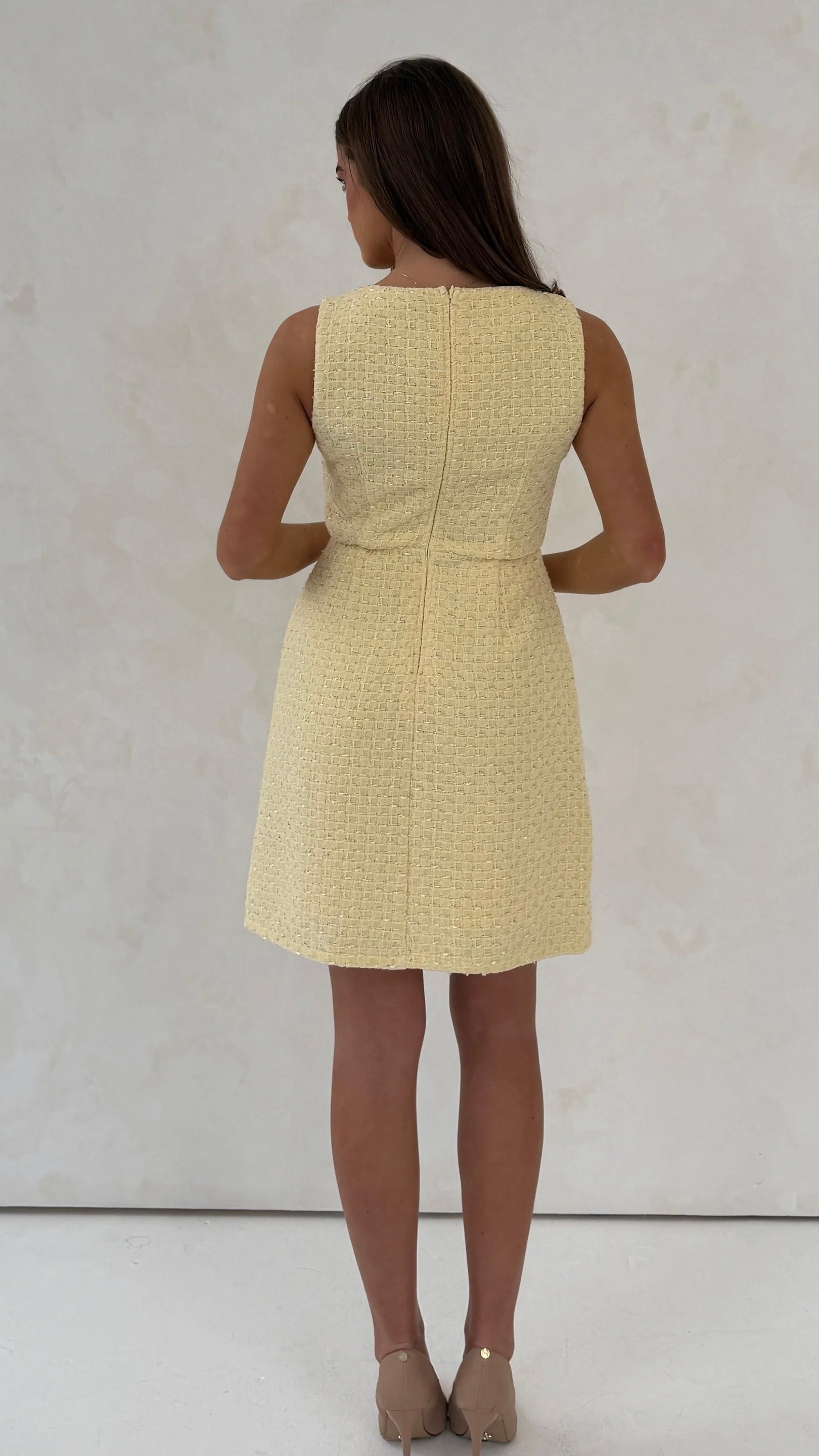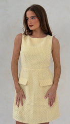 Elevate your everyday with this charming tweed mini dress, crafted in a rich yellow hue that turns heads. The classic round neckline frames your face beautifully, while functional pockets add a practical touch to this playful piece. Structured tweed fabric delivers that coveted premium feel, and the concealed back zip ensures a seamless silhouette. Perfect for brunch dates, casual outings, or whenever you want to feel effortlessly put-together. A modern take on a timeless style.