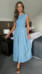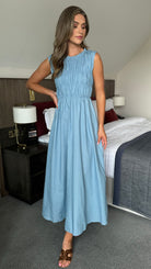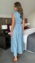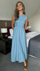 Drop everything and rock this Reign Light Blue Denim A-line Dress. The perfect balance of style and comfort, this dress will make you feel like the queen of the day. Pair it with your favourite sneakers for a casual look or dress it up with heels for a night o17.ut!