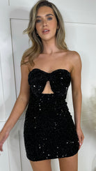 Reina Black Sequin Bow Detail Cut Out Strapless Mini Dress