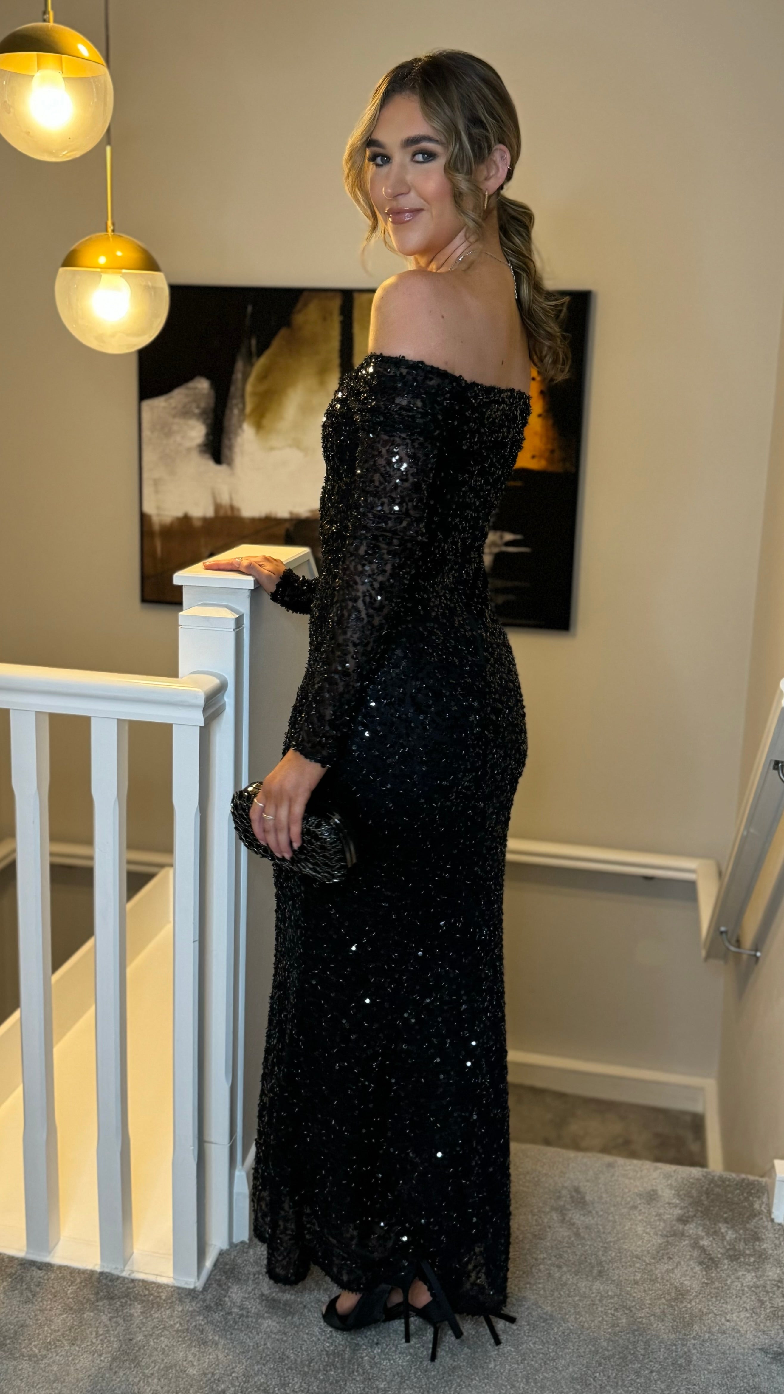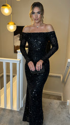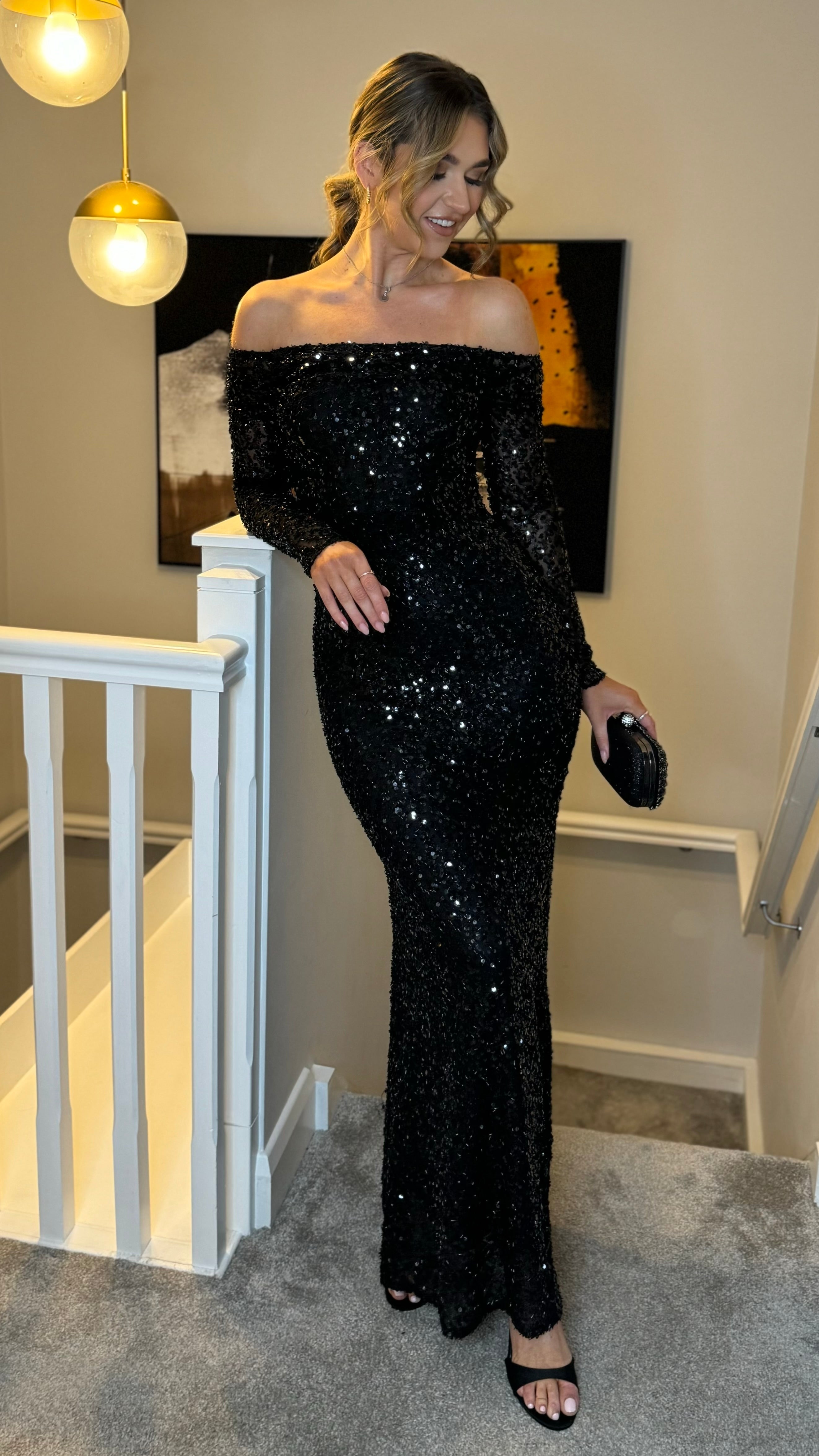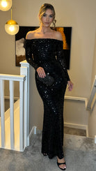 Rio Black Sequin Detail Off Shoulder Long Sleeve Maxi Dress