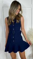 This Rosie Navy Belted Button Down Shirt Dress is a must-have for any fashion-forward individual! Featuring gold buttons, a collared neckline, and a belted waist, this sleeveless dress is both chic and versatile. Perfect for a casual day out or a night on the town! 😍