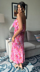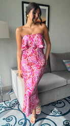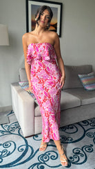 Embrace your style with the Ruby Pink & Purple Floral Strapless Midi Dress. Its soft ruffle details and strapless cut offer a graceful silhouette, while the vibrant floral print brings a joyful, uplifting vibe. Ideal for any occasion where you want to feel confident and radiant. Let this dress be your go-to for effortless elegance! 🌷💖🌿