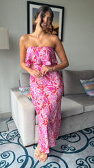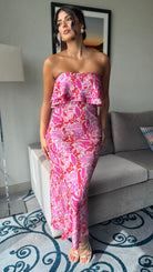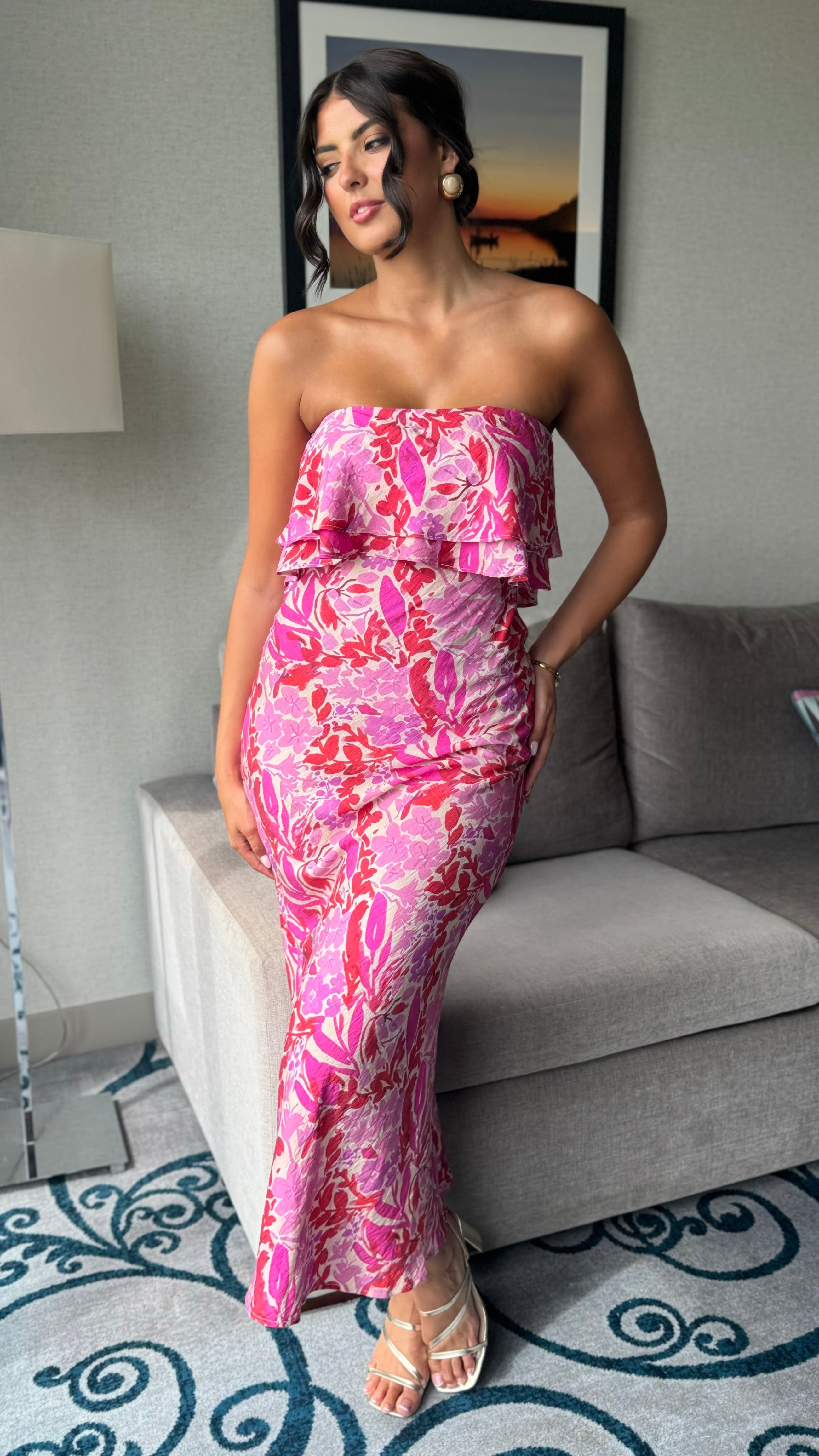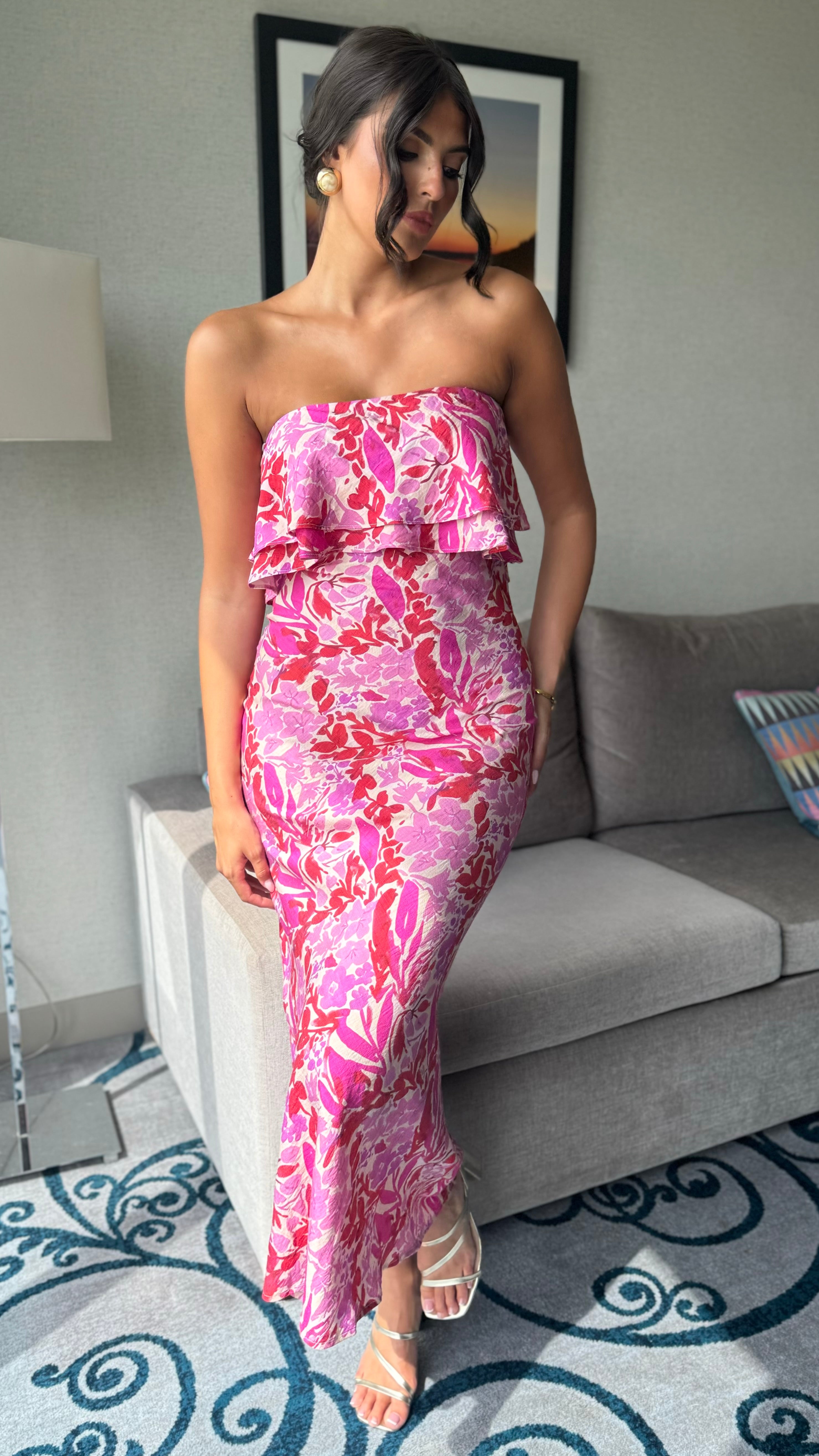 Ruby Pink & Purple Floral Strapless Ruffle Detail Midi Dress