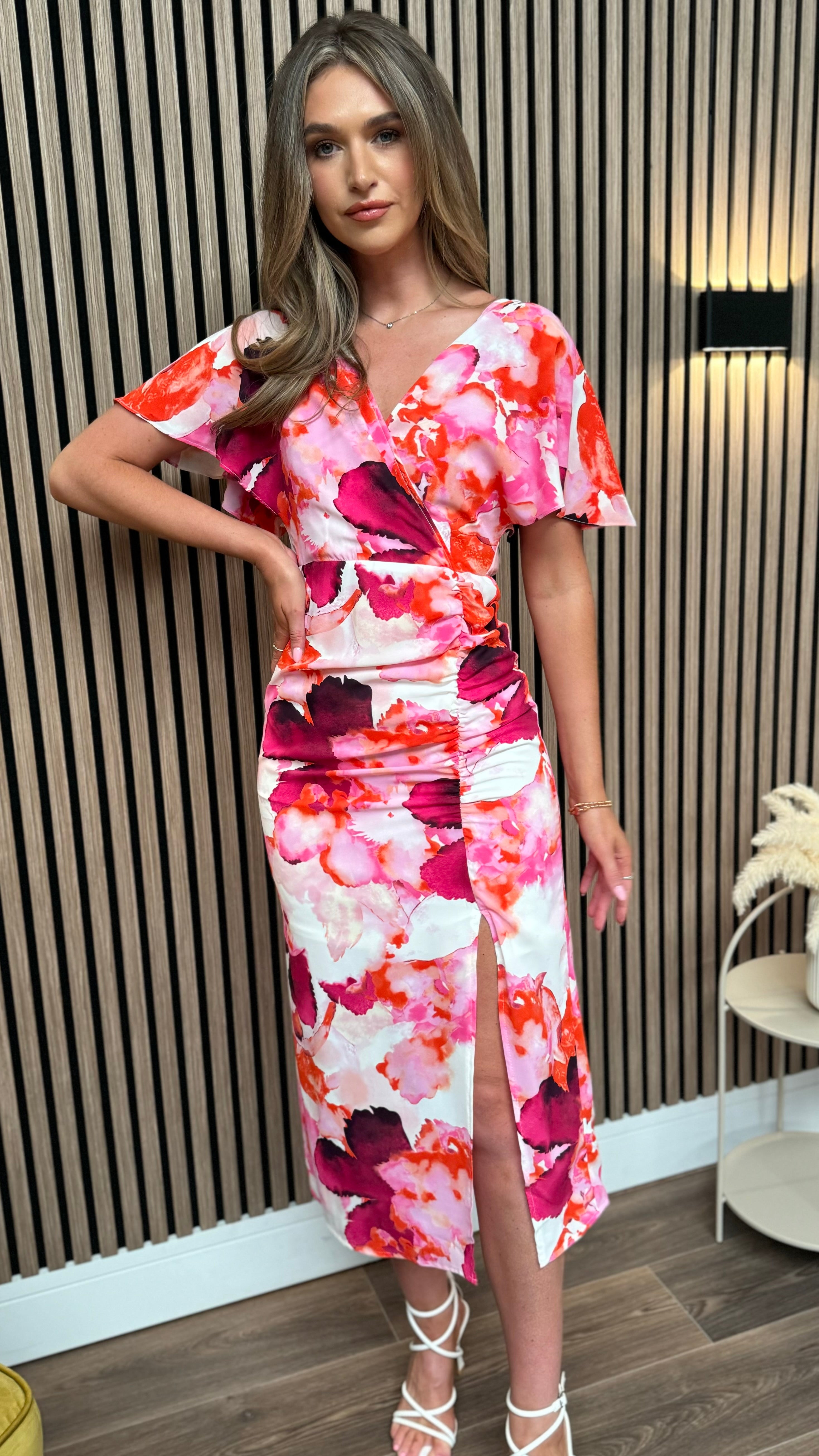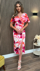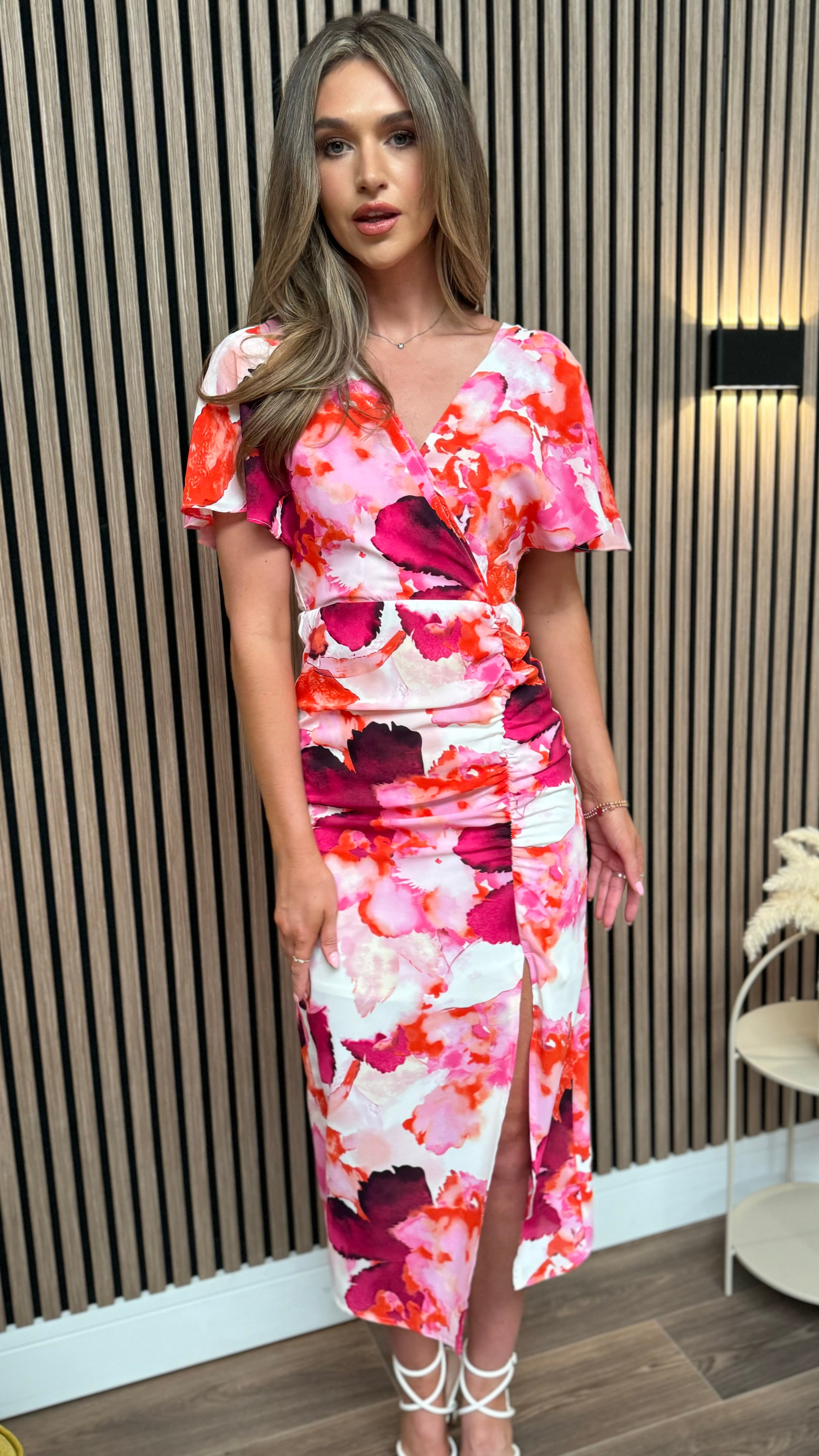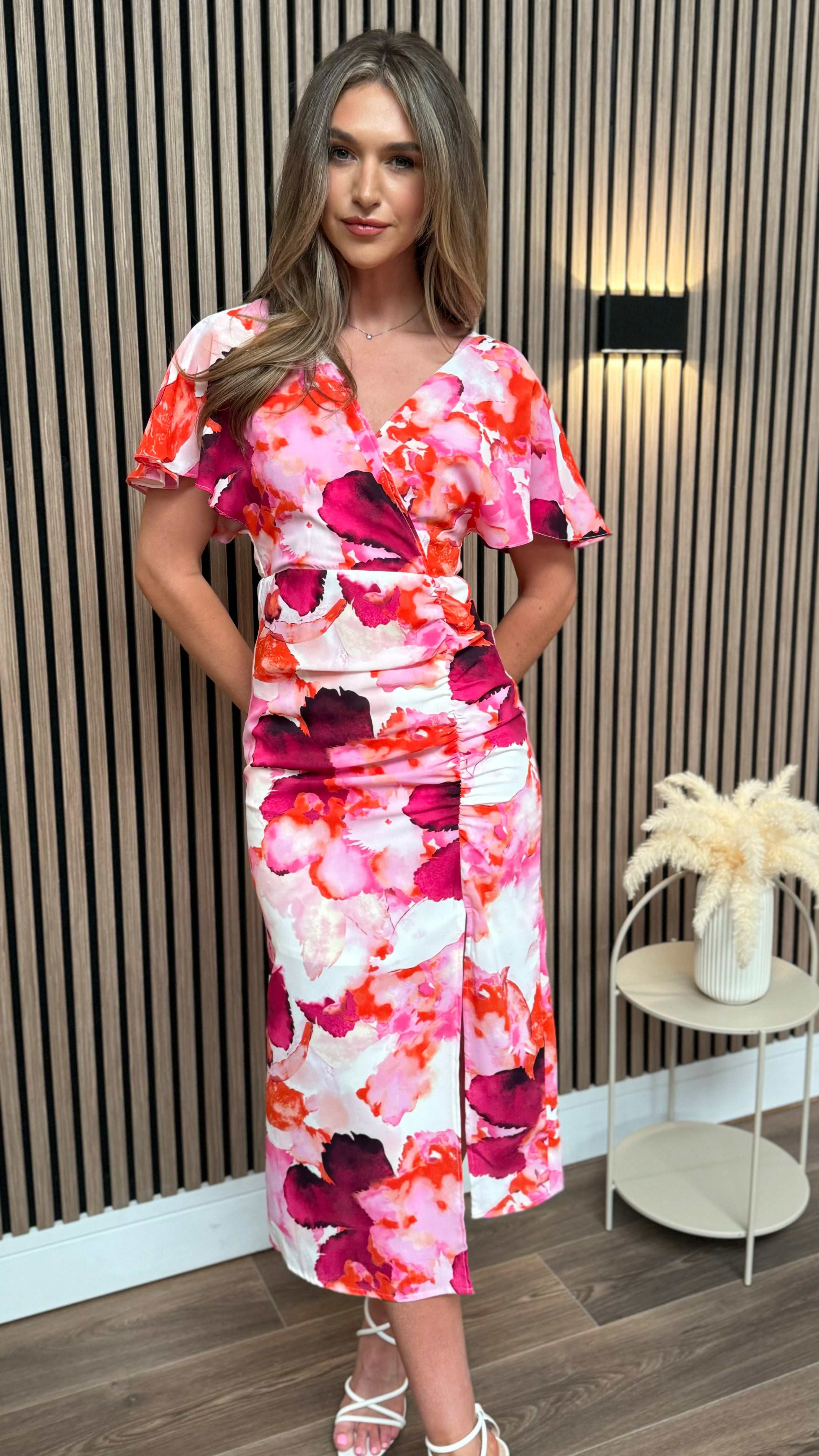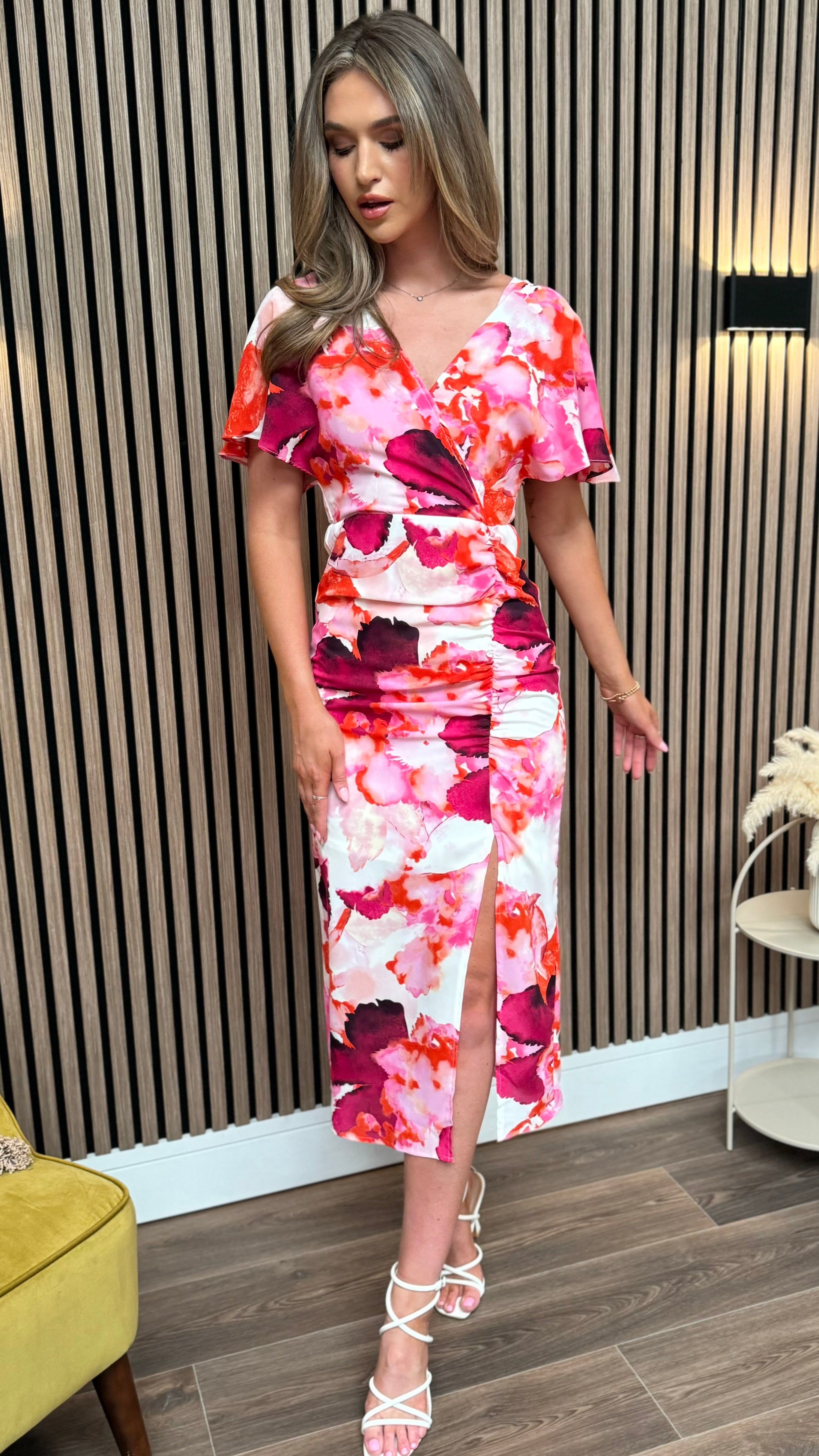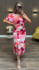 Introducing our Shaleen Pink Abstract Wrap Top Ruched Detail Midi Dress, the perfect addition to your wardrobe this season. It features a flattering wrap over neckline and batwing style sleeve, with an elasticated waistline for a figure-enhancing fit. The ruched skirt leads to a daring thigh high split, while the modest hemline adds a touch of elegance. Complete the look with your favorite jewelry and heels for a glamorous and sophisticated ensemble.