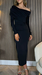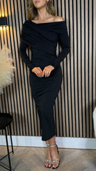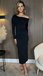 Sheridan Black Off Shoulder Wrap Effect Midi Dress