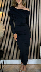 Wrap yourself in chic style with the Sheridan Black Off Shoulder Midi Dress! This elegant dress features long sleeves and a flattering wrap effect top. Perfectly fitted for a stunning silhouette. Perfect for any occasion! 💃