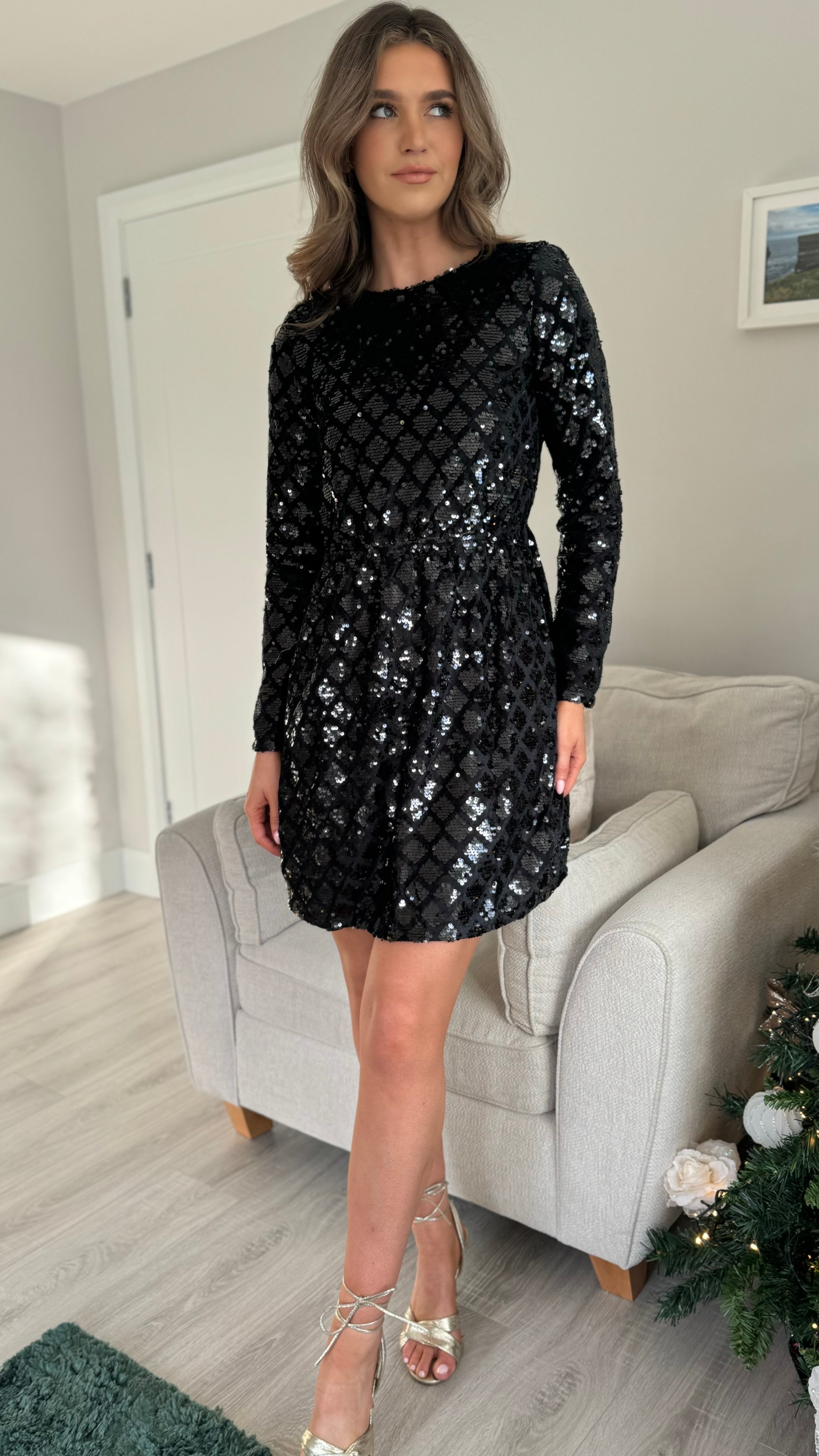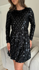 Shimmer and shine in our Tamara Black Sequin Printed Mini Dress. With a unique diamond shape print and playful back cut out, this dress is perfect for any occasion. The elasticated waist ensures a comfortable and flattering fit while adding a touch of sparkle to your look.
