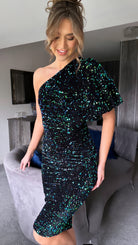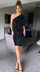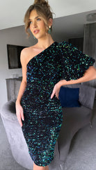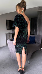 Tennessee Green & Black Velvet Sequin One Shoulder Midi Dress