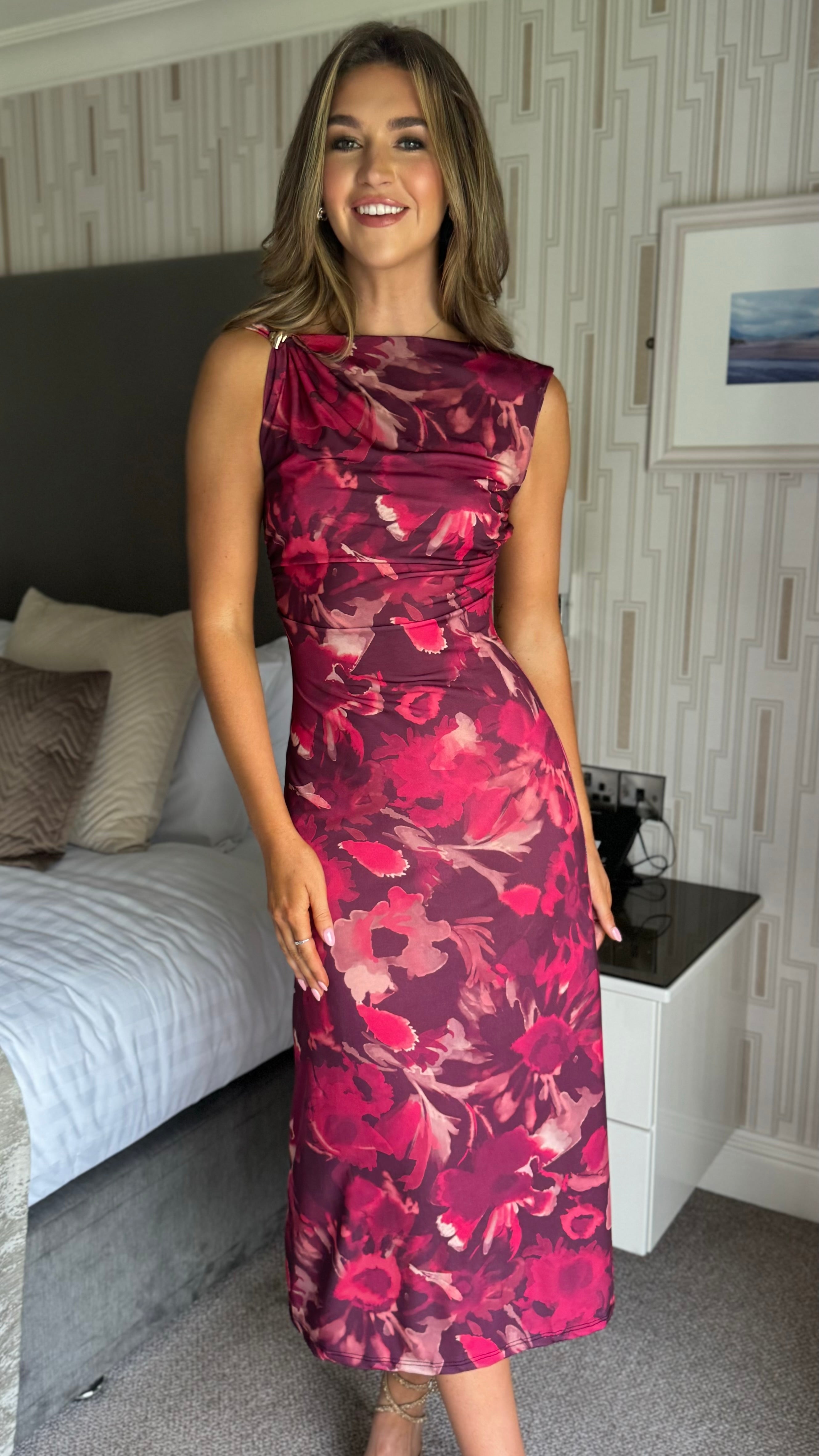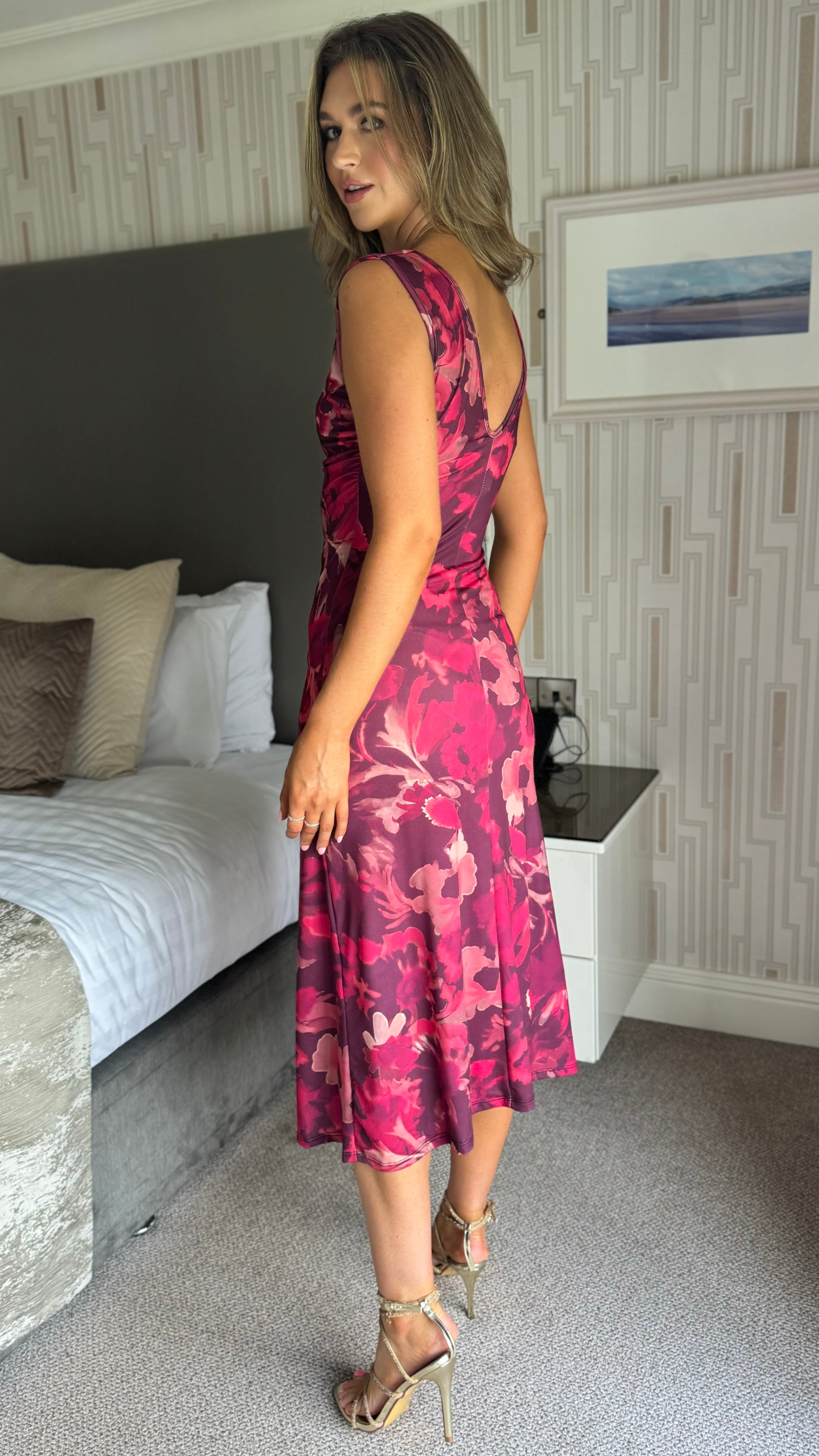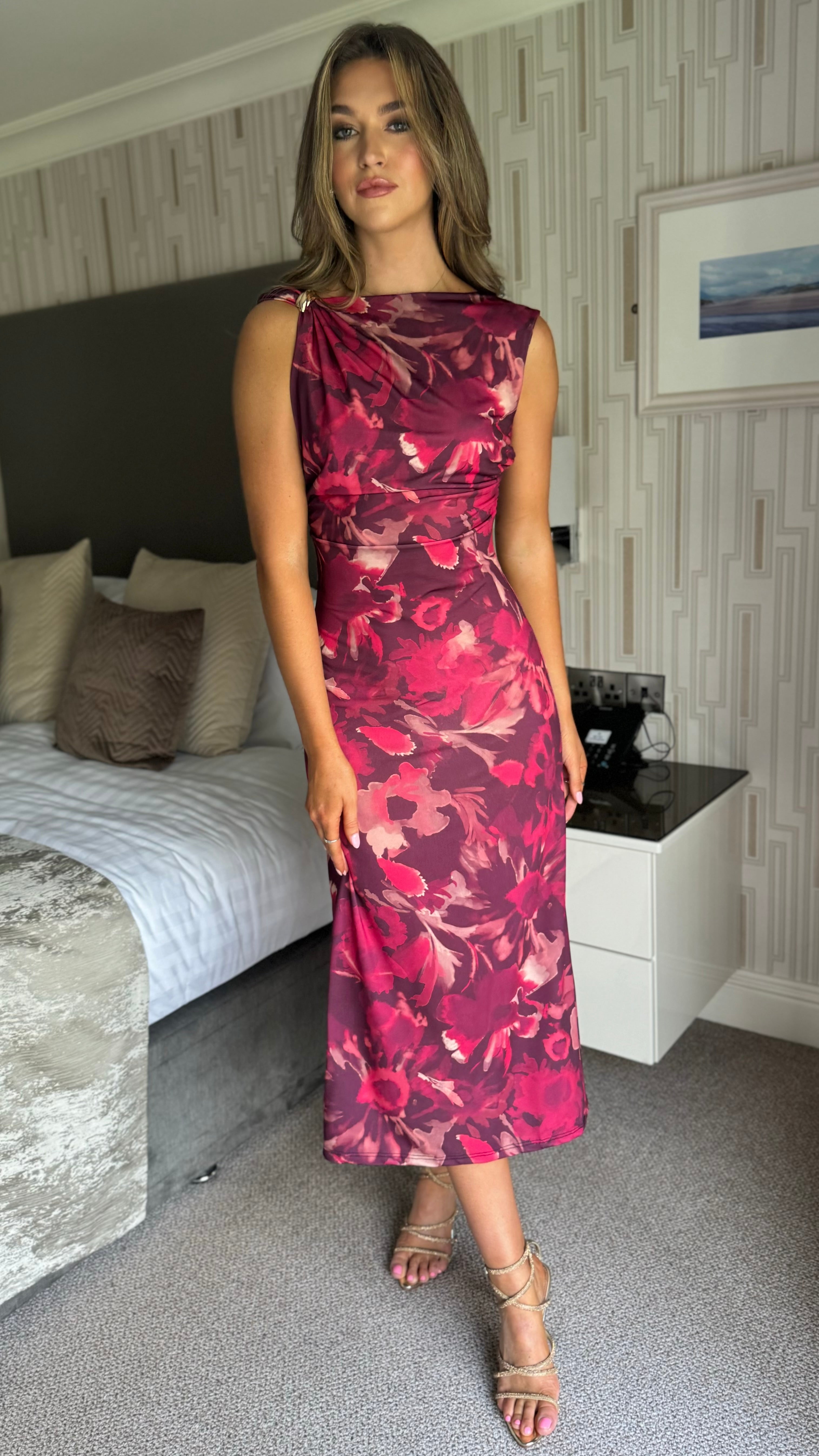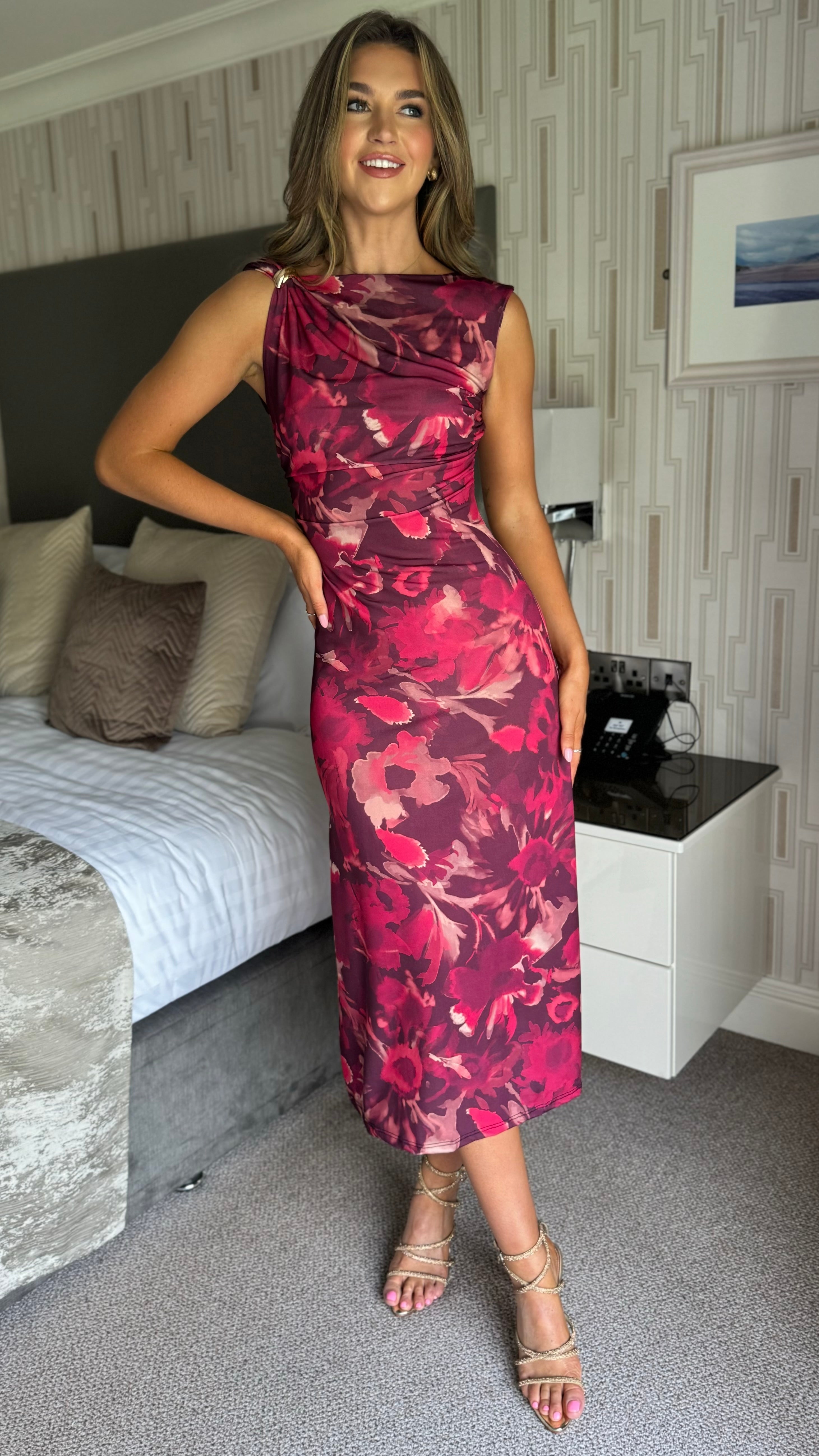 Elevate your wardrobe with the Vanessa Burgundy Floral Asymmetric Neckline Midi Dress. Featuring a striking asymmetric neckline and elegant gold detailing, this dress draws attention with its twisted shoulder design. The ruched details enhance the silhouette for a figure-flattering fit, while the midi length offers a perfect balance of sophistication and style.