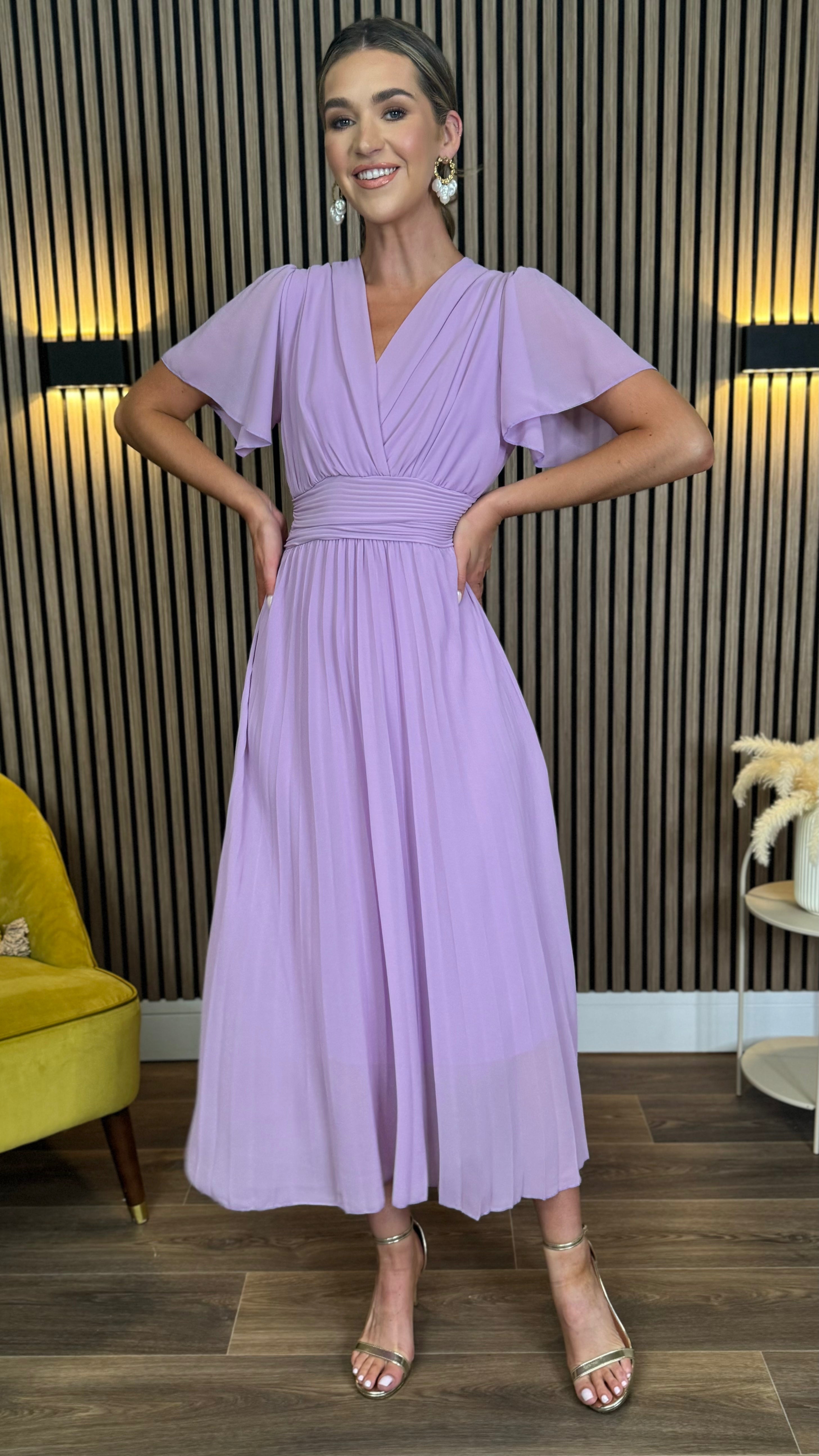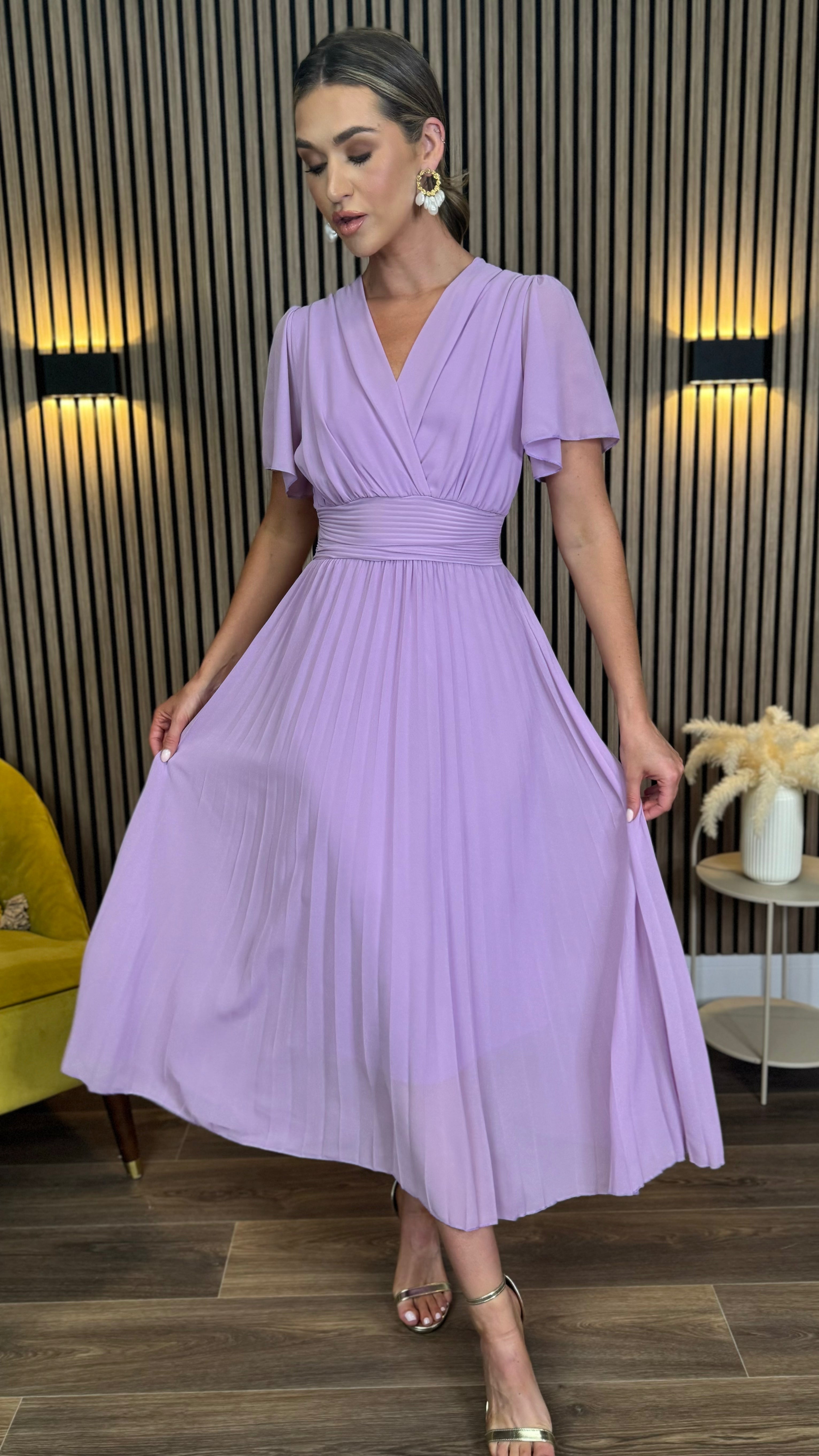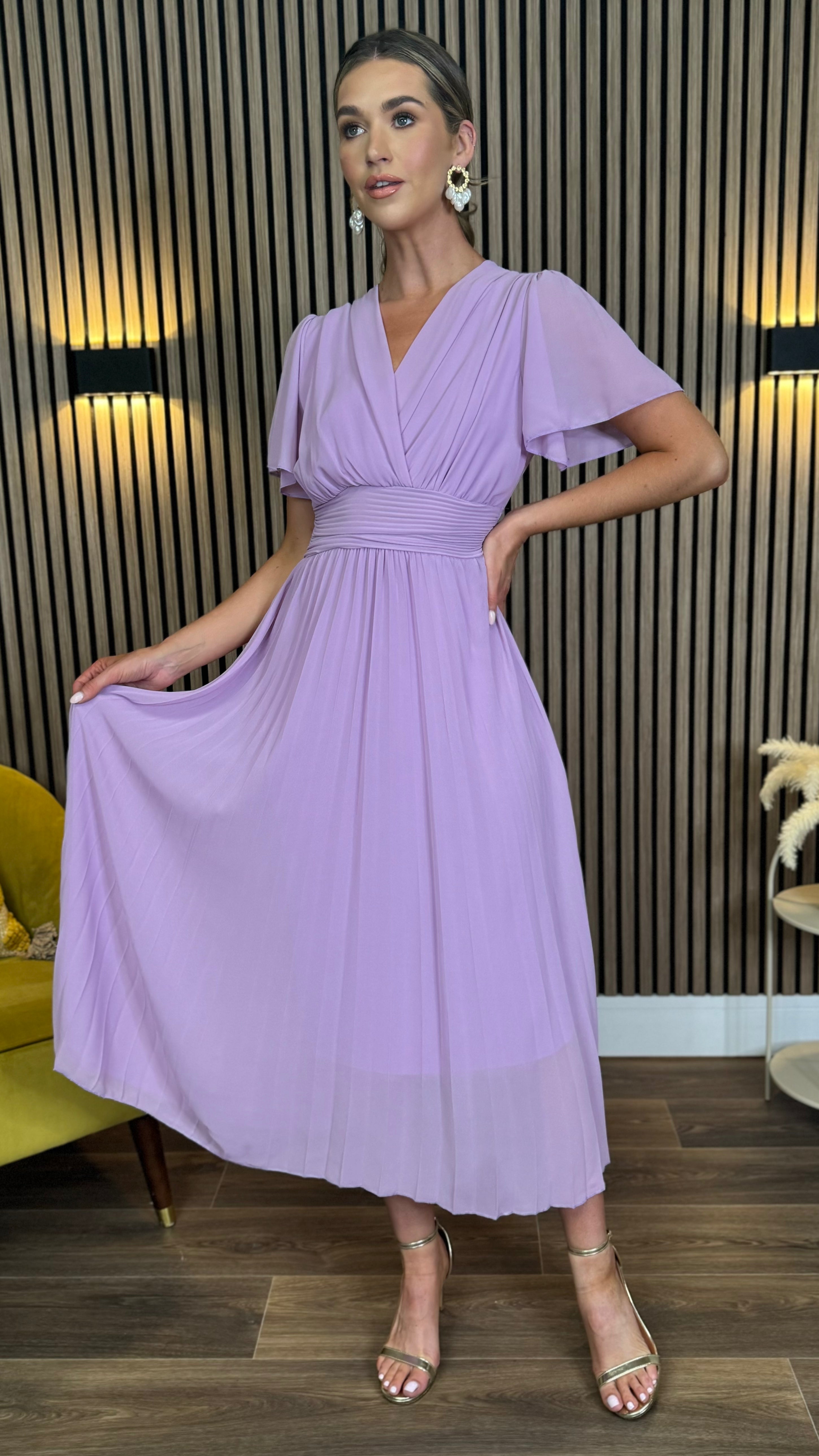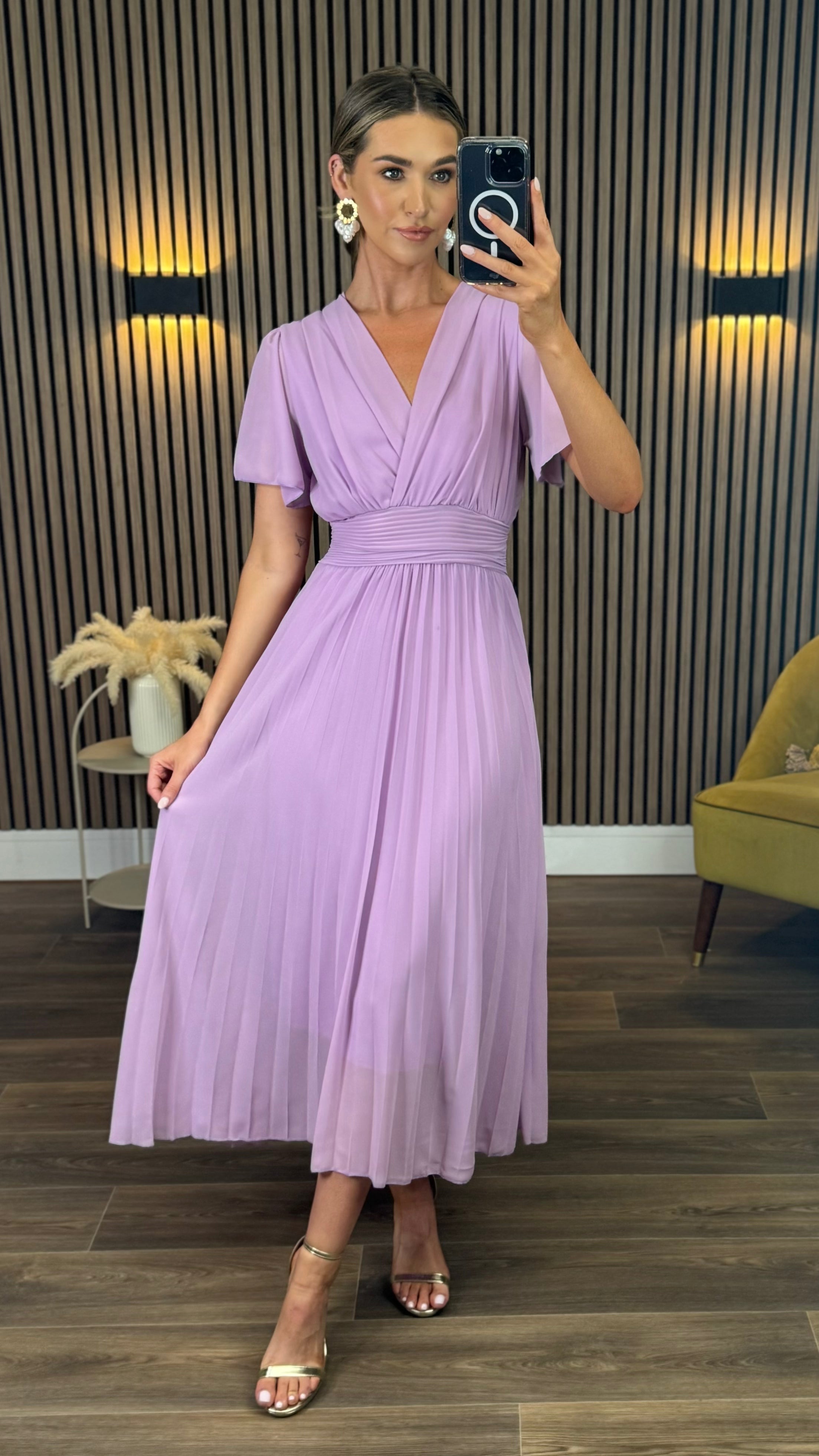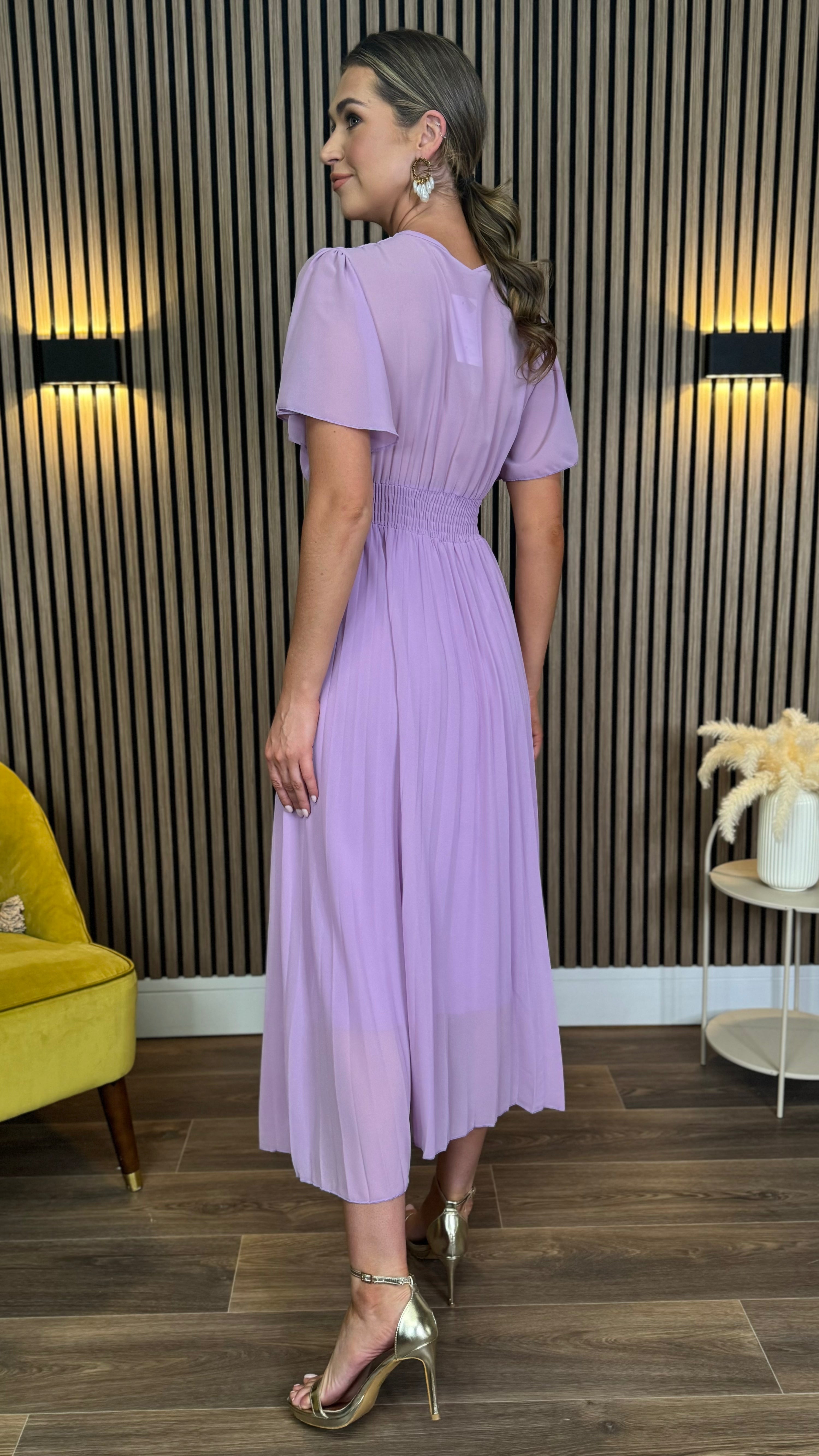 Get ready to make a statement in our Wavery Lilac Pleated V Neck Midi Dress. Featuring a unique pleated design and a playful v neck, this dress will add a touch of quirkiness to your wardrobe. Perfect for any occasion, this dress will have you feeling confident and stylish!