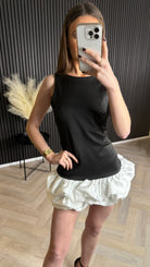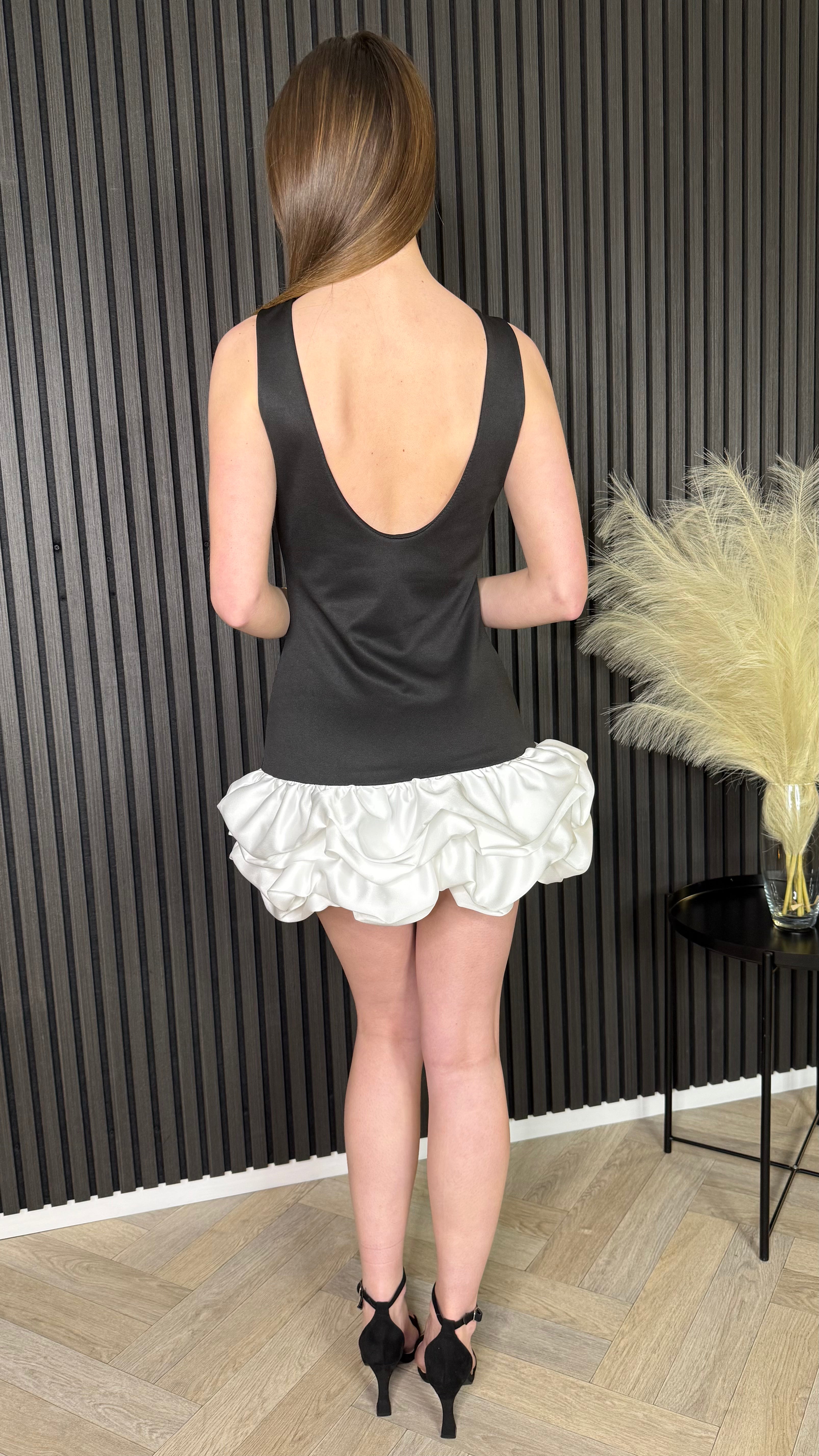 Be the life of the party in the Yvette Black With White Bubble Hem Mini Dress. This playful and stylish mini dress features a unique bubble hem and sleeveless design, making it perfect for dancing the night away. Don't be afraid to stand out and have some fun in this eye-catching dress!