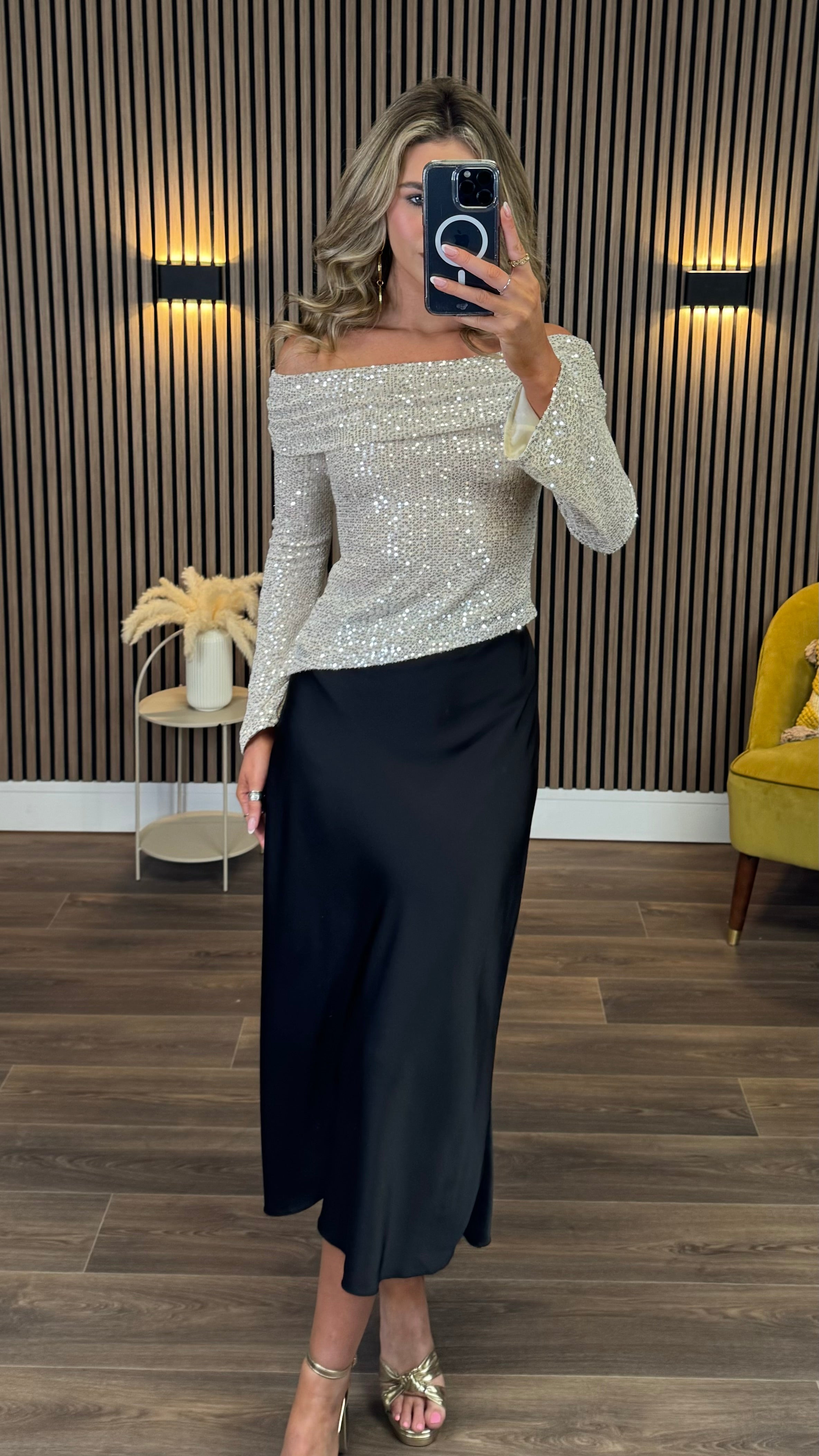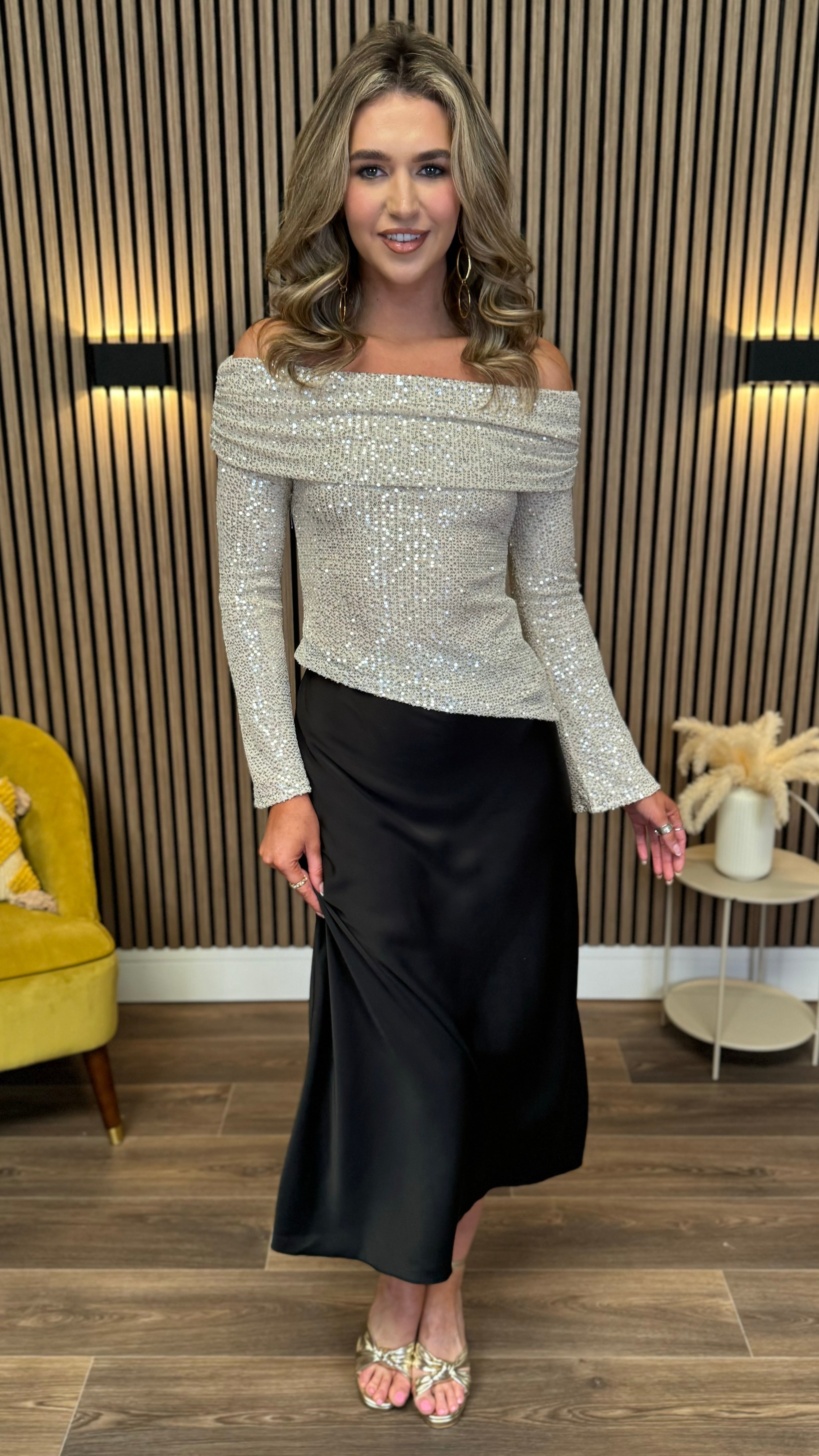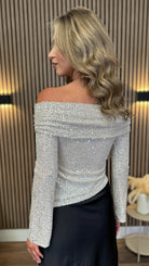 Turn heads in the Jessie Cream Off-Shoulder Sequin Top! Featuring a playful asymmetric hem and a draped bardot neckline, this top effortlessly blends charm and sparkle. The whimsical bell sleeves add a fun twist, while the full sequin coverage guarantees all eyes on you. Perfect for making every moment shine with style and confidence.