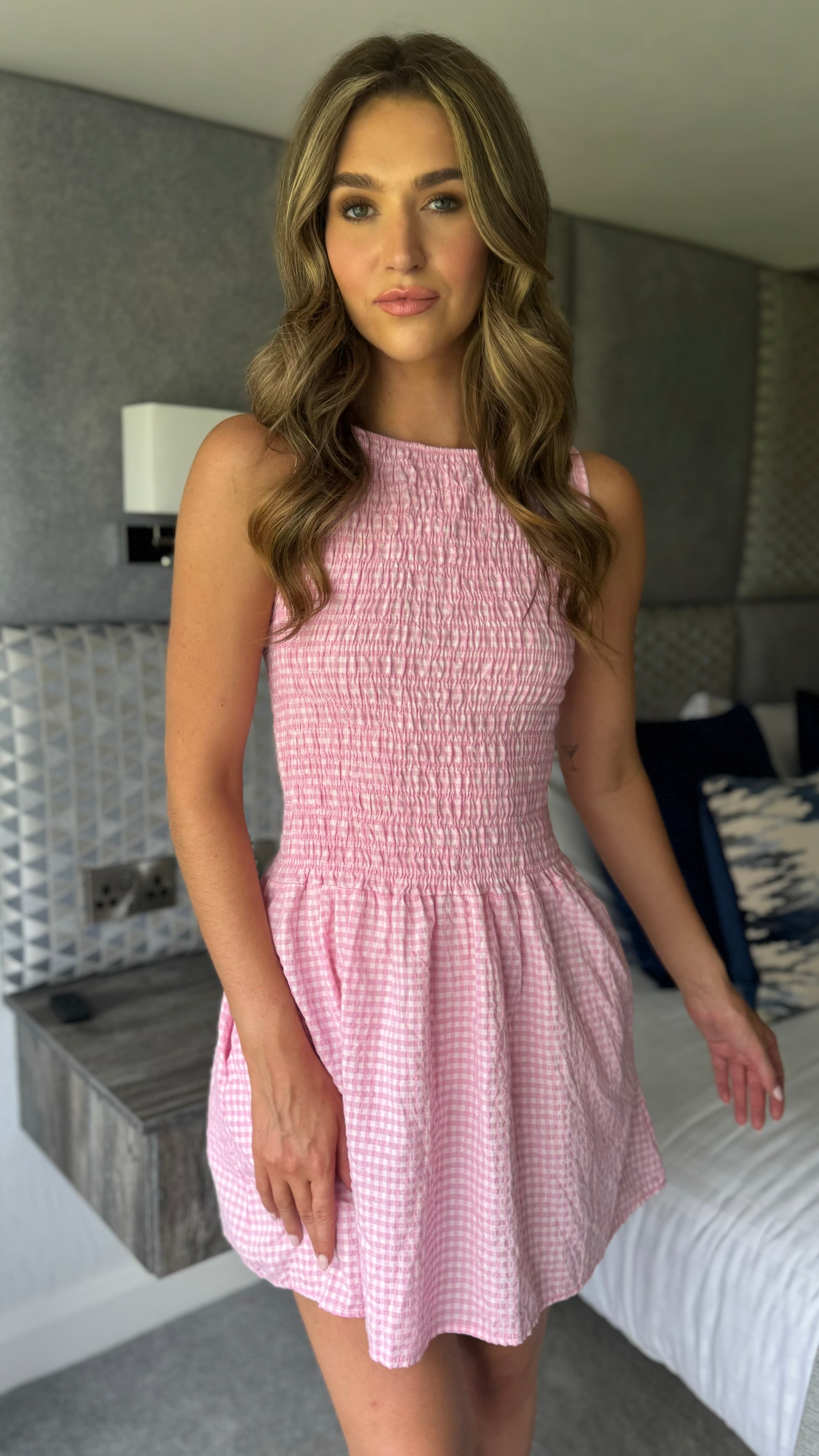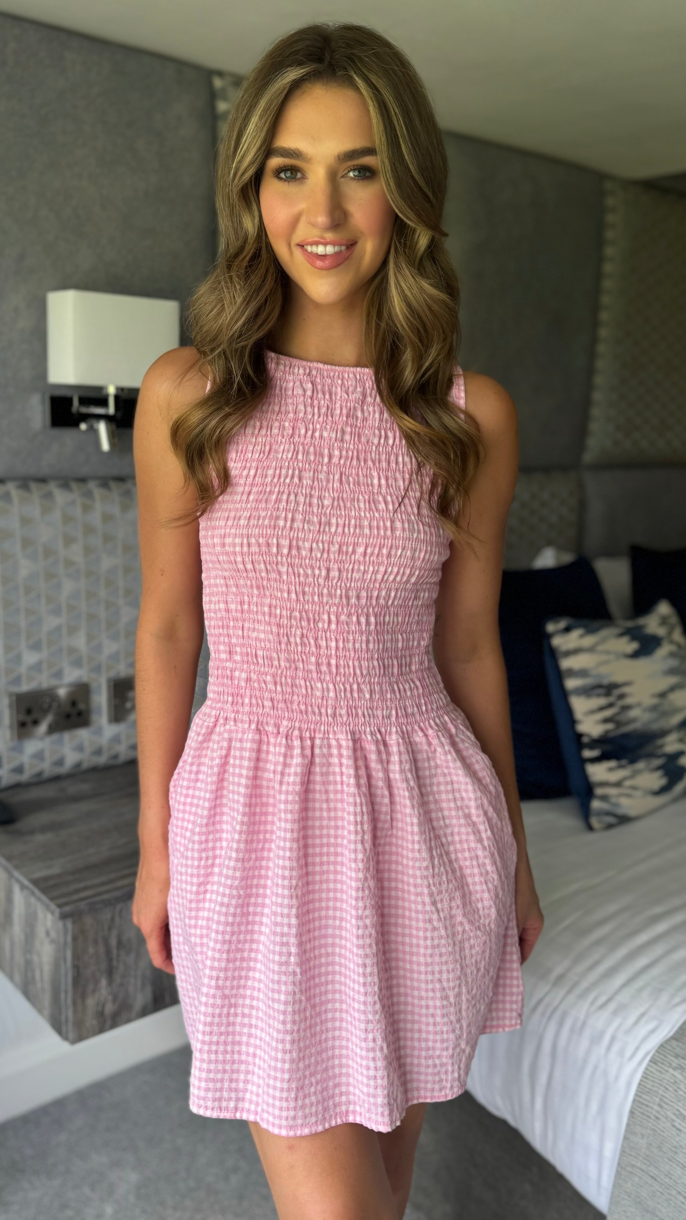 Lotta Pink Gingham Shirred Sleeveless Mini Dress