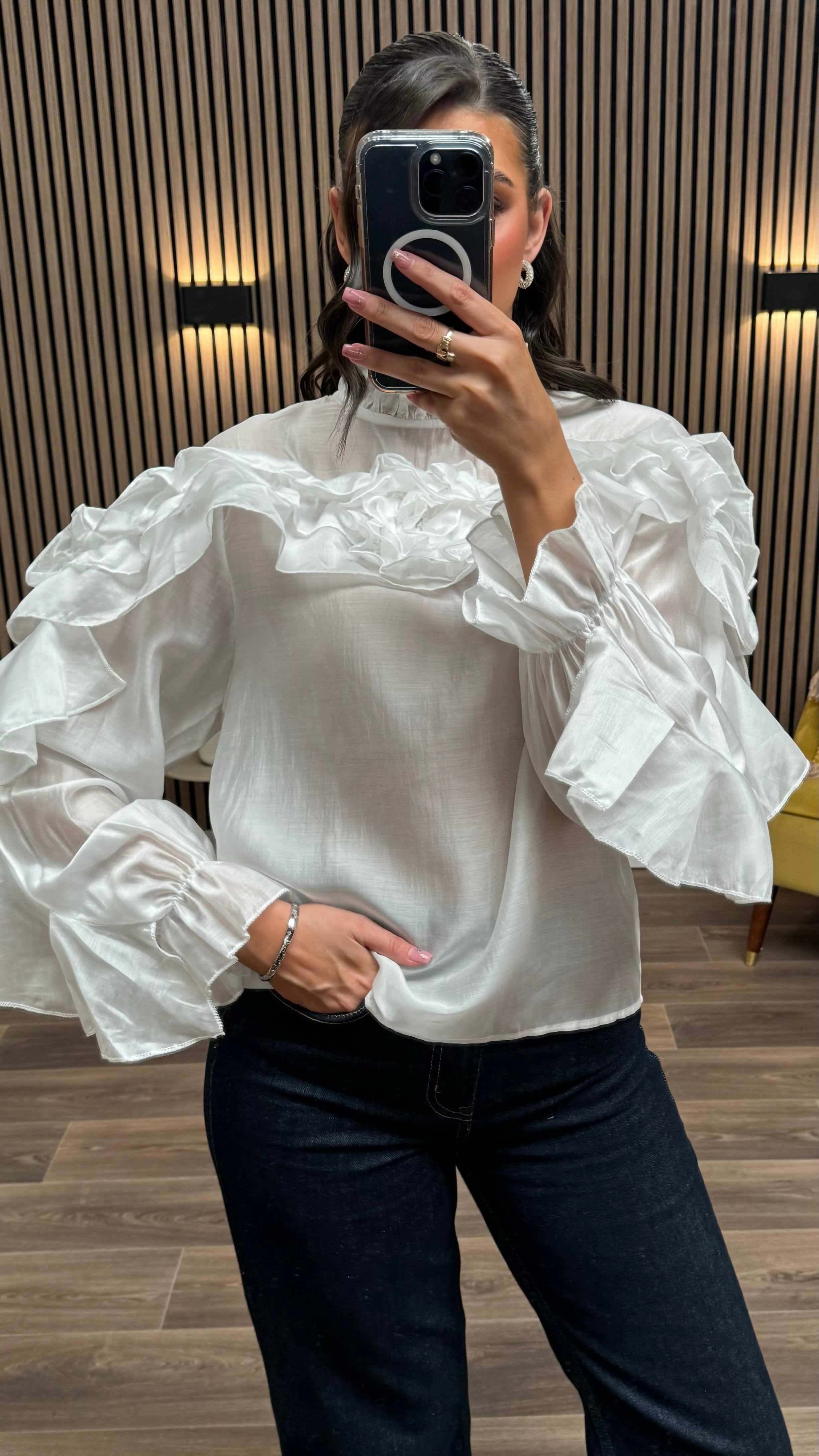 Get ready to turn heads with the Maxine White Frill Detail High Neck Top! 🌸 This unique top features delicate flower details and a flattering frill and high neck design. With long sleeves, you'll be stylish and covered all night long. 💕