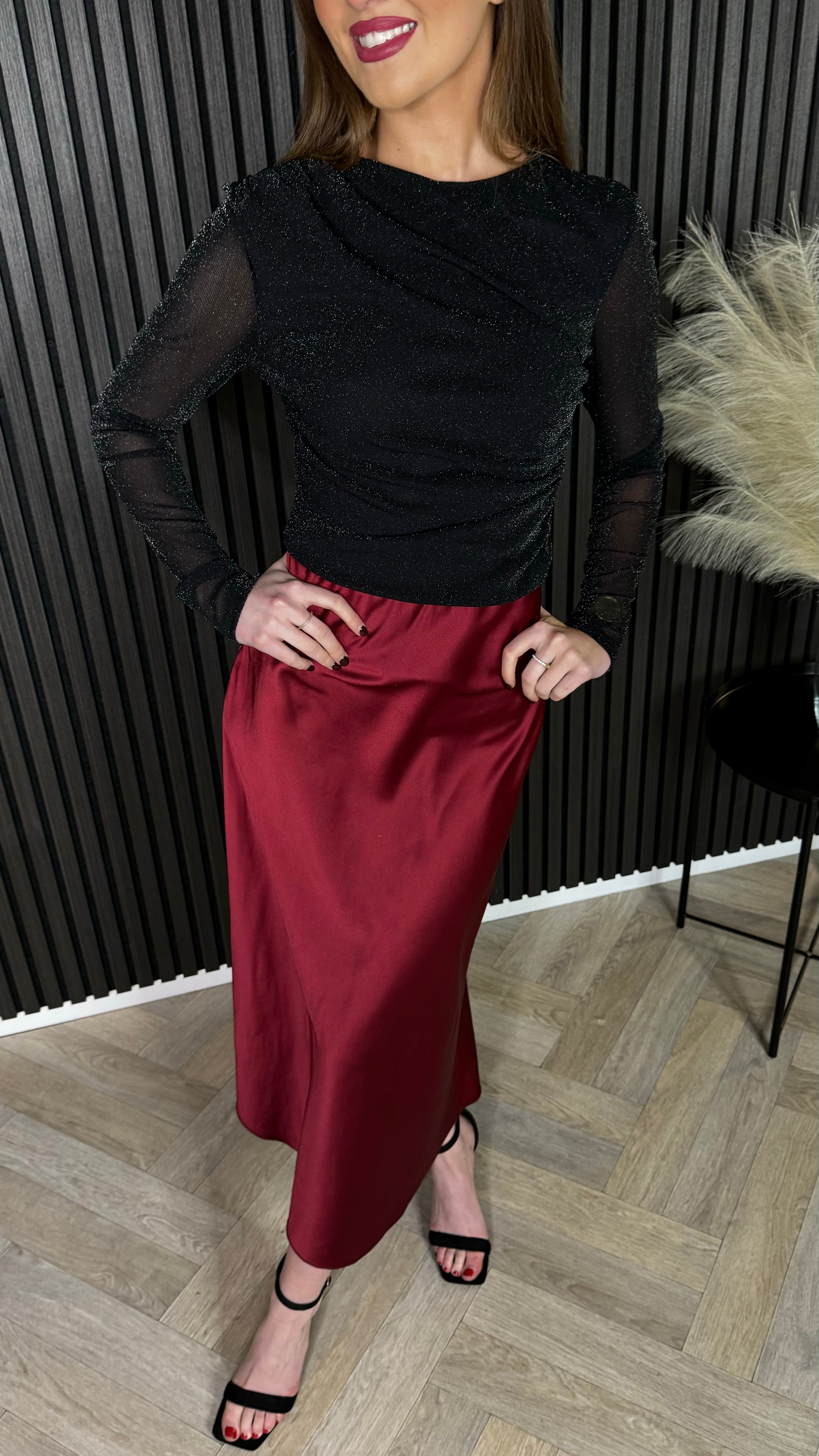 Add some sparkle to your wardrobe with the Muireann Black Sheer Sleeve Lurex Top. With its eye-catching Lurex fabric and wrapped round neckline, it's the perfect combination of glamour and comfort. The long mesh sleeves and ruched side detail add a touch of uniqueness to this playful piece.