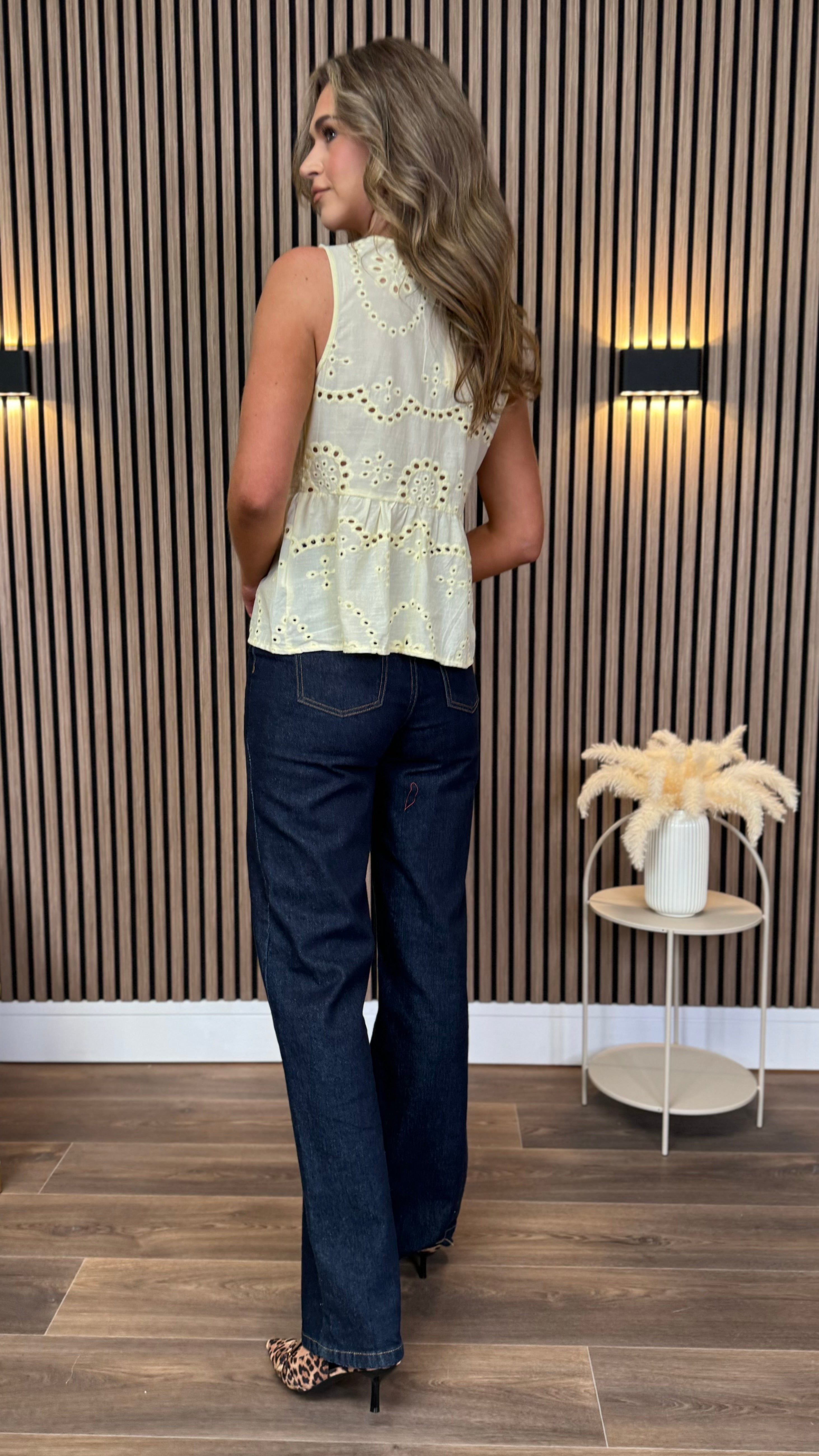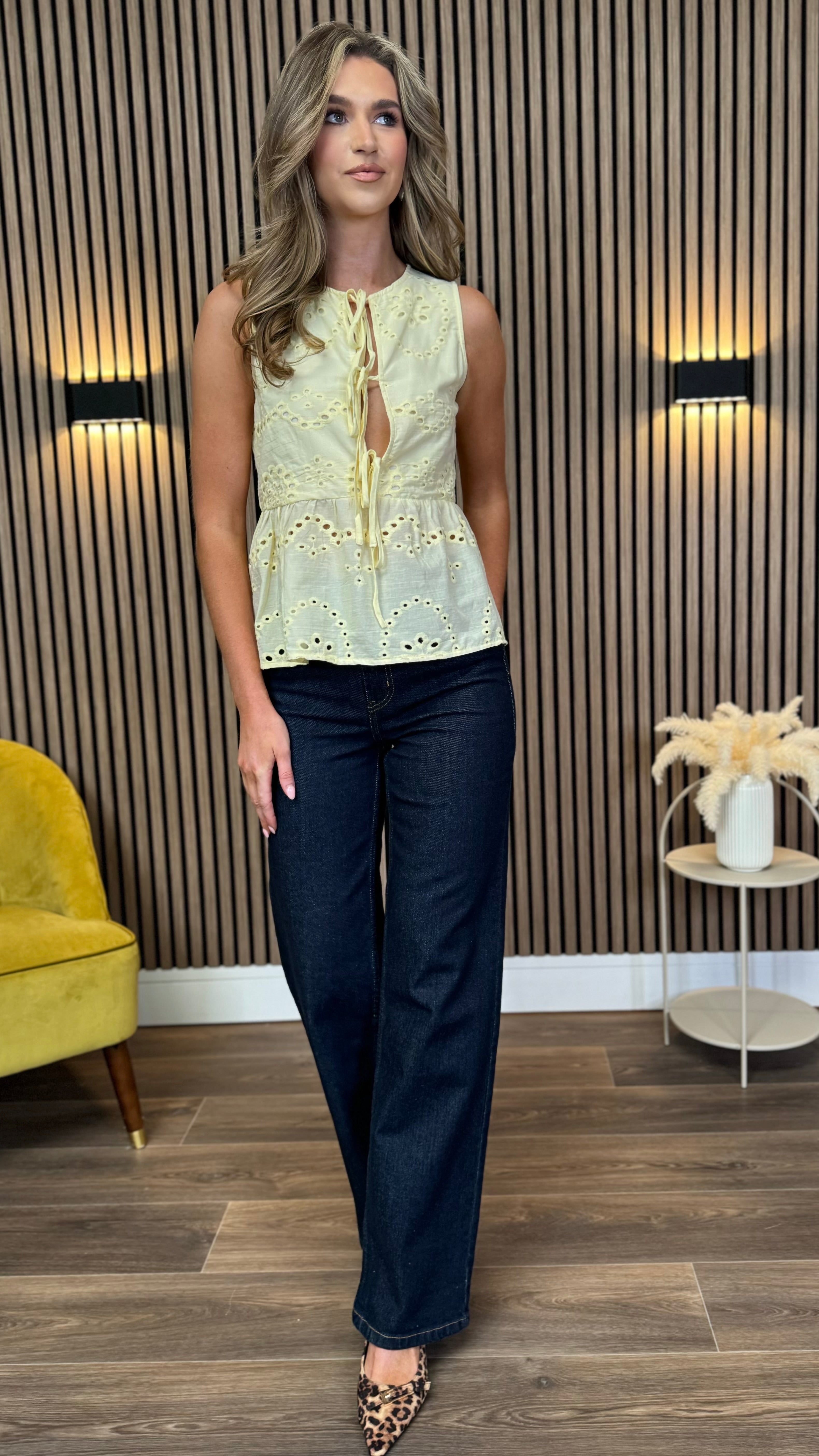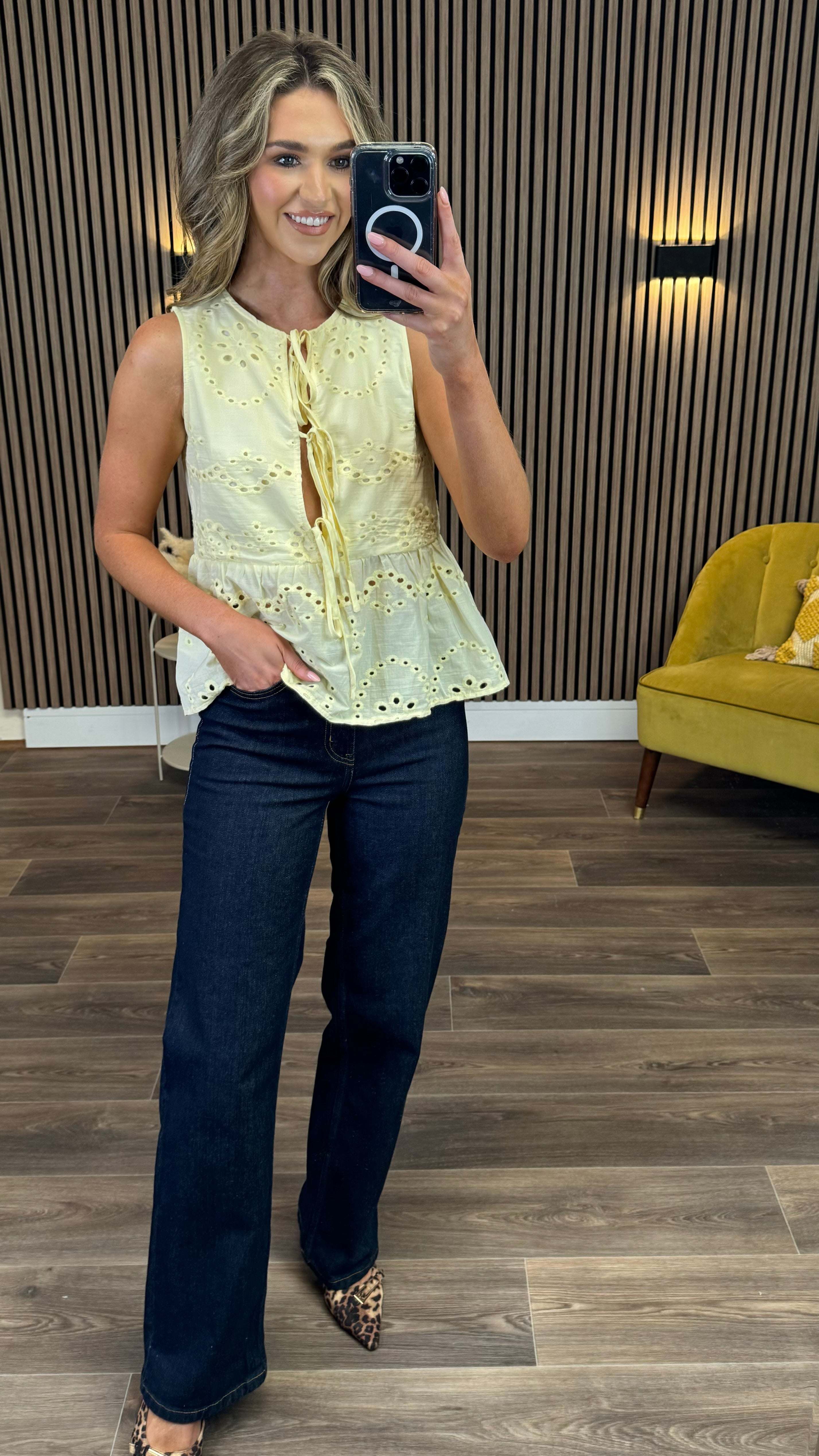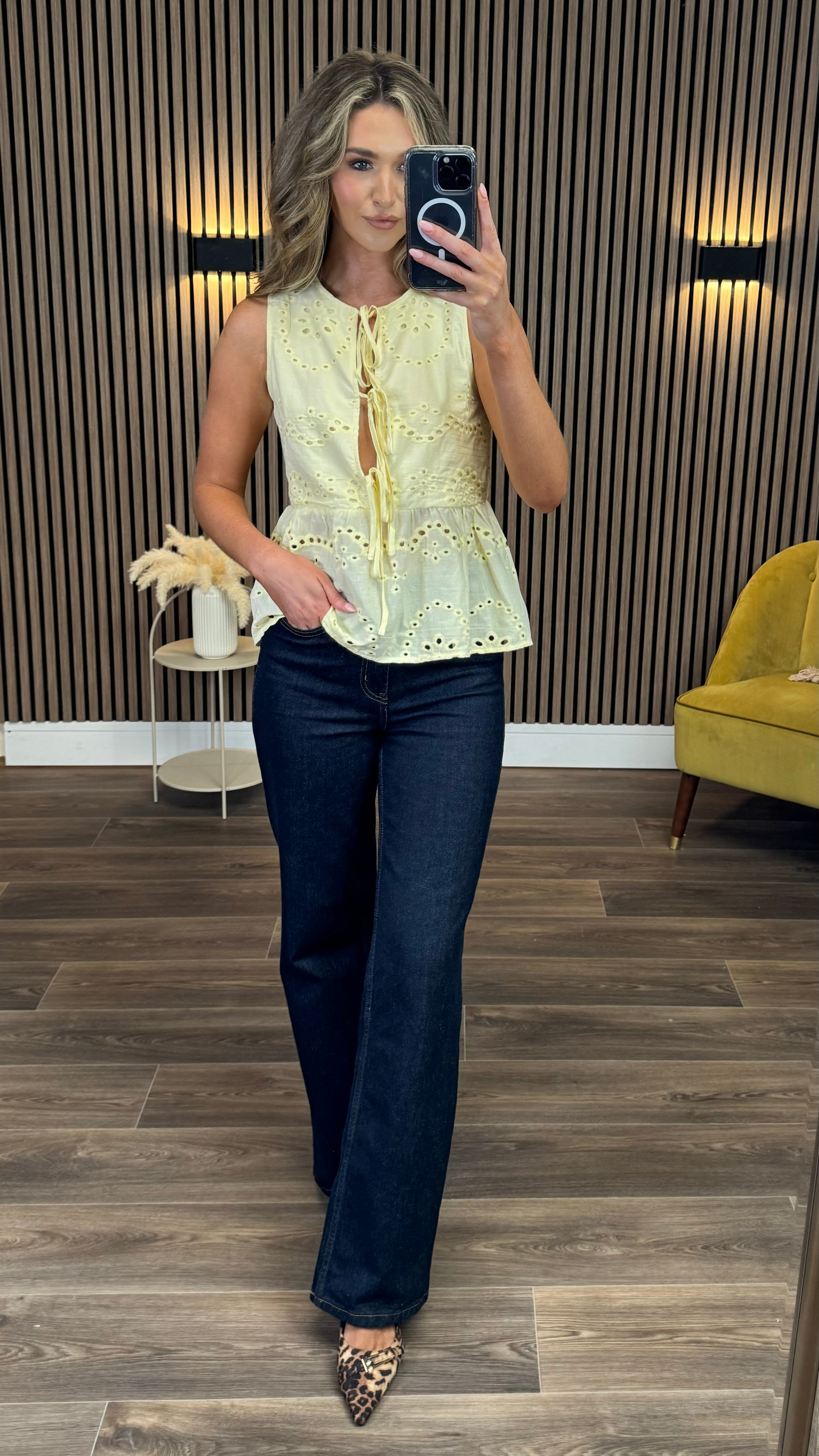 Brighten your wardrobe with this cheerful yellow peplum top! The playful tie detail adds a fun twist to this versatile piece. Perfect for sunny days or adding a pop of color to your outfit. Easy to style and sure to turn heads!