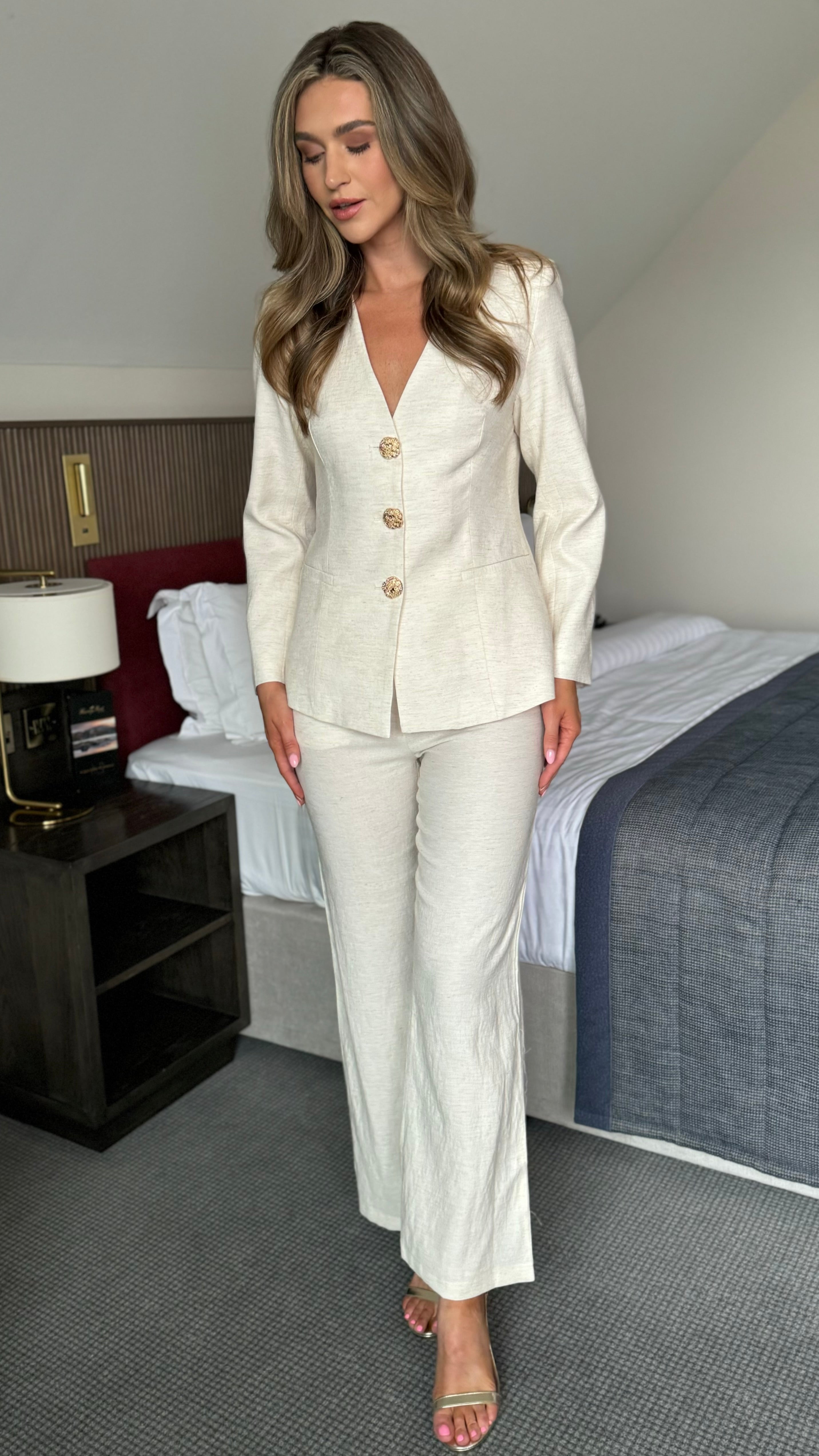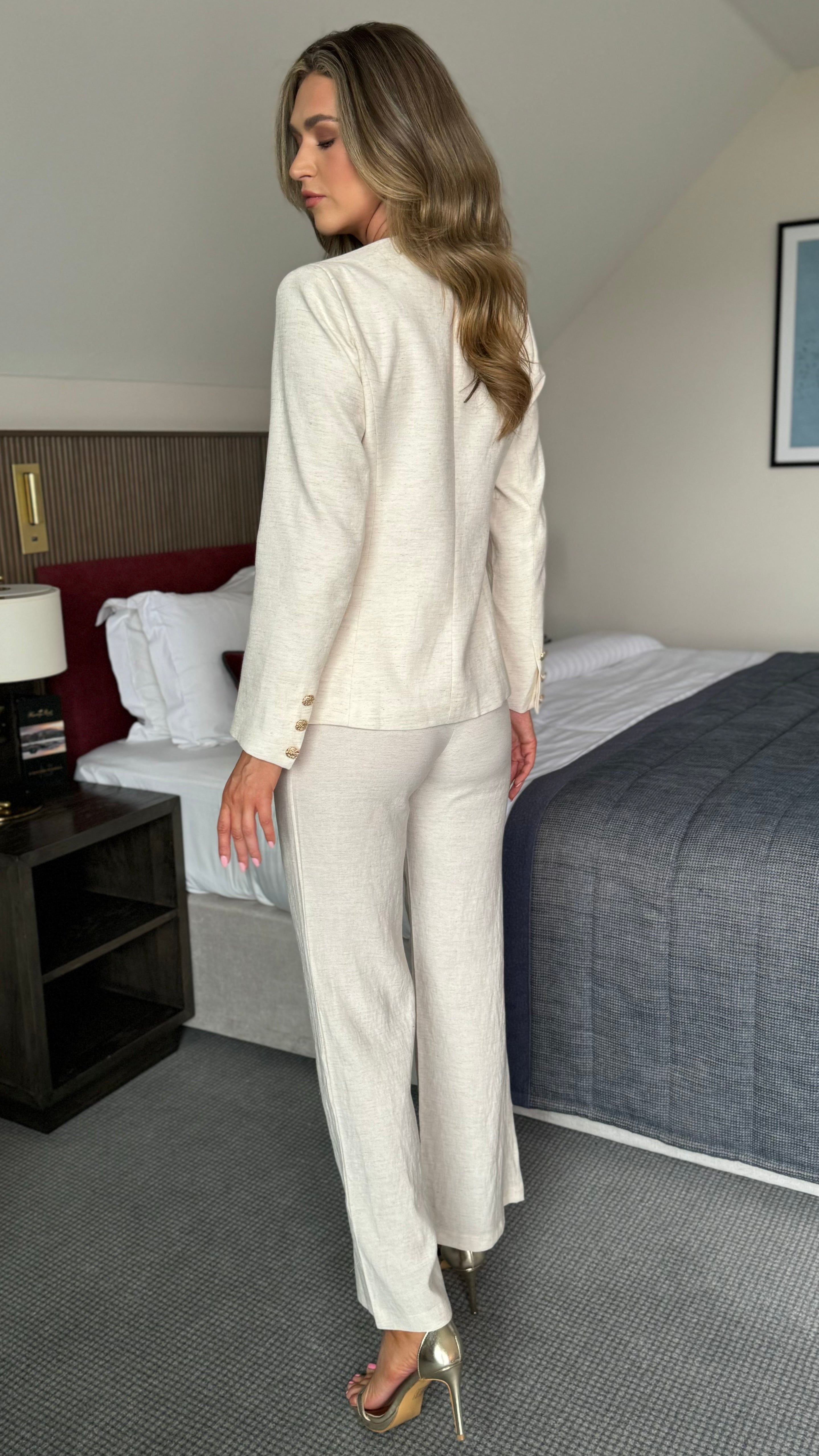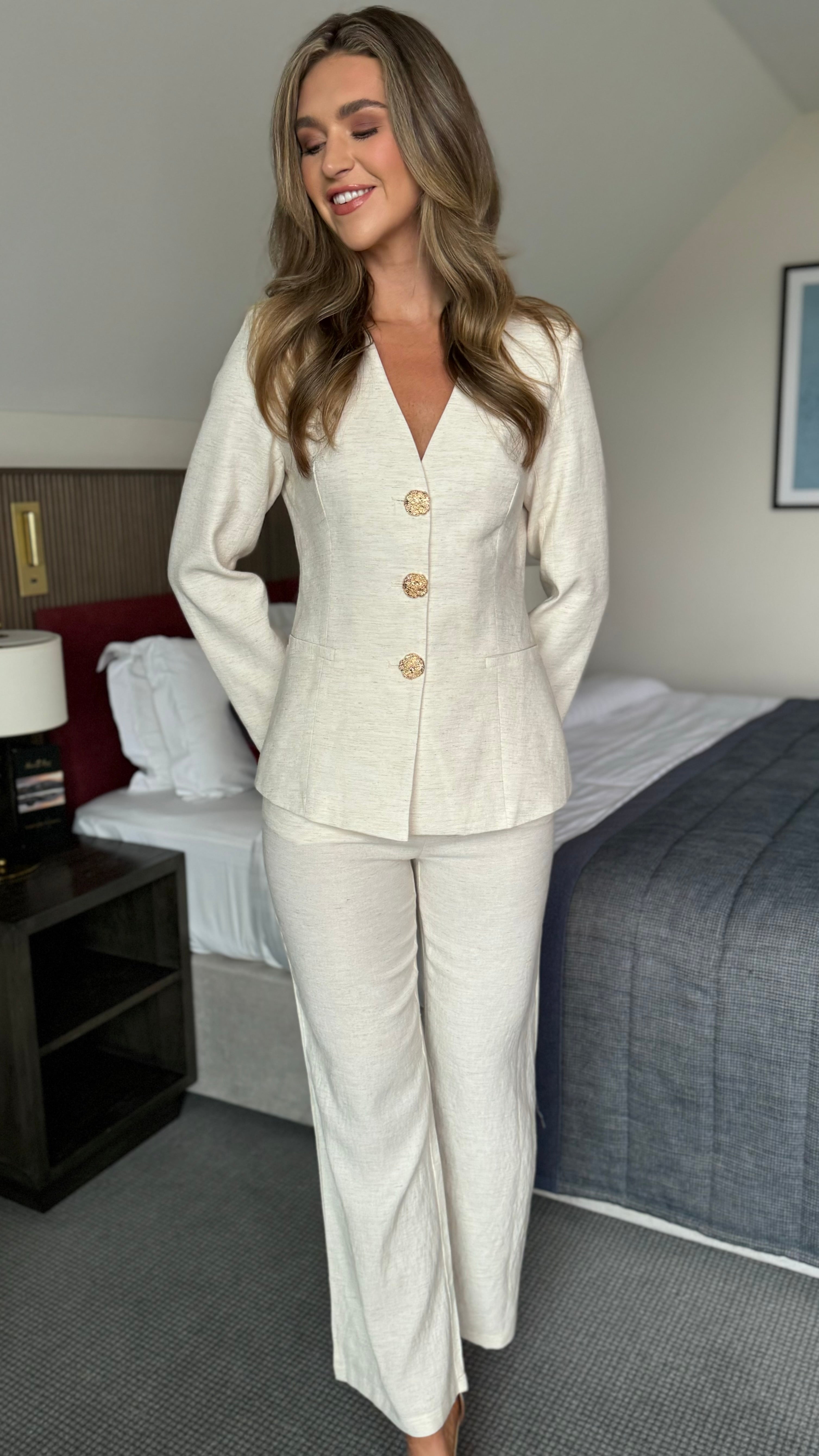 Shia Beige Collarless Gold Button Blazer & Straight Leg Trouser Co-ord