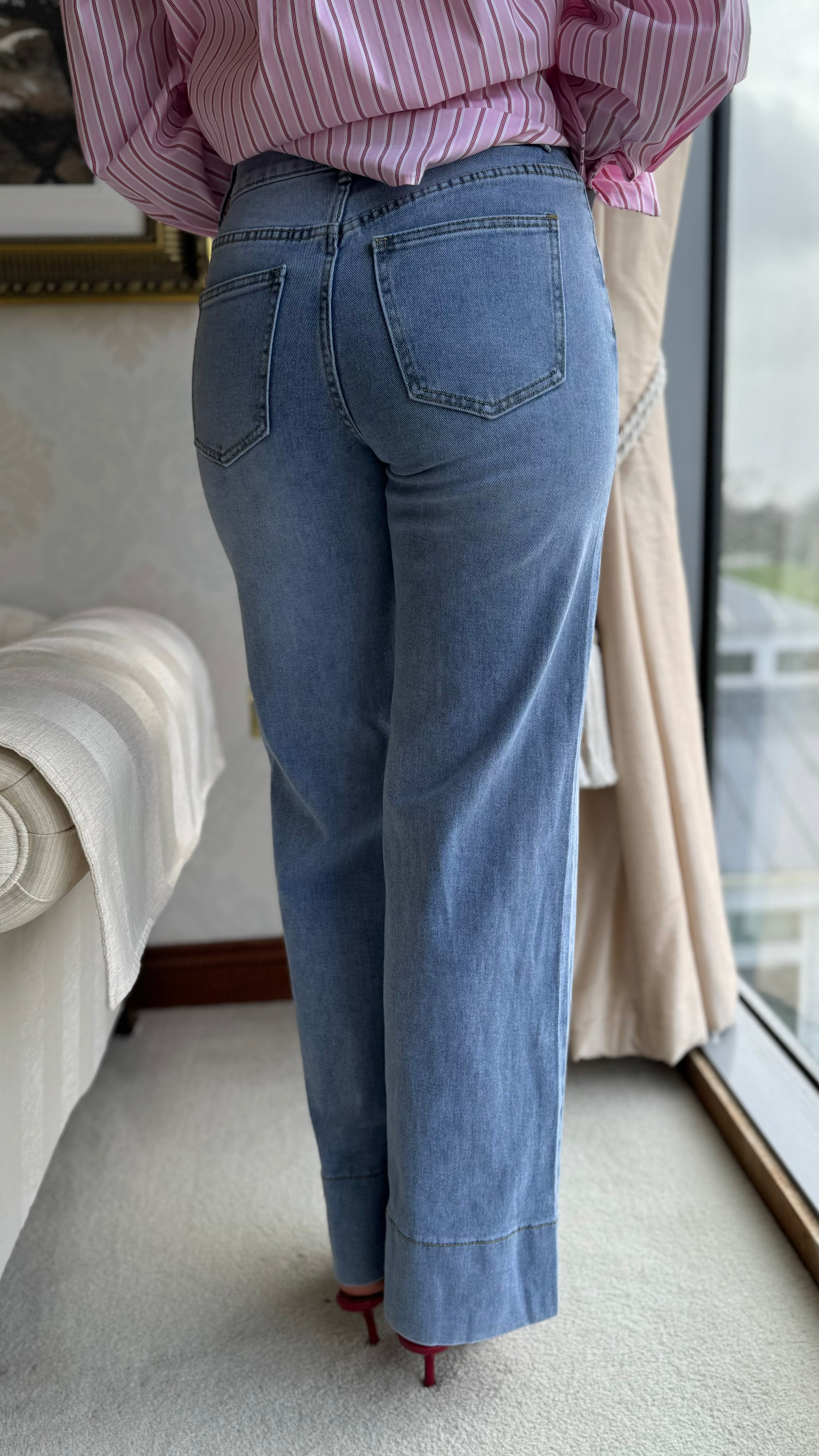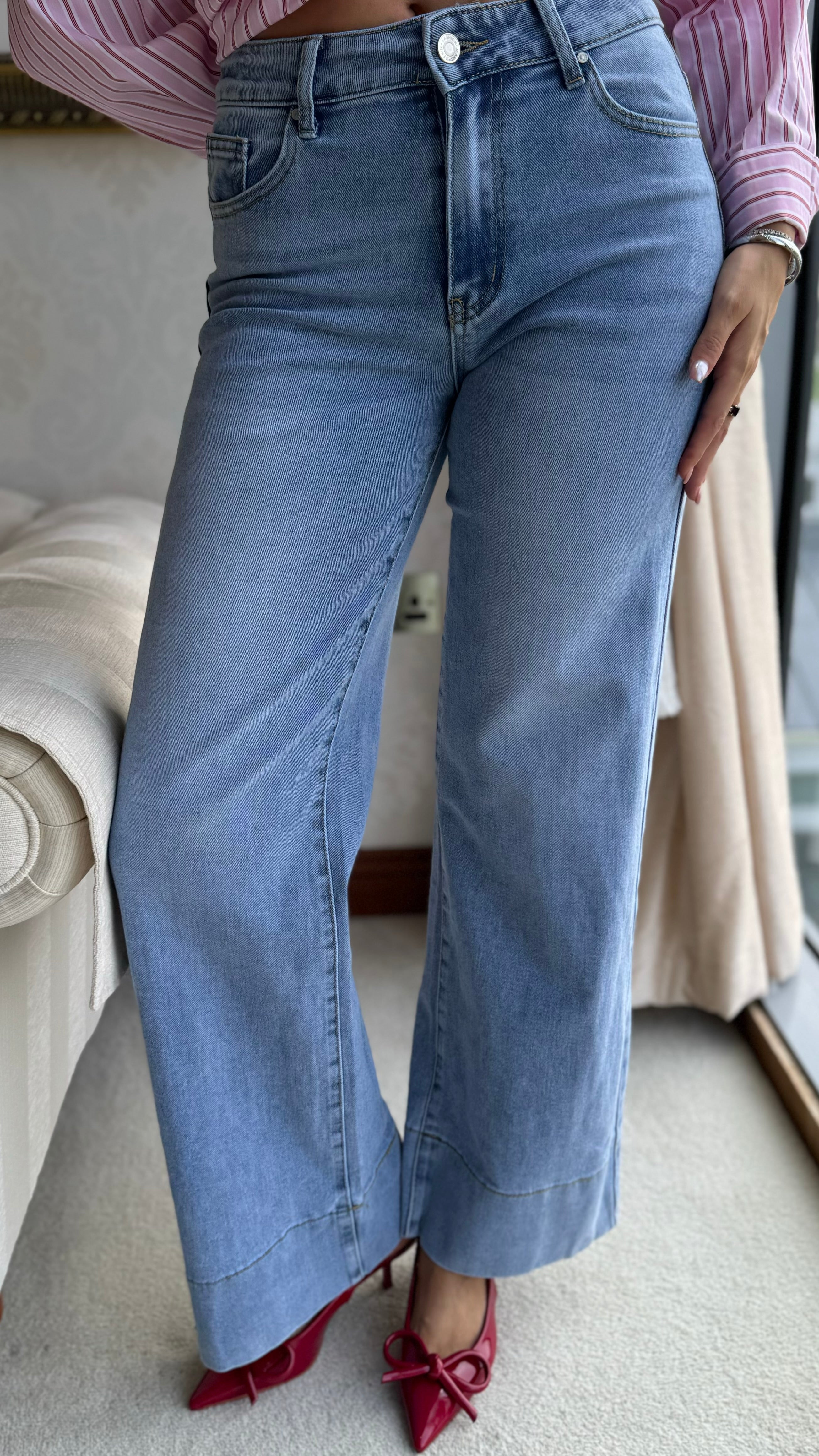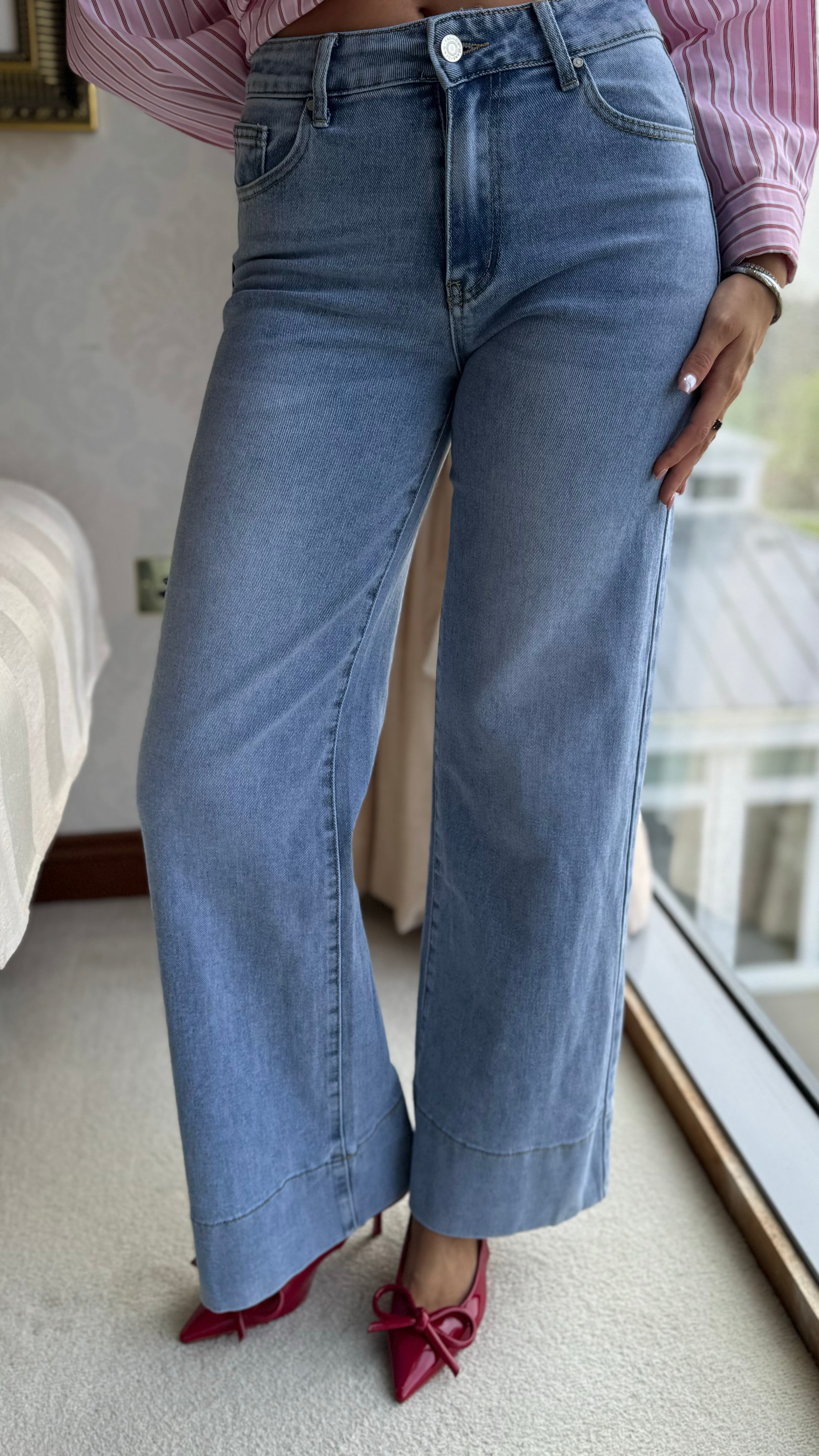 Add some flare to your wardrobe with Maleah Light Blue Wide Leg Jeans! Featuring a stitched turn up detail for a unique touch, these jeans are perfect for a casual yet stylish look. Dress them up or down for all-day comfort and style.