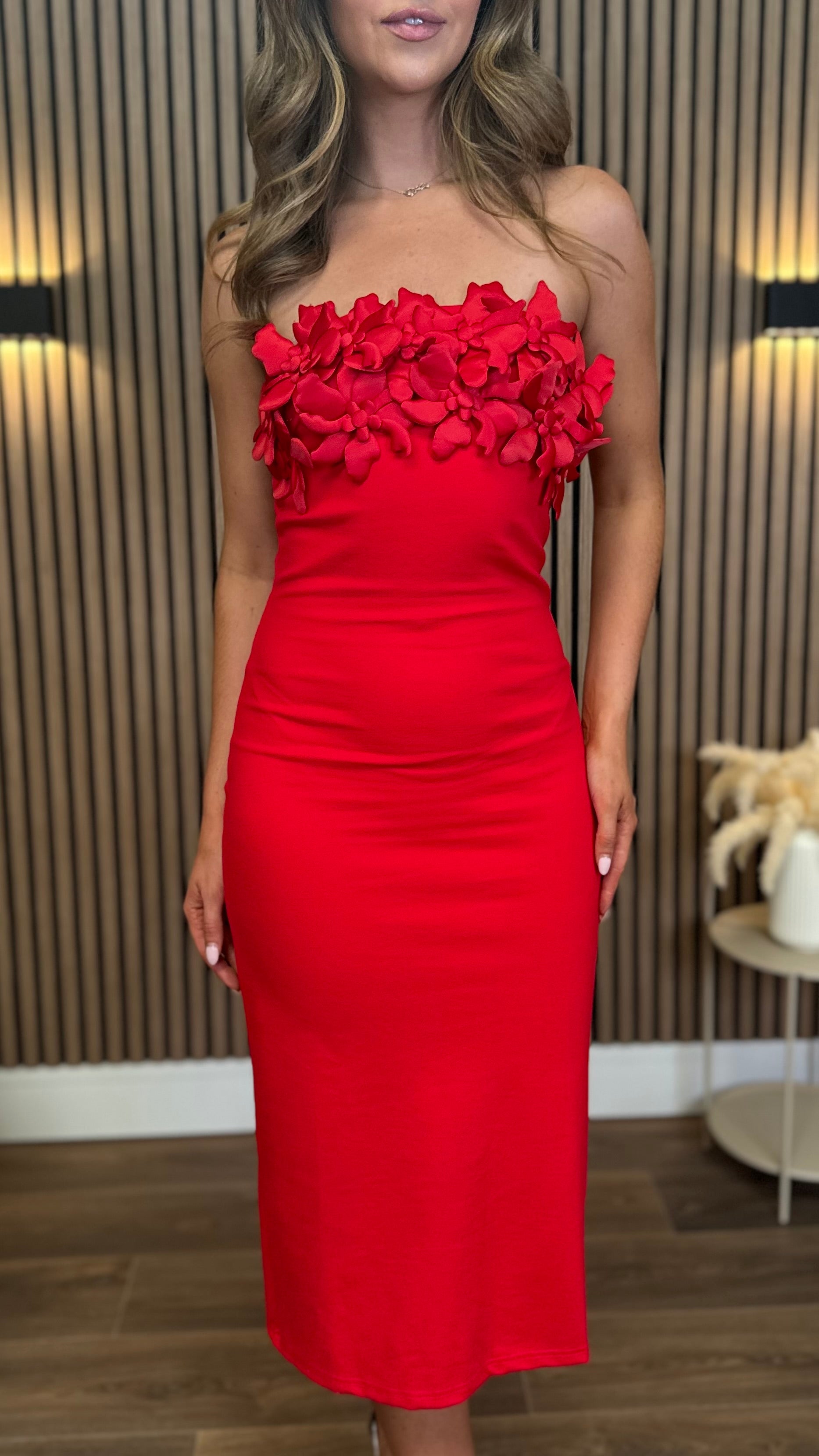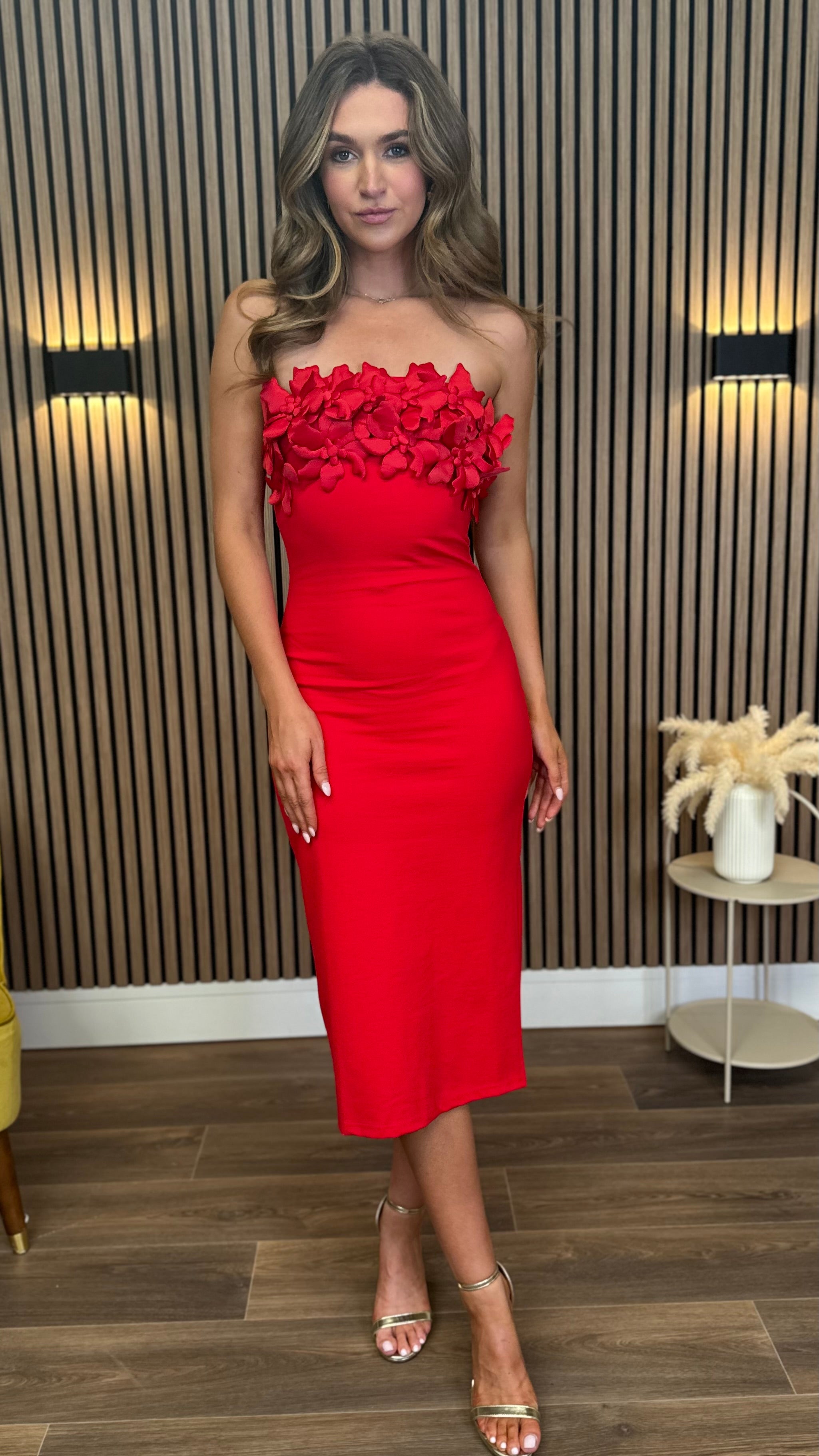 Dixie Red 3D Floral Detail Strapless Midi Dress