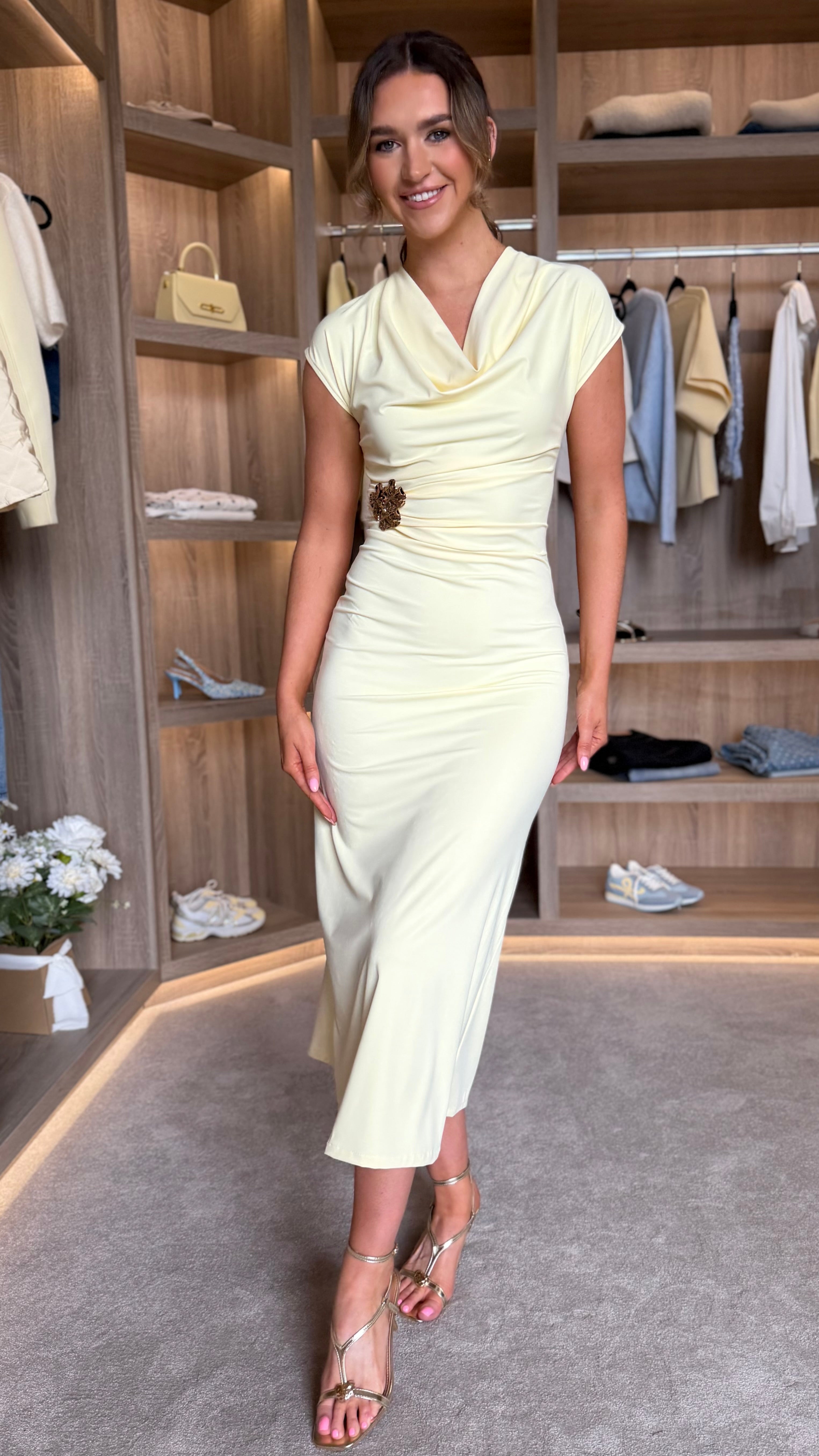 Effortless elegance meets everyday comfort in this off-shoulder midaxi dress. Crafted from soft, stretchy fabric that moves with you, it features a flattering ruched silhouette and a delicate gold brooch detail at the neckline. The draped design creates a refined, contemporary look perfect for both casual outings and special occasions. Yellow hue adds a sophisticated touch to any wardrobe.