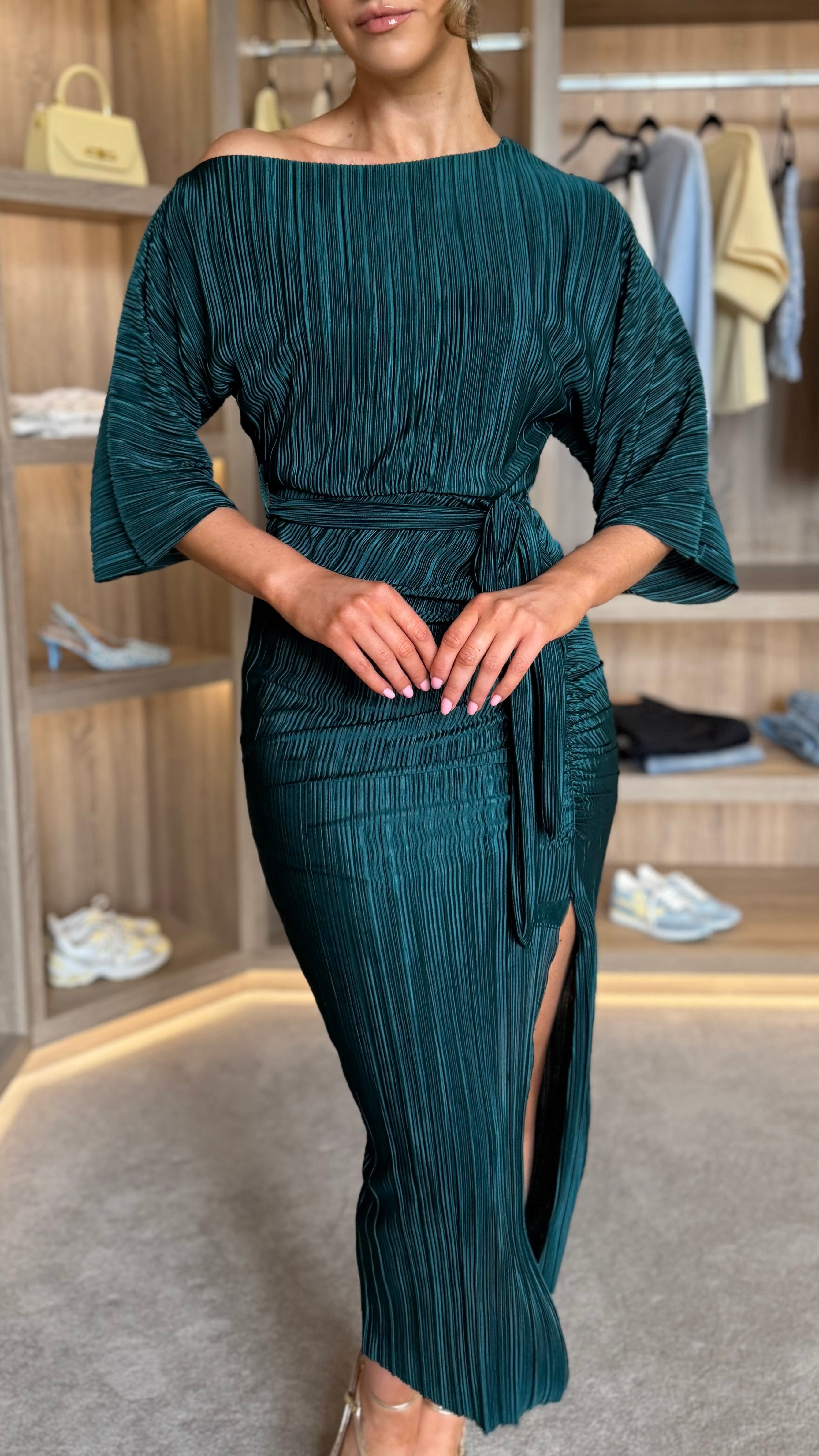 Slip into effortless elegance with this stunning dark green off-shoulder dress. Crafted from luxuriously soft plissé fabric that drapes beautifully, it features a chic belted waist to define your silhouette and a flirty slit detail for movement and style. Whether you're dressing up for a night out or making a statement at an event, this dress delivers that perfect blend of glamour and comfort.