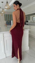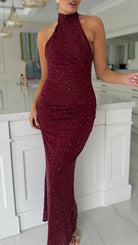 Zelda Burgundy Sparkle Halter Neck Maxi Dress